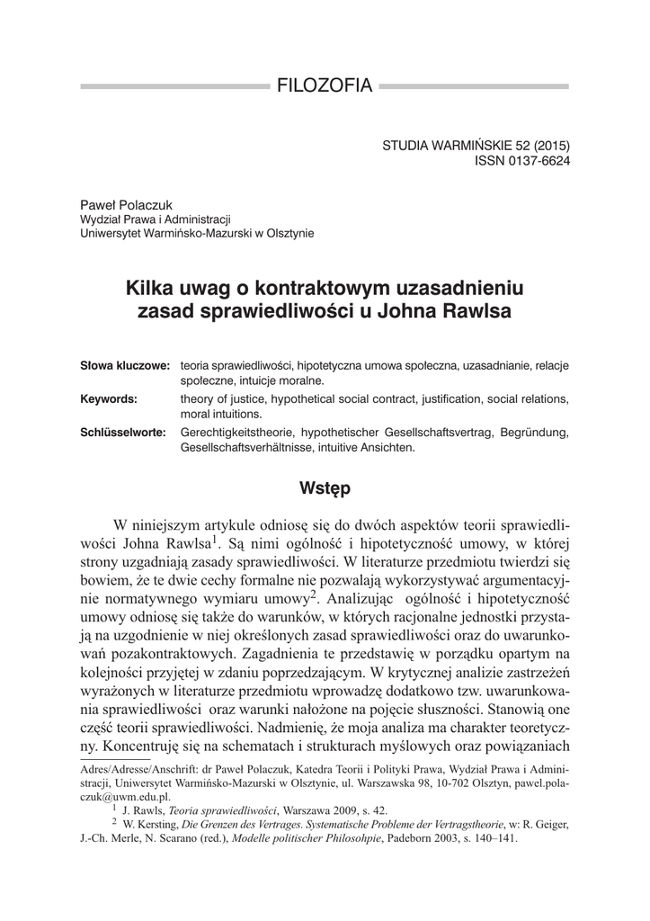 FILOZOFIA STUDIA WARMIŃSKIE 52 (2015) ISSN 0137-6624 Paweł Polaczuk Wydział Prawa i Administracji Uniwersytet Warmińsko-Mazurski w Olsztynie Kilka uwag o kontraktowym uzasadnieniu zasad sprawiedliwości u Johna Rawlsa Słowa kluczowe: teoria sprawiedliwości, hipotetyczna umowa społeczna, uzasadnianie, relacje społeczne, intuicje moralne. Keywords: theory of justice, hypothetical social contract, justification, social relations, moral intuitions. Schlüsselworte: Gerechtigkeitstheorie, hypothetischer Gesellschaftsvertrag, Begründung, Gesellschaftsverhältnisse, intuitive Ansichten. Wstęp W niniejszym artykule odniosê siê do dwóch aspektów teorii sprawiedliwoci Johna Rawlsa1. S¹ nimi ogólnoæ i hipotetycznoæ umowy, w której strony uzgadniaj¹ zasady sprawiedliwoci. W literaturze przedmiotu twierdzi siê bowiem, ¿e te dwie cechy formalne nie pozwalaj¹ wykorzystywaæ argumentacyjnie normatywnego wymiaru umowy2. Analizuj¹c ogólnoæ i hipotetycznoæ umowy odniosê siê tak¿e do warunków, w których racjonalne jednostki przystaj¹ na uzgodnienie w niej okrelonych zasad sprawiedliwoci oraz do uwarunkowañ pozakontraktowych. Zagadnienia te przedstawiê w porz¹dku opartym na kolejnoci przyjêtej w zdaniu poprzedzaj¹cym. W krytycznej analizie zastrze¿eñ wyra¿onych w literaturze przedmiotu wprowadzê dodatkowo tzw. uwarunkowania sprawiedliwoci oraz warunki na³o¿one na pojêcie s³usznoci. Stanowi¹ one czêæ teorii sprawiedliwoci. Nadmieniê, ¿e moja analiza ma charakter teoretyczny. Koncentrujê siê na schematach i strukturach mylowych oraz powi¹zaniach Adres/Adresse/Anschrift: dr Pawe³ Polaczuk, Katedra Teorii i Polityki Prawa, Wydzia³ Prawa i Administracji, Uniwersytet Warmiñsko-Mazurski w Olsztynie, ul. Warszawska 98, 10-702 Olsztyn, [email protected]. 1 J. Rawls, Teoria sprawiedliwoci, Warszawa 2009, s. 42. 2 W. Kersting, Die Grenzen des Vertrages. Systematische Probleme der Vertragstheorie, w: R. Geiger, J.-Ch. Merle, N. Scarano (red.), Modelle politischer Philosohpie, Padeborn 2003, s. 140141. 38 Paweł Polaczuk Filozofia miêdzy poszczególnymi elementami teorii sprawiedliwoci. Znaczenia poszczególnych pojêæ rekonstruujê z rozwa¿añ J. Rawlsa. Tytu³em wstêpu przypomnê, ¿e ogólnoæ i hipotetycznoæ oraz warunki umowy wystêpuj¹ w modelu uzasadnienia przyjmowanego w teorii umowy spo³ecznej3. Idea umowy spo³ecznej, któr¹ zawieraj¹ racjonalne jednostki, jest równie¿ g³ówn¹ ide¹ teorii sprawiedliwoci J. Rawlsa. Wspomnian¹ umowê zawieraj¹ tu istoty racjonalne, umiejscowione w warunkach niewiedzy o ich rzeczywistej sytuacji ¿yciowej. Jest to sytuacja hipotetyczna, w której strony wysuwaj¹ propozycje okrelonych zasad sprawiedliwoci i porozumiewaj¹ siê co do ich wyboru. Brak wiedzy o ich rzeczywistej sytuacji ¿yciowej sk³ania je do przyjêcia zasad, które s¹ przedmiotem teorii sprawiedliwoci. Porozumienie bêdzie wi¹za³o jednostki, które je zawar³y. Dziêki temu uzgodnione w tych warunkach i formie zasady sprawiedliwoci mia³by obowi¹zywaæ w porz¹dku spo³ecznym po zawarciu porozumienia, kiedy stronom umowy stan¹ siê wiadome ich rzeczywiste pozycje spo³eczne i zdeterminowane nimi przekonania o sprawiedliwoci. Porozumienie dotycz¹ce zasad sprawiedliwoci jest przy tym ogólne. Dotyczy bowiem zasad sprawiedliwoci przyjmowanych jako fundament porz¹dku spo³ecznego, nie poszczególnych instytucji. Ma byæ wszak podstaw¹ rekonstrukcji ci¹gu porozumieñ zawieranych dla poszczególnych instytucji. Jest przez to umow¹ o wysokim poziomie hipotetycznoci4. 3 Na marginesie warto odnotowaæ kilka uwag dotycz¹cych przynale¿noci koncepcji Rawlsa do nurtu teorii umowy spo³ecznej. Najczêciej przywo³ywanym kryterium przyporz¹dkowania jest schemat uzasadnienia zasad sprawiedliwoci pomylanych dla podstawowej struktury spo³ecznej. Chodzi zatem o procedurê, w toku której dokonuje siê uzgodnieñ dotycz¹cych treci zasad sprawiedliwoci. Szersze ujêcie tego kryterium obejmuje twierdzenie, ¿e przynale¿noæ do nurtu umowy spo³ecznej potwierdza wiod¹ca myl koncepcji sprawiedliwoci, zgodnie z któr¹ instytucje polityczne bêd¹ uchodziæ za sprawiedliwe i zas³ugiwaæ na uznanie, o ile zostan¹ ukszta³towane zgodnie z zamys³em racjonalnie dzia³aj¹cych obywateli, powziêtym w hipotetycznych i rozumnych warunkach umownych. W literaturze przedmiotu wskazuje siê na jeszcze jedno, dodatkowe czy uzupe³niaj¹ce kryterium. Oto stwierdza siê, ¿e przynale¿noæ do nurtu teorii umowy spo³ecznej wyznacza tak¿e przekonanie, zgodnie z którym teoria sprawiedliwoci politycznej musi byæ nonikiem liberalizmu politycznego. Przy czym co niezwykle istotne winna ona odwo³ywaæ siê do tradycji historycznej nowo¿ytnych demokracji konstytucyjnych i nie mo¿e zawieraæ ani wyra¿aæ przes³anek odnosz¹cych siê do aktywnoci obywateli poza sfer¹ przestrzeni politycznej. Wspominam o tym, by nie budzi³o w¹tpliwoci, ¿e nie ka¿da teoria powielaj¹ca wspomniany schemat argumentacyjny musi byæ nonikiem wartoci politycznych liberalizmu. Czy okrelona teoria umowy spo³ecznej zostanie zaliczona do tradycji historycznej nowo¿ytnych demokracji konstytucyjnych jest nader z³o¿on¹ kwesti¹ i zale¿n¹ od przyjêtej perspektywy. Dla niektórych badaczy kluczowe znaczenie mieæ bêd¹ prawa i wolnoci, dla innych rz¹dy wiêkszoci, a pozosta³ych rz¹dy prawa. Zob. szerzej: Th.M. Besch, Über John Rawls politischen Liberalismus. Zur Rolle des Vernünftigen in Rawls Begründung einer politischen Gerechtigkeitstheorie, Frankfurt am Main 1998, s. 9 oraz P. Rinderle, Politische Vernunft. Ihre Struktur und Dynamik, Freiburg/München 1998, s. 2534. 4 Zob. tak¿e P. Polaczuk, Teoria sprawiedliwoci Johna Rawlsa (zarys), w: B. Kruszewska, P. Polaczuk, L. wito (red.), Sprawiedliwoæ. Wybrane koncepcje, Olsztyn 2010, s. 6186; P. Polaczuk, Sytuacja pocz¹tkowa, w: Sprawiedliwoæ. Wybrane , s. 87104; P. Polaczuk, O podstawowych problemach z umownym uzasadniani