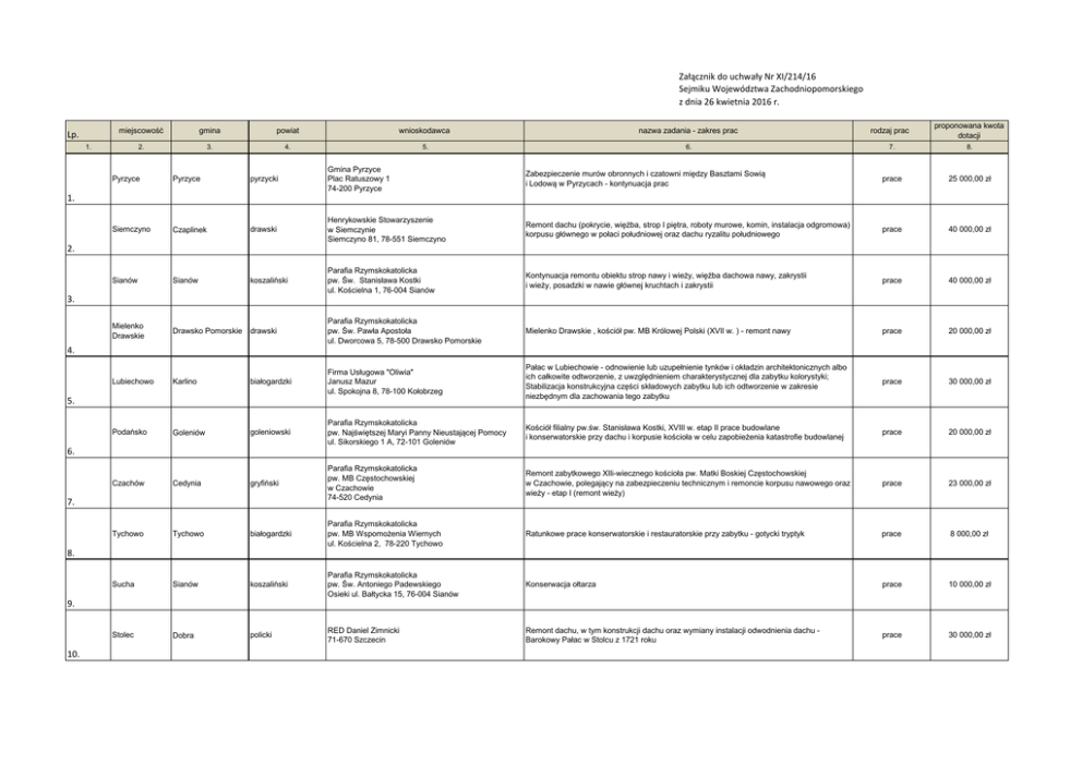 Załącznik do uchwały Nr XI/214/16 Sejmiku Województwa Zachodniopomorskiego z dnia 26 kwietnia 2016 r. Lp. miejscowość gmina powiat wnioskodawca nazwa zadania - zakres prac 2. 3. 4. 5. 6. 1. rodzaj prac proponowana kwota dotacji 7. 8. Pyrzyce Pyrzyce pyrzycki Gmina Pyrzyce Plac Ratuszowy 1 74-200 Pyrzyce Zabezpieczenie murów obronnych i czatowni między Basztami Sowią i Lodową w Pyrzycach - kontynuacja prac prace 25 000,00 zł Siemczyno Czaplinek drawski Henrykowskie Stowarzyszenie w Siemczynie Siemczyno 81, 78-551 Siemczyno Remont dachu (pokrycie, więźba, strop I piętra, roboty murowe, komin, instalacja odgromowa) korpusu głównego w połaci południowej oraz dachu ryzalitu południowego prace 40 000,00 zł Sianów Sianów koszaliński Parafia Rzymskokatolicka pw. Św. Stanisława Kostki ul. Kościelna 1, 76-004 Sianów Kontynuacja remontu obiektu strop nawy i wieży, więźba dachowa nawy, zakrystii i wieży, posadzki w nawie głównej kruchtach i zakrystii prace 40 000,00 zł Mielenko Drawskie Drawsko Pomorskie drawski Parafia Rzymskokatolicka pw. Św. Pawła Apostoła ul. Dworcowa 5, 78-500 Drawsko Pomorskie Mielenko Drawskie , kościół pw. MB Królowej Polski (XVII w. ) - remont nawy prace 20 000,00 zł Lubiechowo Karlino białogardzki Firma Usługowa "Oliwia" Janusz Mazur ul. Spokojna 8, 78-100 Kołobrzeg Pałac w Lubiechowie - odnowienie lub uzupełnienie tynków i okładzin architektonicznych albo ich całkowite odtworzenie, z uwzględnieniem charakterystycznej dla zabytku kolorystyki; Stabilizacja konstrukcyjna części składowych zabytku lub ich odtworzenie w zakresie niezbędnym dla zachowania tego zabytku prace 30 000,00 zł Podańsko Goleniów goleniowski Parafia Rzymskokatolicka pw. Najświętszej Maryi Panny Nieustającej Pomocy ul. Sikorskiego 1 A, 72-101 Goleniów Kościół filialny pw.św. Stanisława Kostki, XVIII w. etap II prace budowlane i konserwatorskie przy dachu i korpusie kościoła w celu zapobieżenia katastrofie budowlanej prace 20 000,00 zł Czachów Cedynia gryfiński Parafia Rzymskokatolicka pw. MB Częstochowskiej w Czachowie 74-520 Cedynia Remont zabytkowego XIIi-wiecznego kościoła pw. Matki Boskiej Częstochowskiej w Czachowie, polegający na zabezpieczeniu technicznym i remoncie korpusu nawowego oraz wieży - etap I (remont wieży) prace 23 000,00 zł Tychowo Tychowo białogardzki Parafia Rzymskokatolicka pw. MB Wspomożenia Wiernych ul. Kościelna 2, 78-220 Tychowo Ratunkowe prace konserwatorskie i restauratorskie przy zabytku - gotycki tryptyk prace 8 000,00 zł Sucha Sianów koszaliński Parafia Rzymskokatolicka pw. Św. Antoniego Padewskiego Osieki ul. Bałtycka 15, 76-004 Sianów Konserwacja ołtarza prace 10 000,00 zł Stolec Dobra policki RED Daniel Zimnicki 71-670 Szczecin Remont dachu, w tym konstrukcji dachu oraz wymiany instalacji odwodnienia dachu Barokowy Pałac w Stolcu z 1721 roku prace 30 000,00 zł 1. 2. 3. 4. 5. 6. 7. 8. 9. 10. Wspólnota Mieszkaniowa Nieruchomości przy ul. Koszalińska 94, ul. Wojska Polskiego 1 78-230 Karlino Izolacja cieplna ścian zewnętrznych oraz remont zabytkowej elewacji z wymianą stolarki okiennej prace 30 000,00 zł Rzymskokatolicka Parafia św. Mikołaja ul. Papieża Jana XXIII 13, 78-600 Wałcz Wykonanie prac konserwatorskich przy elewacji kościoła parafialnego pw. Św. Mikołaja w Wałczu - etap IV elewacja północna prace 15 000,00 zł Gmina Myślibórz ul. Rynek im. Jana Pawła II 74-300 Myślibórz Remont i konserwacja obwarowań miejskich w Myśliborzu przy ul. Wałowej, Wieżowej, Pomorskiej, Wyszyńskiego, 11 Listopada, na działkach o nr ewid. Grunt 568, 77/1, 63, 55, 56, 45/2 obręb 2 m. Myślibórz - Etap I Baszta Prochowa dz. Nr ewid. 77/1 obręb 2 m. Myślibórz. prace 15 000,00 zł Trzebiatowski Ośrodek Kultury ul. Wojska Polskiego 67 72-320 Trzebiatów Odtworzenie historycznej stolarki okiennej zamku w Trzebiatowie - elewacja zachodnia skrzydła głównego (wschodniego) prace 30 000,00 zł Gmina Banie ul. Skośna 6 74-110 Banie Wykonanie programu prac konserwatorskich dla potrzeb kompleksowego remontu Zamku w Swobnicy dokumentacja 20 000,00 zł Kościół pw. Św. Marii Magdaleny w Przytoniu - remont kościoła - etap III prace 20 000,00 zł Karolina Maria Gołębiowska Zespół pałacowo-parkowy w Sitnie , XVIII w. - odsłonięcie i renowacja zachowanych dekoracji malarskich i sztukatorskich - etap II prace 10 000,00 zł stargardzki Rarytas sp. z o.o. ul. Piłsudskiego 63 73-110 Stargard Wymiana poszycia dachowego wraz z niezbędnymi pracami towarzyszącymi temu przedsięwzięciu w zabytkowym XIII wiecznym zamku w Pęzinie prace 10 000,00 zł Tychowo białogardzki Parafia Rzymskokatolicka pw. MB Wspomożenia Wiernych ul. Kościelna 2 78-220 Tychowo Kompleksowy remont kościoła, wzmocnienie fundamentów, montaż instalacji SAP i SSWN - III etap końcowy prace 10 000,00 zł Niepołcko Barlinek myśliborski Stowarzyszenie na Rzecz Ochrony Dziedzictwa "Młyn Papiernia" Dwór ryglowy z początku XVIII wieku - IV etap wykonania remontu ul. Borówkowo 10 i ustabilizowania konstrukcji dworu 71-034 Szczecin prace 30 000,00 zł Trzebiatów Trzebiatów gryficki Parafia Prawosławna pw. Świętego Ducha 72-320 Trzebiatów Prace budowlano-konserwatorskie przy I etapie rewaloryzacji zabytkowej kaplicy pw. Św. Ducha, XV w. remont więźby dachowej z wymianą pokrycia dachu oraz wykonanie odwodnienia budynku prace 20 000,00 zł Kamień Pomorski Kamień Pomorski kamieński Rzymskokatolicka Parafia pw. Św. Ottona Plac Katedralny 8 72-400 Kamień Pomorski Prace konserwatorskie i restauratorskie Ołtarza Najświętszej Marii Panny Katedry pw. Św. Jana Chrzciciela w Kamieniu Pomorskim - etap II prace 20 000,00 zł Karlino Karlino białogardzki Wałcz Wałcz wałecki Myślibórz Myślibórz myśliborski Trzebiatów Trzebiatów gryficki Swobnica Banie gryfiński Przytoń Węgorzyno łobeski Parafia Rzymskokatolicka pw. Wniebowzięcia NMP ul. Grunwaldzka 19 73-155 Węgorzyno Sitno Myś