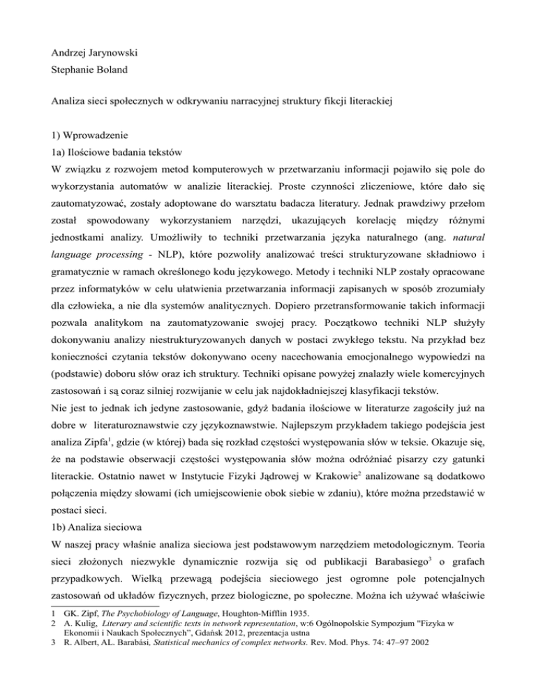 Andrzej Jarynowski Stephanie Boland Analiza sieci społecznych w odkrywaniu narracyjnej struktury fikcji literackiej 1) Wprowadzenie 1a) Ilościowe badania tekstów W związku z rozwojem metod komputerowych w przetwarzaniu informacji pojawiło się pole do wykorzystania automatów w analizie literackiej. Proste czynności zliczeniowe, które dało się zautomatyzować, zostały adoptowane do warsztatu badacza literatury. Jednak prawdziwy przełom został spowodowany wykorzystaniem narzędzi, ukazujących korelację między różnymi jednostkami analizy. Umożliwiły to techniki przetwarzania języka naturalnego (ang. natural language processing - NLP), które pozwoliły analizować treści strukturyzowane składniowo i gramatycznie w ramach określonego kodu językowego. Metody i techniki NLP zostały opracowane przez informatyków w celu ułatwienia przetwarzania informacji zapisanych w sposób zrozumiały dla człowieka, a nie dla systemów analitycznych. Dopiero przetransformowanie takich informacji pozwala analitykom na zautomatyzowanie swojej pracy. Początkowo techniki NLP służyły dokonywaniu analizy niestrukturyzowanych danych w postaci zwykłego tekstu. Na przykład bez konieczności czytania tekstów dokonywano oceny nacechowania emocjonalnego wypowiedzi na (podstawie) doboru słów oraz ich struktury. Techniki opisane powyżej znalazły wiele komercyjnych zastosowań i są coraz silniej rozwijanie w celu jak najdokładniejszej klasyfikacji tekstów. Nie jest to jednak ich jedyne zastosowanie, gdyż badania ilościowe w literaturze zagościły już na dobre w literaturoznawstwie czy językoznawstwie. Najlepszym przykładem takiego podejścia jest analiza Zipfa1, gdzie (w której) bada się rozkład częstości występowania słów w teksie. Okazuje się, że na podstawie obserwacji częstości występowania słów można odróżniać pisarzy czy gatunki literackie. Ostatnio nawet w Instytucie Fizyki Jądrowej w Krakowie2 analizowane są dodatkowo połączenia między słowami (ich umiejscowienie obok siebie w zdaniu), które można przedstawić w postaci sieci. 1b) Analiza sieciowa W naszej pracy właśnie analiza sieciowa jest podstawowym narzędziem metodologicznym. Teoria sieci złożonych niezwykle dynamicznie rozwija się od publikacji Barabasiego3 o grafach przypadkowych. Wielką przewagą podejścia sieciowego jest ogromne pole potencjalnych zastosowań od układów fizycznych, przez biologiczne, po społeczne. Można ich używać właściwie 1 GK. Zipf, The Psychobiology of Language, Houghton-Mifflin 1935. 2 A. Kulig, Literary and scientific texts in network representation, w:6 Ogólnopolskie Sympozjum "Fizyka w Ekonomii i Naukach Społecznych”, Gdańsk 2012, prezentacja ustna 3 R. Albert, AL. Barabási, Statistical mechanics of complex networks. Rev. Mod. Phys. 74: 47–97 2002 wszędzie, gdzie istnieją zależności między elementami. W międzyczasie na pograniczu nauk ścisłych oraz społecznych wyodrębniła się nowa technika badawcza: analiza sieci społecznych (ang. social network analysis- SNA). Struktura powiązań między ludźmi decyduje o wielu czynnikach takich, jak przepływ informacji lub stosunek władzy. Położenie jednostki w sieci również warunkuje wiele cech, jak choćby pozycja społeczna. W ramach teorii SNA wyróżniamy sieci binarne (połączenie między elementami istnieje, bądź nie) oraz ważone (połączenia mogą mieć różne wagi, odzwierciedlające różne poziomy intensywności interakcji). W naszym przypadku intensywność relacji będzie miała znaczenie w celu dokładniejszego opisu. Ponadto znamy sieci skierowane (połączenie między elementami ma ustalony kierunek) oraz nieskierowane (połączenia są bez kierunku, a notowana jest tylko relacja wzajemności). 1c) Percepcja sieci w literaturze Wiedząc, jak ważne są sieci społeczne w rzeczywistym świecie, warto podjąć się oceny roli takiej sieci między bohaterami w świecie fikcyjnym. Najpierw należy zatrzymać się na samym procesie percepcji sieci oczami czytelnika postawionego przed konstruktem narracyjnym utworzonym przez autora. Niniejsza praca dotyka właśnie tematu postrzegania sieci w różnych kontekstach czytelniczych w porównaniu z komputerowymi metodami automatycznej detekcji. Prowadzone przez nas rozważania są badaniami eksploracyjnymi. Wedle naszej wiedzy, nikt wcześniej nie analizował sieci społecznych w literaturze pod kątem percepcji. Dlatego też, skoncentrowaliśmy się na interpretacji sieci społecznych, odczytywanych subiektywnie przez czytelnika, napominając tylko o innych kontekstach, które w przyszłości powinny zostać przebadane. 1d) Ekstrakcja sieci Warto jednak umiejscowić nasze badania w szerszym kontekście dotychczasowej wiedzy na temat sieci społecznych w literaturze. Prym w tej dziedzinie wiodą trzy amerykańskie ośrodki: grupa NLP z Uniwersytetu Columbia w Nowym Jorku, „Literary Lab” z Uniwersytetu Stanford w Kaliforni, oraz grupa „Google Books” z Uniwersytetu Harwarda w Bostonie. Tego typu badania zaliczają się do cyfrowej humanistyki (ang. digital humanities). Każdy z tych zespołów skupił się na trochę innym aspekcie, niemniej jednak wspólnym mianownikiem było skoncentrowanie się na automatycznej ekstrakcji sieci. Pierwsze prace dotyczyły analizy utworów dramatycznych, gdzie połączeniem między bohaterami (postaciami) była ich obecność w tej samej scenie. Franco Moretti ze Stanford, koordynujący te działania, pokazał właściwości tych sieci na przykładzie dzieł Szekspira4. Później porównał je z dramatami chińskimi. Jedną z najważniejszych poczynionych obserwacji była znacząca przewaga w ilości połączeń społecznych (liczba znajomych) centralnych postaci z dzieł europejskich w porównaniu z chińskimi, gdzie postaci miały bardziej równomiernie rozłożone znajomości po społeczności. Naukowcy z Harvardu, wśród których jest Martin Nowak5, 4 F. Moretti, Network T