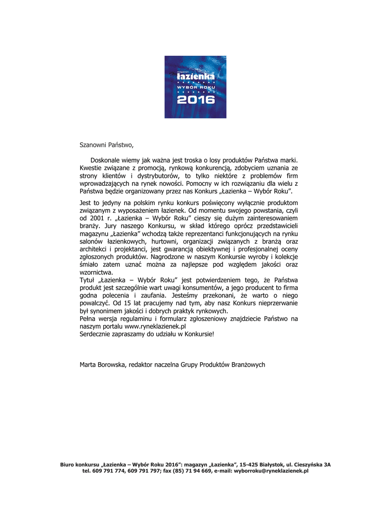 Szanowni Państwo, Doskonale wiemy jak ważna jest troska o losy produktów Państwa marki. Kwestie związane z promocją, rynkową konkurencją, zdobyciem uznania ze strony klientów i dystrybutorów, to tylko niektóre z problemów firm wprowadzających na rynek nowości. Pomocny w ich rozwiązaniu dla wielu z Państwa będzie organizowany przez nas Konkurs „Łazienka – Wybór Roku”. Jest to jedyny na polskim rynku konkurs poświęcony wyłącznie produktom związanym z wyposażeniem łazienek. Od momentu swojego powstania, czyli od 2001 r. „Łazienka – Wybór Roku” cieszy się dużym zainteresowaniem branży. Jury naszego Konkursu, w skład którego oprócz przedstawicieli magazynu „Łazienka” wchodzą także reprezentanci funkcjonujących na rynku salonów łazienkowych, hurtowni, organizacji związanych z branżą oraz architekci i projektanci, jest gwarancją obiektywnej i profesjonalnej oceny zgłoszonych produktów. Nagrodzone w naszym Konkursie wyroby i kolekcje śmiało zatem uznać można za najlepsze pod względem jakości oraz wzornictwa. Tytuł „Łazienka – Wybór Roku” jest potwierdzeniem tego, że Państwa produkt jest szczególnie wart uwagi konsumentów, a jego producent to firma godna polecenia i zaufania. Jesteśmy przekonani, że warto o niego powalczyć. Od 15 lat pracujemy nad tym, aby nasz Konkurs nieprzerwanie był synonimem jakości i dobrych praktyk rynkowych. Pełna wersja regulaminu i formularz zgłoszeniowy znajdziecie Państwo na naszym portalu www.ryneklazienek.pl Serdecznie zapraszamy do udziału w Konkursie! Marta Borowska, redaktor naczelna Grupy Produktów Branżowych Biuro konkursu „Łazienka – Wybór Roku 2016”: magazyn „Łazienka”, 15-425 Białystok, ul. Cieszyńska 3A tel. 609 791 774, 609 791 797; fax (85) 71 94 669, e-mail: [email protected] REGULAMIN KONKURSU ŁAZIENKA – WYBÓR ROKU 2016 CEL KONKURSU: – wyróżnienie oraz promocja produktów wyposażenia łazienki obecnych na polskim rynku – promowanie odpowiedzialności firm za swój wyrób na rynku – pobudzenie zainteresowania sferą łazienki jako wnętrzem estetycznym i funkcjonalnym Organizatorem konkursu „Łazienka – Wybór Roku 2016” jest magazyn branżowy „Łazienka” wydawany przez Wydawnictwo Publikator w Białymstoku. Uczestnikami konkursu mogą być wszystkie firmy działające na polskim rynku w sektorze wyposażenia łazienkowego. PRZEBIEG KONKURSU: Konkurs rozpoczyna się w styczniu 2016 r. Zainteresowane firmy mogą zgłaszać produkty do Biura konkursu „Łazienka – Wybór Roku 2016” do 5 lutego 2016 r. Wyboru produktów dokonuje jury konkursu złożone z przedstawicieli redakcji magazynu „Łazienka”, a także reprezentantów wiodących w Polsce salonów łazienkowych, hurtowni, organizacji związanych z branżą oraz architektów i projektantów. Jury ocenia produkty uwzględniając następujące kryteria: – walory wzornicze i użytkowe produktu, – jakość wykonania, – relację ceny do jakości, – nowatorstwo rozwiązań, – zgodność z obowiązującymi normami i zasadami konsumenckimi Rozstrzygniecie konkursu, ogłoszenie wyników oraz wręczenie tytułów „Łazienka – Wybór Roku 2016” nastąpi 5 kwietnia 2016 r. O dokładnym miejscu uroczystości zwycięzcy konkursu zostaną powiadomieni najpóźniej w marcu 2016 r. ZASADY KONKURSU: A. Przedmiotem konkursu są wyroby wyposażenia łazienkowego zgłaszane do konkursu w 16 kategoriach: o baterie o wyroby sanitarne z ceramiki i innych materiałów o wanny o kabiny prysznicowe o brodziki o hydromasaż i wellness o panele i zestawy prysznicowe o meble łazienkowe o całościowe aranżacje łazienek o płytki ceramiczne o akcesoria łazienkowe o grzejniki łazienkowe o wyposażenie dla niepełnosprawnych i osób 50+ o instalacje łazienkowe (systemy podtynkowe, systemy odpływowe) o chemia w łazience o wentylacja w łazience Biuro konkursu „Łazienka – Wybór Roku 2016”: magazyn „Łazienka”, 15-425 Białystok, ul. Cieszyńska 3A tel. 609 791 774, 609 791 797; fax (85) 71 94 669, e-mail: [email protected] B. Liczba produktów zgłaszanych przez Uczestnika do Konkursu jest nieograniczona . Opłata zgłoszeniowa wynosi 1.700 zł netto. W jej ramach Uczestnik może zgłosić maksymalnie trzy produkty do wybranych kategorii. Za każdy kolejny zgłaszany produkt Uczestnik zapłaci 500 zł netto. C. Do konkursu mogą być zgłoszone produkty nowe, tzn. takie, które są na rynku nie dłużej niż ok. 1,5 roku. Produkt musi być też dostępny na rynku minimum trzy miesiące od daty zgłoszenia go do konkursu. Czyli produkty wprowadzone na polski rynek nie wcześniej niż dnia 1 sierpnia 2014 roku oraz nie później niż dnia 30 listopada 2015. W wyjątkowych przypadkach Uczestnik Konkursu może wystąpić do organizatora z prośbą o zgłoszenie produktu, który swoją premierę rynkową w Polsce miał przed lub po ww. terminie. Organizator ma 5 dni, by zadecydować o dopuszczeniu takiego produktu do Konkursu. D. Zgłoszenie produktu do konkursu odbywa się poprzez nadesłanie do Biura konkursu „Łazienka – Wybór Roku 2016” w terminie do 5 lutego 2016 r. wypełnionej Karty Rejestracyjnej i Karty Produktu wraz z dokumentacją (materiał ilustracyjny, opis techniczny, katalog, instrukcja użytkowania i montażu) oraz potwierdzenia wpłaty z tytułu zgłoszenia do konkursu. E. Firmy zgłaszające produkty do konkursu zobowiązują się: – dostarczyć do 5 lutego 2016 r. materiały ilustracyjne niezbędne do prezentacji produktów w Internecie i katalogu konkursowym (fotografie – min. wymiary 10x15 cm, pliki elektroniczne – tiff, jpg, eps; rozdzielczość min. 300 dpi przy podstawie min. 10 cm). F. W każdej z kategorii Jury może przyznać maksymalnie jednemu produktowi tytuł „Łazienka – Wybór Roku 2016”, który jest oznaczeniem najlepszego produktu w danej kategorii spośród zgłoszonych do konkursu oraz dowolną ilość wyróżnie