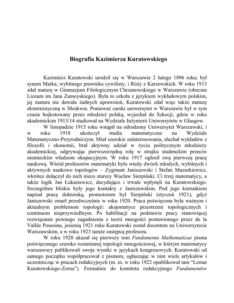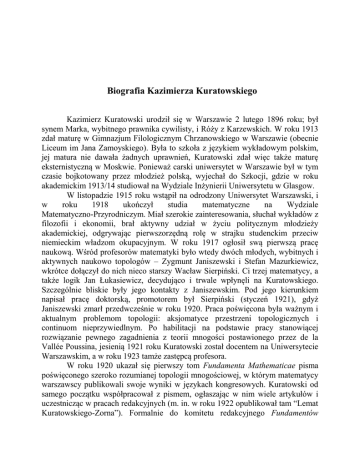 Biografia Kazimierza Kuratowskiego Kazimierz Kuratowski urodził się w Warszawie 2 lutego 1896 roku; był synem Marka, wybitnego prawnika cywilisty, i Róży z Karzewskich. W roku 1913 zdał maturę w Gimnazjum Filologicznym Chrzanowskiego w Warszawie (obecnie Liceum im Jana Zamoyskiego). Była to szkoła z językiem wykładowym polskim, jej matura nie dawała żadnych uprawnień, Kuratowski zdał więc także maturę eksternistyczną w Moskwie. Ponieważ carski uniwersytet w Warszawie był w tym czasie bojkotowany przez młodzież polską, wyjechał do Szkocji, gdzie w roku akademickim 1913/14 studiował na Wydziale Inżynierii Uniwersytetu w Glasgow. W listopadzie 1915 roku wstąpił na odrodzony Uniwersytet Warszawski, i w roku 1918 ukończył studia matematyczne na Wydziale Matematyczno-Przyrodniczym. Miał szerokie zainteresowania, słuchał wykładów z filozofii i ekonomii, brał aktywny udział w życiu politycznym młodzieży akademickiej, odgrywając pierwszorzędną rolę w strajku studenckim przeciw niemieckim władzom okupacyjnym. W roku 1917 ogłosił swą pierwszą pracę naukową. Wśród profesorów matematyki było wtedy dwóch młodych, wybitnych i aktywnych naukowo topologów – Zygmunt Janiszewski i Stefan Mazurkiewicz, wkrótce dołączył do nich nieco starszy Wacław Sierpiński. Ci trzej matematycy, a także logik Jan Łukasiewicz, decydująco i trwale wpłynęli na Kuratowskiego. Szczególnie bliskie były jego kontakty z Janiszewskim. Pod jego kierunkiem napisał pracę doktorską, promotorem był Sierpiński (styczeń 1921), gdyż Janiszewski zmarł przedwcześnie w roku 1920. Praca poświęcona była ważnym i aktualnym problemom topologii: aksjomatyce przestrzeni topologicznych i continuom nieprzywiedlnym. Po habilitacji na podstawie pracy stanowiącej rozwiązanie pewnego zagadnienia z teorii mnogości postawionego przez de la Vallée Poussina, jesienią 1921 roku Kuratowski został docentem na Uniwersytecie Warszawskim, a w roku 1923 tamże zastępcą profesora. W roku 1920 ukazał się pierwszy tom Fundamenta Mathematicae pisma poświęconego szeroko rozumianej topologii mnogościowej, w którym matematycy warszawscy publikowali swoje wyniki w językach kongresowych. Kuratowski od samego początku współpracował z pismem, ogłaszając w nim wiele artykułów i uczestnicząc w pracach redakcyjnych (m. in. w roku 1922 opublikował tam “Lemat Kuratowskiego-Zorna”). Formalnie do komitetu redakcyjnego Fundamentów wszedł w roku 1928, a od roku 1945 aż do śmierci był redaktorem naczelnym pisma (początkowo razem z Sierpińskim). W latach dwudziestych prowadził wspólne badania z Sierpińskim i Mazurkiewiczem i z każdym z nich publikował wspólne prace. Jego najbliższym współpracownikiem był w tym okresie Bronisław Knaster, z którym napisał ważne prace dotyczące pojęcia spójności i continuów. Powstała wtedy, skupiona wokół pisma, Warszawska Szkoła Matematyczna, w której tworzeniu Kazimierz Kuratowski brał aktywny udział. Ponieważ wszystkie katedry matematyki w Uniwersytecie Warszawskim były obsadzone, Kuratowski zdecydował się na objęcie katedry na Wydziale Ogólnym Politechniki Lwowskiej (którego był później dziekanem). We Lwowie, gdzie spędził siedem lat, życie matematyczne było równie aktywne jak w Warszawie. Działali tam Stefan Banach i Hugo Steinhaus i wychodziło pismo Studia Mathematica, poświęcone analizie funkcjonalnej. Kuratowski napisał z Banachem dwie wspólne prace; w pierwszej z nich rozwiązali postawiony przez Hausdorffa ogólny problem miary. Znakomity ten wynik wzmocnił niebawem lwowski uczeń Kuratowskiego Stanisław Ulam. Innym ważnym wynikiem uzyskanym przez Kuratowskiego w latach lwowskich jest twierdzenie o grafach niespłaszczalnych. Pobyt we Lwowie Kuratowski uważał za “najbardziej owocny okres twórczości naukowej”. W roku 1929 Kazimierz Kuratowski ożenił się z Jadwigą Kozłowską, a w roku 1931 urodziła się im córka Zofia. W roku 1932 w Warszawie rozpoczęto wydawanie serii książek poświęconych najnowszym dziedzinom matematyki – były to sławne Monografie Matematyczne, pisane w językach obcych przez polskich autorów. Pomysł serii pochodził od Kuratowskiego, który uważał, że polska matematyka powinna mieć swoją serię monografii, tak jak ma pisma o zasięgu międzynarodowym Fundamenta Mathematicae i Studia Mathematica. Trzecim tomem serii była Topologie I Kuratowskiego. Po zlikwidowaniu Wydziału Ogólnego Politechniki Lwowskiej, Kuratowski wrócił w roku 1934 do Warszawy, gdzie zaproponowano mu katedrę matematyki. Profesorem Uniwersytetu Warszawskiego był do roku 1965, kiedy to przeszedł na emeryturę. W roku 1935 brał udział w Pierwszej Międzynarodowej Konferencji Topologicznej w Moskwie, gdzie poznał Solomona Lefschetza, który zaprosił go do Institute of Advanced Study w Princeton. Kuratowski popłynął więc do Nowego Yorku i stamtąd udał się do Princeton, podczas swojego tam pobytu wspólnie z Johnem von Neumannem rozwiązał problem Łuzina o złożoności deskryptywnej powierzchni Lebesgue’a. Odwiedził także kilka amerykańskich uniwersytetów (m. in. Harvard i Duke). Lata trzydzieste to okres intensywnej pracy nad monografią Topologie, na jej użytek Kuratowski gruntownie przemyślał i przekształcił kilka działów topologii, w szczególności deskryptywną teorię mnogości i teorię wymiaru. Dzięki stosowaniu nowych metod, często udawało mu się uogólnić znane wyniki i uprościć ich dowody. Drugi tom tego monumentalnego dzieła był gotowy do druku w roku 1939, ale wybuchła wojna i Kuratowski zmuszony był przerwać na pięć lat pracę naukową. Topologie II, po aktualizacji, ukazała się dopiero w roku 1950. W okresie okupacji Kuratowski żył w nieustannym zagrożeniu i bywał o krok od śmierci. Od maja 1943 roku do wybuchu powstania pod przybranym nazwiskiem ukrywał się przed aresztowaniem. Wykładał jed