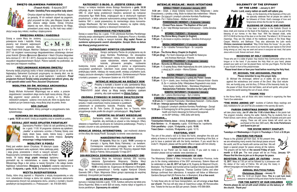 ŚWIĘTO OBJAWIENIA PAŃSKIEGO (Trzech Króli) - 8 stycznia 2017 Psalm: Uwielbią Pana wszystkie ludy ziemi. Chrystus objawił się Mędrcom ze Wschodu, idącym za gwiazdą. W ich osobach objawił się poganom, gdyż przyszedł nie tylko, jako Mesjasz Izraela, ale jako zbawca całego świata. Dzisiaj Chrystus objawia się nam, którzy przychodzimy do Niego, prowadzeni przez wiarę, by Mu hołd nasz oddać i złożyć swoje dary miłości, modlitwy i dziękczynienia ŚWIĘCONA KREDA I KADZIDŁO Dzisiaj w czasie Mszy św. zostaną poświęcone kreda i kadzidło. Kredą piszemy nad drzwiami wejściowymi naszych mieszkań pierwsze litery imion Trzech Króli (Kacper, Melchior i Baltazar) i bieżący rok: K + M + B = 2017 lub inicjałami noworocznego błogosławieństwa udzielanego domowi przez Kościół: Christus Mansionem Benedicat = Niech Chrystus błogosławi temu domowi (C + M + B = 2017). Zwyczaj ten ma darzyć nasze domy i nas wszystkich błogosławieństwem Bożym. Palone kadzidło ma podkreślać, że nasz dom jest miejscem modlitwy. PRZYJMOWANIE KOMUNII ŚWIĘTEJ Komunię świętą przyjmują osoby w łasce uświęcającej do ust lub na dłoń. Najświętszy Sakrament Eucharystii przyjmujemy na otwartą dłoń, nie do palców i należy włożyć ją do ust przed kapłanem / szafarzem. Przed przyjęciem Komunii Świętej należy przyklęknąć lub skłonić głowę, aby w ten sposób oddać cześć Panu Jezusowi Chrystusowi. MODLITWA DO ŚW. MICHAŁA ARCHANIOŁA Odmawiajmy ją codziennie Święty Michale Archaniele! Wspomagaj nas w walce, a przeciw niegodziwości i zasadzkom złego ducha bądź naszą obroną. Oby go Bóg pogromić raczył, pokornie o to prosimy, a Ty, Wodzu niebieskich zastępów, szatana i inne duchy złe, które na zgubę dusz ludzkich po tym świecie krążą, mocą Bożą strąć do piekła. Amen. BÓG ZAPŁAĆ Rodzinie Korus i wszystkim, którzy pomagali w przygotowaniu balu sylwestrowego. KORONKA DO MIŁOSIERDZIA BOŻEGO o godz. 18:30 we wtorki i środy po angielsku oraz w czwartki po polsku. DZISIAJ JEST NASZ OPŁATEK PARAFIALNY Zapraszamy Parafian i Gości do sali parafialnej po Mszy św. o godz. 11:00. W programie: dzielenie się opłatkiem, „Jasełka” w wykonaniu uczniów z Polskiej Szkoły oraz ciepły obiad, kawa, ciasto, loteria koszy i wspólne kolędowanie. Są jeszcze wolne miejsca. Życzymy smacznego i miłego kolędowania. MODLITWY O POKÓJ Pokój jest wielkim darem Chrystusa. W obecnym czasie jesteśmy świadkami wielu wydarzeń, które zakłócają pokój i sieją grozę, przerażenie i strach w naszych sercach. Rozpoczynamy comiesięczne modlitwy o pokój dla Polski i świata. W każdy drugi piątek miesiąca będziemy gromadzili się na nabożeństwie, w czasie, którego będziemy prosili Miłosiernego Boga o dar pokoju w naszej Ojczyźnie i dla całego świata. Najbliższe nabożeństwo (Nieszpory z kolędami) zostanie odprawione w piątek, 13 stycznia, o godz. 18:30. Zachęcamy do wspólnej modlitwy. WIZYTA DUSZPASTERSKA Osoby, które chcą zaprosić o. Wojciecha z wizytą duszpasterską w celu m.in. odwiedzenia chorego w domu lub szpitalu, otrzymania sakramentu namaszczenia chorych lub poświęcenia domu, prosimy o kontakt z biurem parafialnym lub bezpośrednio z o. Proboszczem – tel. 416-504-4643. KATECHEZY O BŁOG. O. JÓZEFIE CEBULI OMI Dzisiaj i w kolejne niedziele okresu Bożego Narodzenia o godz. 10:30 odbywają się w kościele katechezy o błogosławionym o. Józefie Cebuli OMI. O. Józef będąc przełożonym klasztoru sprzeciwił się rozkazowi zniszczenia figur Matki Bożej, znajdujących się w okolicznych kaplicach przydrożnych, a także zakazowi wykonywania posługi kapłańskiej. Dnia 18 kwietnia 1941 r. został przewieziony do niemieckiego obozu koncentracyjnego Mauthausen. Był tam torturowany, skazany na ciężkie roboty, wreszcie rozstrzelany i spalony w obozowym krematorium. ODNOWIENIE PRZYRZECZEŃ Dzisiaj w czasie Mszy św. o godz. 11:00 członkowie Komitetu Parafialnego odnowią swoje zobowiązania członkowskie. Dziękujemy Panom z Komitetu Parafialnego za ich służbę w naszym kościele. Bóg zapłać Panom za sumienne wykonywanie swoich obowiązków. Szczęść Boże na dalsze lata Waszej posługi pośród nas. ZAPRASZAMY NOWYCH CZŁONKÓW Gorąco zachęcamy Panów do przyłączenia się do grupy Komitetu Parafialnego. Do obowiązków komitetowych należą m.in.: zbieranie składek w czasie nabożeństw, witanie wchodzących do kościoła, pilnowanie porządku, rozdawanie biuletynów, branie udziału w procesjach i pomoc w organizowaniu uroczystości parafialnych. Członkiem może zostać każdy ochrzczony, praktykujący katolik, należący do naszej parafii, wiodący przykładne życie, mający poczucie obowiązku i odpowiedzialności. Zainteresowanych Panów o kontakt z prezesem - p. Romanem Solskim tel. 416-767-8087. INTENCJE MSZALNE NA BIEŻĄCY ROK Prosimy o kontakt z biurem w celu zamówienia Mszy św. za zmarłych lub w naszych osobistych intencjach. Jeżeli ofiarę za Mszę świętą składamy czekiem prosimy, aby czek wystawić na Oblate Fathers. ZBIÓRKA ŻYWNOŚCI W OKRESIE ŚWIĄTECZNYM Niepsujące się produkty (najbardziej potrzebne są: mleko w proszku i masło orzechowe) można zostawiać w pudełkach, ustawionych w przedsionku kościoła. Produkty będą przekazane do St. Felix Centre, 25 Augusta Ave. w Toronto, które przygotowuje ciepłe posiłki dla ubogich i potrzebujących. Bóg Zapłać! KOPERTKI NA OFIARY NIEDZIELNE Zachęcamy osoby, które dotychczas nie posiadały kopertek, aby zechciały je używać w roku bieżącym. Ofiary składane w kopertkach są wliczane do rozliczenia podatkowego. Prosimy o kontakt z biurem w celu zamówienia kopertek. DONACJE DROGĄ INTERNETOWĄ - jest możliwość złożenia on-line ofiary dla naszej Parafii. Szczegóły na stronie: www.stanislaw.ca. NABOŻEŃSTWO FATIMSKIE W piątek, 13 stycznia, Msza św. o godz. 19:00 i procesja na zewnątrz z figurką M