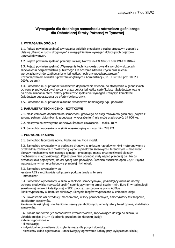 załącznik nr 7 do SIWZ Wymagania dla średniego samochodu ratowniczo-gaśniczego dla Ochotniczej Straży Pożarnej w Tymowej 1. WYMAGANIA OGÓLNE 1.1. Pojazd powinien spełniać wymagania polskich przepisów o ruchu drogowym zgodnie z Ustawą „Prawo o ruchu drogowym” z uwzględnieniem wymagań dotyczących pojazdów uprzywilejowanych. 1.2. Pojazd powinien spełniać przepisy Polskiej Normy PN-EN 1846-1 oraz PN-EN 1846-2. 1.3. Pojazd powinien spełniać „Wymagania techniczno-użytkowe dla wyrobów służących zapewnieniu bezpieczeństwa publicznego lub ochronie zdrowia i życia oraz mienia, wprowadzanych do użytkowania w jednostkach ochrony przeciwpożarowej” Rozporządzeniem Ministra Spraw Wewnętrznych i Administracji (Dz. U. Nr 143 poz. 1002 z 2007r. ze zm.). 1.4. Samochód musi posiadać świadectwo dopuszczenia wyrobu, do stosowania w jednostkach ochrony przeciwpożarowej wydany przez polską jednostkę certyfikującą. Świadectwo ważne na dzień składania ofert. Należy potwierdzić spełnienie wymagań i załączyć kompletne świadectwo dopuszczenia do oferty (dwie strony). 1.5. Samochód musi posiadać aktualne świadectwo homologacji typu podwozia. 2. PARAMETRY TECHNICZNO – UŻYTKOWE 2.1. Masa całkowita dopuszczalna samochodu gotowego do akcji ratowniczo-gaśniczej (pojazd z załogą, pełnymi zbiornikami, zabudową i wyposażeniem) nie może przekroczyć: 14 000 kg. 2.2. Maksymalna zewnętrzna obrysowa średnica zawracania – maks. 18 m 2.3. Samochód wyposażony w silnik wysokoprężny o mocy min. 278 KM 3. PODWOZIE I KABINA 3.1. Samochód fabrycznie nowy. Podać markę, typ i model. 3.2. Samochód wyposażony w podwozie drogowe w układzie napędowym 4x4 – uterenowiony z przekładnią rozdzielczą z możliwością wyboru przełożeń szosowych i terenowych – możliwość blokady mechanizmu różnicowego tylnego i przedniego mostu oraz możliwość blokady mechanizmu międzyosiowego. Pojazd powinien posiadać stały napęd przedniej osi. Na osi przedniej koła pojedyncze, na osi tylnej koła podwójne. Średnica osadzenia opon 22,5”. Pojazd wyposażony w hamulce bębnowe przedniej i tylnej osi. 3.3. Samochod wyposażony w: -system ABS z możliwością odłączenia podczas jazdy w terenie - immobilizer 3.4. Samochód wyposażony w silnik o zapłonie samoczynnym , posiadający aktualne normy ochrony środowiska (czystości spalin) spełniający normę emisji spalin - min. Euro 5, w technologii selektywnej redukcji katalitycznej – SCR, poprzez zastosowane płynu AdBlue Silnik wyposażony w hamulec silnikowy. Skrzynia biegów wyposażona w chłodnicę oleju. 3.5. Zawieszenie osi przedniej: mechaniczne, resory parabolicznych, amortyzatory teleskopowe, stabilizator przechyłów. Zawieszenie osi tylnej: mechaniczne, resory parabolicznych, amortyzatory teleskopowe, stabilizator przechyłów. 3.6. Kabina fabrycznie jednomodułowa czterodrzwiowa, zapewniająca dostęp do silnika, w układzie miejsc 1+1+4 (siedzenia przodem do kierunku jazdy). Kabina wyposażona w : - klimatyzację, - indywidualne oświetlenie do czytania mapy dla pozycji dowódcy, - niezależny układ ogrzewania , umożliwiający ogrzewanie kabiny przy wyłączonym silniku, 1 - reflektor pogorzeliskowy na zewnątrz kabiny z gniazdem elektrycznym z prawej strony, - poręcz do trzymania w tylnej części kabiny, - zewnętrzną osłonę przeciwsłoneczną z przodu dachu kabiny, - elektrycznie sterowane szyby po stronie kierowcy i dowódcy, - elektrycznie sterowane lusterka po stronie kierowcy i dowódcy, - lusterka zewnętrzne elektrycznie podgrzewane (główne i szerokokątne), - lusterko rampowe-krawężnikowe z prawej strony, - lusterko rampowe-dojazdowe przednie, - wywietrznik dachowy, - lampy przeciwmgielne z przodu pojazdu, Kabina wyposażona dodatkowo w: - uchwyty na 4 aparaty oddechowe z butlami stalowymi, umieszczone w oparciach tylnych siedzeń, - odblokowanie każdego aparatu indywidualnie, - dźwignia odblokowująca o konstrukcji uniemożliwiającej przypadkowe odblokowanie np. w czasie hamowania pojazdu, - uchwyty na aparaty powietrzne nie powinny ograniczać przestrzeni załogi, - schowek pod siedzeniami w tylnej części kabiny. 3.7. Fotele wyposażone w bezwładnościowe pasy bezpieczeństwa. Siedzenia pokryte materiałem łatwozmywalnym, odpornym na ścieranie. Fotele wyposażone w zagłówki. Fotel dla kierowcy z regulacją wysokości, odległości i pochylenia oparcia 3.8. W kabinie kierowcy zamontować następujące urządzenia: - radiotelefon samochodowy o parametrach: częstotliwość VHF 136-174 MHz, moc 1÷25 W, odstęp międzykanałowy 12,5 kHz dostosowany do użytkowania w sieci MSWiA, min 125 kanałów, wyświetlacz alfanumeryczny min 14 znaków. Obrotowy potencjometr siły głosu. -radio z odtwarzaczem CD, -podest do ładowarek radiostacji przenośnych i latarek z wyłącznikiem. 3.9. Dodatkowe urządzenia zamontowane w kabinie: - sygnalizacja otwarcia żaluzji skrytek i podestów, - sygnalizacja informująca o wysunięciu masztu, - sygnalizacja załączonego gniazda ładowania, - główny wyłącznik oświetlenia skrytek, - sterowanie zraszaczami, - sterowanie niezależnym ogrzewaniem kabiny i przedziału pracy autopompy, - kontrolka włączenia autopompy, - wskaźnik poziomu wody w zbiorniku, - wskaźnik poziomu środka pianotwórczego w zbiorniku, - wskaźnik niskiego ciśnienia, - wskaźnik wysokiego ciśnienia. 3.10. Pojazd wyposażony w urządzenie sygnalizacyjno-ostrzegawcze (akustyczne i świetlne) pojazdu uprzywilejowanego. Urządzenie akustyczne powinno umożliwiać podawanie komunikatów słownych. Głośnik lub głośniki o mocy min. 200W. Lampa zespolona z napisem „STRAŻ”- płaska z lampami LED umieszczona na dachu kabiny i jedna lampa niebieska LED, umieszczona na ścianie tylnej pojazdu lub na tylnej części dachu pojazdu. Sterowanie przy pomocy manipulatora na elastycznym przewodzie, zmiana modulacji dźwiękowej sygnału także poprzez klakson po