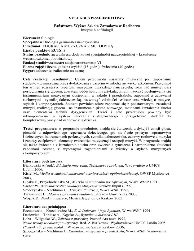 SYLLABUS PRZEDMIOTOWY Państwowa WyŜsza Szkoła Zawodowa w Raciborzu Instytut Neofilologii Kierunek: filologia Specjalność: filologia germańska nauczycielska Przedmiot: EDUKACJA MUZYCZNA Z METODYKĄ Liczba punktów ECTS: 3 Status przedmiotu: z zakresu dodatkowej specjalności nauczycielskiej – kształcenie wczesnoszkolne, obowiązkowy Rodzaj studiów/semestr: stacjonarne/semestr VI Forma zajęć i liczba godzin: wykład (15 godz.), ćwiczenia (30 godz.) Rygor: zaliczenie, zaliczenie na ocenę Cele realizacji przedmiotu: Celem przedmiotu warsztaty muzyczne jest zapoznanie studentów z muzyczną pracą dydaktyczną z dziećmi w młodszym wieku szkolnym. Przedmiot ten winien rozszerzyć repertuar muzyczny przyszłego nauczyciela, rozwinąć umiejętności posługiwania się głosem, aparatem oddechowym i artykulacyjnym, nauczyć posługiwania się instrumentarium muzycznym dostępnym w szkole i przedszkolu, zapoznać z zabawami ruchowymi i rytmiką dalcrozowską, rozszerzyć zdolności twórcze oraz wiedzę o muzyce, stylach i kompozytorach. Student powinien takŜe zapoznać się z podstawowymi zasadami muzyki, realizacją głosem i na instrumencie pisma nutowego, metodami kształcenia słuchu oraz elementami technik dyrygenckich. Treści i cele przedmiotu powinny być wkomponowane w system nauczania zintegrowanego i przygotować studenta do kompleksowej pracy nad osobowością dziecka. Treści programowe: w programie przedmiotu znajdą się ćwiczenia z dykcji i emisji głosu, piosenki z odpowiedniego repertuaru dziecięcego, gra na flecie prostym sopranowym i dziecięcych instrumentach perkusyjnych, rytmika dalcrozowska, zabawy ruchowe z muzyką i zabawy ze śpiewem, elementy twórczości muzycznej i recepcji muzyki. W programie znajdą się takŜe ćwiczenia z kształcenia słuchu oraz ćwiczenia rytmiczne i harmoniczne. Studenci zapoznani zostaną z wybranymi zagadnieniami z wiedzy o stylach muzycznych i kompozytorach. Literatura podstawowa: Białkowski A.(red.), Edukacja muzyczna. ToŜsamość i praktyka, Wydawnictwo UMCS Lublin 2006, Kisiel M., Media w edukacji muzycznej uczniów szkoły ogólnokształcącej, GWSP Mysłowice 2003, Lipska E., Przychodzińska M., Muzyka w nauczaniu początkowym, W-wa WSiP 1991, Sacher W.,Wczesnoszkolna edukacja Muzyczna Kraków Impuls 1997, Smoczyńska – Nachtman U., Muzyka dla dzieci, W-wa WSiP 1992, Tarasiewicz B., Mówię i śpiewam świadomie, Kraków Universitas 2003, Wójcik D., Nauka o muzyce, Musica Jagiellonica Kraków 2003. Literatura uzupełniająca: Brzozowska – Kuczkiewicz M., E. J. Dalcroze i jego Rytmika, W-wa WSiP 1991, Dasiewicz – Tobiasz A., Kępska A., Rytmika w klasach I-III, Loba – Wilgocka W., Zabawa z piosenką, Poznań Ars nova 1992, Nowe trendy w edukacji muzycznej, Red. A Białkowski Wydawnictwo UMCS Lublin 2005, Piosenki dla przedszkolaka. Wydawnictwo Skrzat Kraków 2006, Smoczyńska – Nachtman U.,Kalendarz muzyczny w przedszkolu, W-wa WSiP /wznowienia stałe/