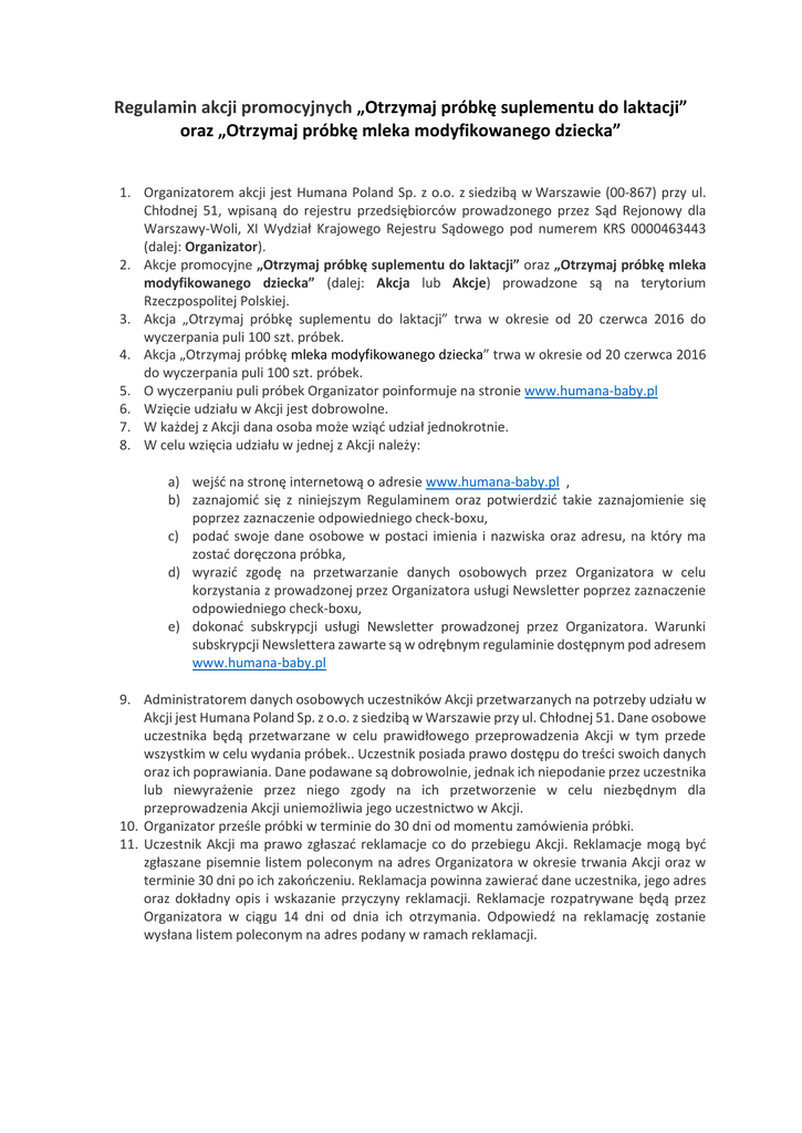Regulamin akcji promocyjnych „Otrzymaj próbkę suplementu do laktacji” oraz „Otrzymaj próbkę mleka modyfikowanego dziecka” 1. Organizatorem akcji jest Humana Poland Sp. z o.o. z siedzibą w Warszawie (00-867) przy ul. Chłodnej 51, wpisaną do rejestru przedsiębiorców prowadzonego przez Sąd Rejonowy dla Warszawy-Woli, XI Wydział Krajowego Rejestru Sądowego pod numerem KRS 0000463443 (dalej: Organizator). 2. Akcje promocyjne „Otrzymaj próbkę suplementu do laktacji” oraz „Otrzymaj próbkę mleka modyfikowanego dziecka” (dalej: Akcja lub Akcje) prowadzone są na terytorium Rzeczpospolitej Polskiej. 3. Akcja „Otrzymaj próbkę suplementu do laktacji” trwa w okresie od 20 czerwca 2016 do wyczerpania puli 100 szt. próbek. 4. Akcja „Otrzymaj próbkę mleka modyfikowanego dziecka” trwa w okresie od 20 czerwca 2016 do wyczerpania puli 100 szt. próbek. 5. O wyczerpaniu puli próbek Organizator poinformuje na stronie www.humana-baby.pl 6. Wzięcie udziału w Akcji jest dobrowolne. 7. W każdej z Akcji dana osoba może wziąć udział jednokrotnie. 8. W celu wzięcia udziału w jednej z Akcji należy: a) wejść na stronę internetową o adresie www.humana-baby.pl , b) zaznajomić się z niniejszym Regulaminem oraz potwierdzić takie zaznajomienie się poprzez zaznaczenie odpowiedniego check-boxu, c) podać swoje dane osobowe w postaci imienia i nazwiska oraz adresu, na który ma zostać doręczona próbka, d) wyrazić zgodę na przetwarzanie danych osobowych przez Organizatora w celu korzystania z prowadzonej przez Organizatora usługi Newsletter poprzez zaznaczenie odpowiedniego check-boxu, e) dokonać subskrypcji usługi Newsletter prowadzonej przez Organizatora. Warunki subskrypcji Newslettera zawarte są w odrębnym regulaminie dostępnym pod adresem www.humana-baby.pl 9. Administratorem danych osobowych uczestników Akcji przetwarzanych na potrzeby udziału w Akcji jest Humana Poland Sp. z o.o. z siedzibą w Warszawie przy ul. Chłodnej 51. Dane osobowe uczestnika będą przetwarzane w celu prawidłowego przeprowadzenia Akcji w tym przede wszystkim w celu wydania próbek.. Uczestnik posiada prawo dostępu do treści swoich danych oraz ich poprawiania. Dane podawane są dobrowolnie, jednak ich niepodanie przez uczestnika lub niewyrażenie przez niego zgody na ich przetworzenie w celu niezbędnym dla przeprowadzenia Akcji uniemożliwia jego uczestnictwo w Akcji. 10. Organizator prześle próbki w terminie do 30 dni od momentu zamówienia próbki. 11. Uczestnik Akcji ma prawo zgłaszać reklamacje co do przebiegu Akcji. Reklamacje mogą być zgłaszane pisemnie listem poleconym na adres Organizatora w okresie trwania Akcji oraz w terminie 30 dni po ich zakończeniu. Reklamacja powinna zawierać dane uczestnika, jego adres oraz dokładny opis i wskazanie przyczyny reklamacji. Reklamacje rozpatrywane będą przez Organizatora w ciągu 14 dni od dnia ich otrzymania. Odpowiedź na reklamację zostanie wysłana listem poleconym na adres podany w ramach reklamacji.