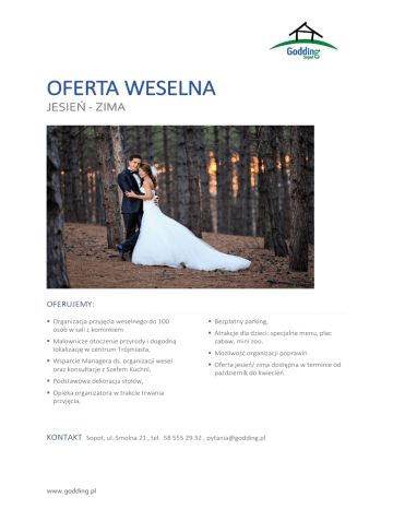 OFERTA WESELNA JESIEŃ - ZIMA OFERUJEMY: Organizacja przyjęcia weselnego do 100 osób w sali z kominkiem Malownicze otoczenie przyrody i dogodną lokalizację w centrum Trójmiasta, Wsparcie Managera ds. organizacji wesel oraz konsultacje z Szefem Kuchni, Bezpłatny parking, Atrakcje dla dzieci: specjalne menu, plac zabaw, mini zoo. Możliwość organizacji poprawin Oferta jesień/ zima dostępna w terminie od październik do kwiecień. Podstawowa dekoracja stołów, Opieka organizatora w trakcie trwania przyjęcia, KONTAKT Sopot, ul. Smolna 21 , tel. 58 555 29 32 , [email protected] www.godding.pl MENU WESELNE I Powitanie Młodej Pary chlebem i solą oraz wino musujące dla gości PRZYSTAWKA ZIMNA Roladka ze schabu faszerowana musem grzybowym na sosie kaparowym ZUPA Zupa krem z kalafiora z oliwą truflową DANIE GŁÓWNE Filet drobiowy faszerowany szpinakiem z sosem serowo- cytrynowym podany z puree i zielonymi warzywami DESER Krem Brulle BUFET ZIMNY (BUFET SZWEDZKI) Terrine z dorsza z cytryną i chilli Pstrąg wędzony Sałatka z paluszkami krabowymi, ogórkiem i rzodkiewką Półmisek mięs pieczonych (karkówka pieczona, schab ze śliwką, indyk pieczony, roladka z boczku z zielonymi pieprzem, rolada z kaczki z bakaliami) Pasztet z dziczyzny z żurawiną Sałatka rzymska z kurczakiem, bekonem i grzankami Pieczywo mieszane , masło Marynaty Sosy: koktajlowy, tatarski, cumberland www.godding.pl KOLACJA Żurek z jajkiem i grzybami PO PÓŁNOCY Barszcz z uszkami NAPOJE ZIMNE (bez ograniczeń) Kawa Herbata Woda niegazowana z cytryną CENA 150,00 zł /osoby + opłata korkowa 10 zł/osoby pełnoletnie MENU II Powitanie Młodej Pary chlebem i solą oraz wino musujące dla gości PRZYSTAWKA ZIMNA Podwędzany łosoś na grillowanym jabłku z musem chrzanowym ZUPA Rosół wołowo- drobiowy z warzywami i kluseczkami DANIE GŁÓWNE Zraz z karkówki z tradycyjnym farszem podany z pieczonymi ziemniakami i buraczkami duszonymi w czerwonym winie DESER Chłodnik śliwkowy z lodami waniliowymi BUFET ZIMNY (BUFET SZWEDZKI) Terrine z dorsza z warzywami Filety śledziowe z jabłkiem i cebulką w śmietanie Quiche z dorsza atlantyckiego ze szpinakiem Sałatka ryżowa z wędzonym kurczakiem i papryką Półmisek mięs pieczonych (karkówka pieczona, schab ze śliwką, indyk pieczony, roladka z boczku z zielonymi pieprzem, rolada z kaczki z bakaliami) Pieczywo mieszane, masło Marynaty Sosy: koktajlowy, tatarski, cumberland www.godding.pl KOLACJA Bogracz z kluseczkami PO PÓŁNOCY Barszcz czerwony z uszkami NAPOJE ZIMNE (bez ograniczeń) Kawa Herbata Woda niegazowana z cytryną CENA 160,00 zł /osoby + opłata korkowa 10 zł/osoby pełnoletnie MENU III Powitanie Młodej Pary chlebem i solą oraz wino musujące dla gości PRZYSTAWKA ZIMNA Łosoś marynowany w sosie terijaki podany na sałatce z rucoli i świeżego ogórka ZUPA Zupa grzybowa z warzywami i kluseczkami DANIE GŁÓWNE Polędwiczka wieprzowa w orzechowej panierce z musztardowym sosem podana z karmelizowanymi warzywami i ziemniakami Au Gratin DESER Panna Cotta z malinowym sosem BUFET ZIMNY (BUFET SZWEDZKI) Filet śledziowy z jabłkiem i cebulą w śmietanie Quiche z dorszem atlantyckim i szpinakiem Roladka z kurczaka z czerwoną papryką Półmisek mięs pieczonych (karkówka pieczona, schab ze śliwką, indyk pieczony, roladka z boczku z zielonymi pieprzem, rolada z kaczki z bakaliami) Sałatka jarzynowa Sałatka rzymska z kurczakiem, bekonem i grzankami Marynaty / masło / pieczywo Sosy: koktajlowy, tatarski, cumberland www.godding.pl BUFET SŁODKI Tarta czekoladowa Kruche babeczki z mascarpone Sernik z malinami KOLACJA Bogracz z kluseczkami DANIE PO PÓŁNOCY Barszcz czerwony z uszkami NAPOJE ZIMNE (b/ograniczeń) Kawa Herbata (czarna, zielona, owocowa) Woda niegazowana z cytryną Sok owocowy CENA 180,00 zł /osoby Bez opłaty korkowej DODATKOWO POLECAMY STÓŁ WIEJSKI Stół mały 10kg wyrobów (max 30 osób) 1000 zł Stół średni 20kg wyrobów (max 60 osób) 1500 zł Stół duży 30kg wyrobów (max 120 osób) 2200 zł DESKA SERÓW z owocami (2kg) 300 zł / osobę DZICZYZNA / Dania podawane w całości Indyk w całości (max 40 osób) 800 zł Prosiak pieczony w całości (40 osób) 1400 zł Dzik pieczony mały (max 60 osób)1900 zł Dzik pieczony duży (max 100 osób) 2400 zł OGNISKO m3 drewna 300 zł kiełbaska, pieczywo, sosy 8 zł/porcja GRZANE WINO- kociołek z korzennymi przyprawami 450 zł netto + 23% Vat (10l- około 60 porcji), WEDDING BAR (ok. 5 drinków/osobę) 45 zł Cena zawiera obsługę barmańską, określony asortyment alkoholowy, dekoracje www.godding.pl WAŻNE INFORMACJE Biuro Godding otwarte jest od poniedziałku do piątku w godzinach 10:00 – 18:00. Wynajem sali w kwocie 1000 zł nie został wliczony w cenę menu. Opłata za wynajem sali jest gwarancją potwierdzenia rezerwacji. Do każdego menu należy doliczyć (do osoby pełnoletniej) korkowe w kwocie 15 zł/osoby. W opłacie korkowej są dwie możliwości (informacja na spotkaniu). Jeżeli Państwo decydują się na wniesienie własnych alkoholi oraz własnych napoi opłata korkowa wzrasta do 20 zł/osoby. Wycena menu zawiera: obsługę kelnerską, pełne nakrycie stołów wraz z dekoracją kwiatową z żywych kwiatów w naturalnych odcieniach (według norm lokalu). Wesele trwa max 12h i zakończenie wesela nie przekracza godziny 4:00. Po przekroczeniu godziny zakończenia wesela, wskazanej w umowie, dodatkowa opłata. Możliwość wniesienia własnych wyrobów cukierniczych w dniu wesela. Menu i harmonogram wesela, ustalany jest najpóźniej na trzy tygodnie przed datą wesela. Wszelkie wniesione zmiany po wyznaczonym terminie nie muszą być przez nas akceptowane. Dzieci do lat 10 posiadają upust w kwocie 50% od stałej ceny menu. Dla dzieci można przygotować odrębne menu. Obsługa wesela np. Dj, fotograf posiadają upust 50% od stałej ceny menu (wszystkie dania ciepłe + deser), jeżeli Państwo zapraszają do pełnego wyżywienia, osoby te, są traktowane 