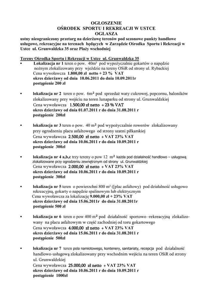 OGŁOSZENIE OŚRODEK SPORTU I REKREACJI W USTCE OGŁASZA ustny nieograniczony przetarg na dzierżawę terenów pod sezonowe punkty handlowe usługowe, rekreacyjne na terenach będących w Zarządzie Ośrodka Sportu i Rekreacji w Ustce ul. Grunwaldzka 35 oraz Plaży wschodniej Tereny Ośrodka Sportu i Rekreacji w Ustce ul. Grunwaldzka 35 ▪ Lokalizacja nr 1 teren o pow. 40m² pod wypożyczalnie gokartów o napędzie nożnym zlokalizowany przy wjeździe na tereny OSiR od strony ul. Rybackiej Cena wywoławcza 1.800,00 zł netto + 23 % VAT okres dzierżawy od dnia 10.06.2011 do dnia 10.09.2011r postąpienie 200 zł ▪ lokalizacja nr 2 teren o pow. 6m² pod sprzedaż waty cukrowej, popcornu, baloników zlokalizowany przy wejściu na teren lunaparku od strony ul. Grunwaldzkiej Cena wywoławcza 1.500,00 zł netto + 23 % VAT okres dzierżawy od dnia 01.07.2011 r do dnia 31.08.2011 r postąpienie 200zł ▪ lokalizacja nr 3 teren o pow. 40 m² pod wypożyczalnie rowerów zlokalizowany przy ogrodzeniu placu asfaltowego od strony szatni piłkarskiej Cena wywoławcza 2.500,00 zł netto + VAT 23% VAT okres dzierżawy od dnia 10.06.2011 r do dnia 10.09.2011 r postąpienie 300zł ▪ lokalizacja nr 4 a,b,c trzy tereny o pow 12 m² każda pod działalność handlowo – usługową zlokalizowane przy ogrodzeniu zewnętrznym od strony ul. Grunwaldzkiej Cena wywoławcza 2.000,00 zł netto + VAT 23% VAT okres dzierżawy od dnia 10.06.2011 r do dnia 10.09.2011 r postąpienie 300zł ▪ lokalizacja nr 5 teren o powierzchni 800 m² ([plac asfaltowy) pod działalność usługowo rekreacyjną, gokarty o napędzie spalinowym lub elektrycznym Cena wywoławcza za lokalizację 9.000,00 zł + 23% VAT okres dzierżawy od dnia 15.06.2011r do dnia 31.08.2011r postąpienie 500 zł ▪ lokalizacja nr 6 teren o pow 400 m² pod działalność sportowo -rekreacyjną zlokalizowany na placu asfaltowym w część zachodniej od toru gokartowego Cena wywoławcza 4.000,00 zł netto + VAT 23% VAT okres dzierżawy od dnia 15.06.2011 r do dnia 31.08.2011 r postąpienie 500zł ▪ lokalizacja nr 7 teren pola namiotowego, kontenery, sanitariaty, recepcja pod działalność handlowo-usługową zlokalizowany przy wschodnim wejściu na teren OSiR od strony ul. Grunwaldzkiej Cena wywoławcza 25.000,00 zł netto + VAT 23% VAT okres dzierżawy od dnia 10.06.2011 r do dnia 10.09.2011 r postąpienie 1000zł Tereny Plaży wschodniej ▪ lokalizacja 39 teren pod lokalizację wypożyczalni sprzętu pływającego o powierzchni 50 m² na plaży wschodniej rejon sektora sportowego. Cena wywoławcza 7.500,00 zł netto + 23% VAT okres dzierżawy 10.06.2011 r do dnia 10.09. 2011 r postąpienie 500 zł ▪ lokalizacja nr 47 teren pod lokalizację wypożyczalni sprzętu plażowego ( z wyłączeniem koszy plażowych) o wymiarach 5 x 6 = 30m² Cena wywoławcza za lokalizację 4.500,00 zł netto + 23% VAT okres dzierżawy od dnia 10.06.2011 r do dnia 10.09.2011r postąpienie 300 zł ▪ lokalizacja 48 teren pod miasteczko plażowe z przedszkolem wakacyjnym teren pod zagospodarowanie urządzeniami placu zabaw dla dzieci oraz urządzeniami rekreacyjnymi typu: kosze plażowe, leżaki, zabawki dmuchane ,batut, euro - bungy, zjeżdżalnie, itp. o maksymalnych wymiarach 85m x 20m = 1700 m² Cena wywoławcza lokalizację 30.000,00 zł netto + 23% VAT okres dzierżawy od dnia 10.06.2011 r do dnia 10.09.2011r postąpienie 1000 zł ▪ lokalizacja 52 lokalizacje o powierzchni 5 x 6 = 30m² pod wypożyczalnie sprzętu plażowego (z wyłączeniem koszy plażowych ) Cena wywoławcza za lokalizację 4.500,00 zł netto + 23% VAT okres dzierżawy od dnia 10.06.2011r do dnia 10.09.2011 r postąpienie 300zł ▪ lokalizacja 52a lokalizacje o powierzchni 5 x 6 = 30m² pod wypożyczalnie sprzętu plażowego (z wyłączeniem koszy plażowych ) Cena wywoławcza za lokalizację 4.500,00 zł netto + 23% VAT okres dzierżawy od dnia 10.06.2011r do dnia 10.09.2011 r postąpienie 300zł ▪ lokalizacja 58 lokalizacja o powierzchni 5 x 6 = 30m² pod wypożyczalnie sprzętu plażowego (z wyłączeniem koszy plażowych ) Cena wywoławcza za lokalizację 4.500,00 zł netto + 23% VAT okres dzierżawy od dnia 10.06.2011r do dnia 10.09.2011 r postąpienie 300zł ▪ lokalizacja nr 65 teren o pow. 100m² pod wypożyczalnię koszy plażowych i leżaków Cena wywoławcza za lokalizację 6,000,00 zł + 23% VAT okres dzierżawy od dnia 10.06.2011r do dnia 10.09.2011 r postąpienie 500 zł ▪ lokalizacja nr 68 teren o powierzchni o wymiarach 10m x 5 m = 50 m² z dostępem do brzegu morskiego pod wypożyczalnię sprzętu pływającego Cena wywoławcza 6.500,00 zł + 23% VAT okres dzierżawy10.06.2011r do dnia 10.09.2011r postąpienie 500 zł lokalizacja nr 69 teren pod lokalizację sektora sportów wodnych Windsurfing, Kule ▪ wodne z wyłączeniem sportów typu(skutery wodne,motorówki,banan itp.) Cena wywoławcza 4.000,00 zł + 23% VAT okres dzierżawy od dnia 10.06.2011r do dnia 10.09.2011r postąpienie 500 zł UWAGI DOTYCZĄCE PRZETARGU 1. Przetarg odbędzie się w dniu 07.04.2011 r. /czwartek/ w siedzibie Ośrodka Sportu i Rekreacji w Ustce ul Grunwaldzka 35 o: godz. 10:00 dla lokalizacji nr 1, 2, 3, 4a,b,c 5, 6, 7 godz. 12:30 dla lokalizacji nr 39, 47, 48, 52, 52a, 58, 65, 68, 69 Organizator dopuszcza możliwość przeprowadzenia kolejnego przetargu w tym samym dniu, tj. w dniu 07.04.2011r o godz. 14:00 2. Warunkiem przystąpienia do w/w przetargu jest wpłata wadium w wysokości 5 % ceny wywoławczej stosownie za lokalizację i przedłożenie dowodu wpłaty wadium najpóźniej do: godz. 9:30 w przetargu wyznaczonym na godz 10:00 w dniu 07.04.2011r godz. 12:00 w przetargu wyznaczonym na godz 12:30 w dniu 07.04.2011r na konto OSiR Ustka w BS Ustka nr 04 9315 0004 0000 0882 2000 0010 lub w kasie Ośrodka Sportu i Rekreacji w Ustce. 3. Uczestnicy przetargu zobowiązani są zapoznać się z Regulaminem Przetargu oraz projektem umowy dzierżawy przed przystąpieniem do przetargu i złożyć p