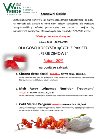 Szanowni Goście Chcąc zapewnid Paostwu jak największą dawkę odpoczynku i relaksu, na których tak bardzo w ferie nam zależy, specjalnie dla Paostwa przygotowaliśmy ofertę promocyjną na jedne z najbardziej luksusowych zabiegów, oferowanych przez Instytut SPA Villa Verde. Oferta promocyjna dostępna: 15.01.2016 - 29.02.2016 DLA GOŚCI KORZYSTAJĄCYCH Z PAKIETU „FERIE ZIMOWE” Rabat -20% na poniższe zabiegi: 1. Chrono detox facial 160,00 zł. NOWA CENA: 128,00 zł. Zabieg przeznaczony jest do pielęgnacji skóry zmęczonej, zestresowanej, niedotlenionej, której potrzebny jest blask, świeżośd i witalnośd. 2. Melt Away „Algomea Nutrition Treatment” 150,00 zł. NOWA CENA 120,00 zł. Zabieg nawilżający, odżywiający, regenerujący skórę oraz zabezpieczający przed utratą wody. 3. Cold Marine Program 160,00 zł. NOWA CENA 128,00 zł. Zabieg wzmacniający i uszczelniający ściany naczyo krwionośnych, łagodzący podrażnienia, zmniejszający wrażliwośd skóry na czynniki zewnętrzne.