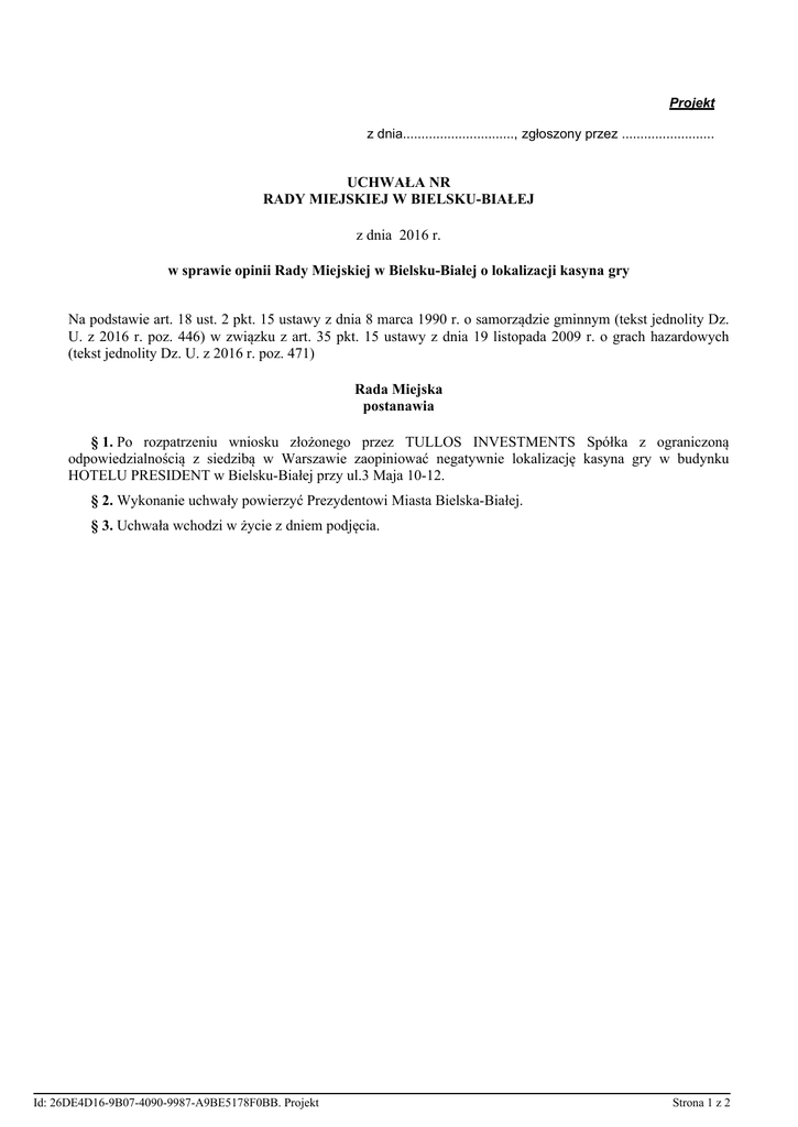 Projekt z dnia.............................., zgłoszony przez ......................... UCHWAŁA NR RADY MIEJSKIEJ W BIELSKU-BIAŁEJ z dnia 2016 r. w sprawie opinii Rady Miejskiej w Bielsku-Białej o lokalizacji kasyna gry Na podstawie art. 18 ust. 2 pkt. 15 ustawy z dnia 8 marca 1990 r. o samorządzie gminnym (tekst jednolity Dz. U. z 2016 r. poz. 446) w związku z art. 35 pkt. 15 ustawy z dnia 19 listopada 2009 r. o grach hazardowych (tekst jednolity Dz. U. z 2016 r. poz. 471) Rada Miejska postanawia § 1. Po rozpatrzeniu wniosku złożonego przez TULLOS INVESTMENTS Spółka z ograniczoną odpowiedzialnością z siedzibą w Warszawie zaopiniować negatywnie lokalizację kasyna gry w budynku HOTELU PRESIDENT w Bielsku-Białej przy ul.3 Maja 10-12. § 2. Wykonanie uchwały powierzyć Prezydentowi Miasta Bielska-Białej. § 3. Uchwała wchodzi w życie z dniem podjęcia. Id: 26DE4D16-9B07-4090-9987-A9BE5178F0BB. Projekt Strona 1 z 2 Uzasadnienie Zgodnie z przepisami ustawy z dnia 19 listopada 2009 r. o grach hazardowych (tekst jednolity Dz. U. z 2016 r. poz. 471) pozytywna opinia lokalizacyjna wydana w formie uchwały Rady Miejskiej jest wymagana i niezbędna przy składaniu przez zainteresowanego przedsiębiorcę wniosku o udzielenie przez Ministra Finansów koncesji na prowadzenie kasyna gry. Według interpretacji Ministra Finansów podmiot ubiegający się o udzielenie koncesji na kasyno gry powinien legitymować się indywidualną opinią rady gminy o lokalizacji kasyna gry wydaną na potrzeby konkretnego postępowania. Projekt uchwały zawiera negatywną opinię zlokalizowania kasyna gry w HOTELU PRESIDENT w BielskuBiałej przy ul.3 Maja 10-12. Id: 26DE4D16-9B07-4090-9987-A9BE5178F0BB. Projekt Strona 2 z 2