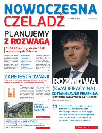 nr 2 (4) wrzesień 2014 gazeta bezpłatna PLANUJEMY Z ROZWAGĄ 11.09.2014 r. o godzinie 18.00 zapraszamy do Odeonu Spotkamy się z czterema burmistrzami miast i jednym starostą powiatowym. Porozmawiamy o różnych metodach zarządzania, o różnych strukturach urzędów w tych samych warunkach zewnętrznych naszego województwa i państwa. Naszymi gośćmi będą: • Dariusz Skrobol – Pszczyna • Zdzisław Banaś – Siewierz • Andrzej Szafraniec – Orzesze • Edward Maniura – Lubliniec • Rafał Krupa – Powiat Zawierciański Warto przyjść, warto dowiedzieć się jak to robią inni, warto zadać pytania. Jak u nich z pomocą dla sportu? Czy i u nich największą placówką kulturalną jest nie miejski, a Spółdzielczy Dom Kultury? Jak rozwiązują problemy komunalne? I wiele innych. NCz ZAREJESTROWANI! 28.08.2014 r. dokonano rejestracji Komitetu Wyborczego Wyborców Nowoczesna Czeladź Stanisława Pisarka. T o pierwszy zarejestrowany Komitet Wyborczy w Czeladzi, a siódmy w województwie śląskim. Tym samym w Czeladzi rozpoczęto wyborczą walkę. Byle tylko była to czysta i merytoryczna rywalizacja. KWW Nowoczesna Czeladź deklaruje niezależność, a jednym z jego haseł jest: ONI TO ROBIĄ DLA WŁADZY, MY DLA CZELADZI. Odcinają sią od polityki. Chcą działać w ramach swej małej ojczyzny a celem jest lepsza władza samorządowa w naszym mieście. NCz MIASTO ZARABIA NA ŚMIECIACH czytaj na str 6 NIEZALEŻNI z SOSNOWCA Rozmowa z Maciejem Adamcem, prezesem stowarzyszenia Niezależni Sosnowiec i kandydatem na prezydenta miasta w nadchodzących wyborach samorządowych czytaj na str 4 ROZMOWA (KWALIFIKACYJNA) ZE STANISŁAWEM PISARKIEM, kandydatem na burmistrza miasta Czeladź Rozmawia: Tomasz Cukiernik Jeśli trawa ma być przycięta – to będzie przycięta. Jeśli powstanie bałagan z dowolnego powodu – zadbam o jego usunięcie. Jeśli się sprawnie zarządza tym, co jest do dyspozycji – zmniejszają się przede wszystkim koszty utrzymania. Wywiad na str 2 2 nr 4/2014 wrzesień 2014 NOWOCZESNA CZELADŹ ROZMOWA (KWALIFIKACYJNA) ZE STANISŁAWEM PISARKIEM, kandydatem na burmistrza miasta Czeladź Współczesna Czeladź sprawia wrażenie rozkręconych – lub skręconych przypadkowo – części. A monterowi gdzieś po drodze zgubiła się instrukcja obsługi. Kiedyś trzeba to jednak poskładać w spójną całość. Nazwisko „Pisarek” przewija się w Polsce w co najmniej kilku znanych wcieleniach. Śpiewająca Regina Pisarek, Walery Pisarek – wyrocznia językowa... Rodzina? Koneksje? Konszachty rodzinne? Rysowanie drzewa genealogicznego tym razem sobie podarujemy. „Stanisław Pisarek” nie jest najbardziej znanym „nosicielem” tego nazwiska, ale ma też trochę dokonań na swoim koncie. Częściej opowiadam historie innych ludzi. Od lat wydaję książki na ich temat. Własną – bardzo rzadko. O sobie nie bardzo lubię opowiadać. Ale tym razem trzeba się przełamać... Stanowisko, o które się ubiegasz, będzie również tego wymagało. Tak, ale zdecydowanie bardziej interesujące są konkretne zamierzenia niż rzeka zwierzeń na własny temat jakiegoś kandydata do tej czy innej funkcji. To przejdźmy do rzeczy... Wspinam się, nurkuję, latam szybowcem i na paralotni. W pierwszej dużej wyprawie uczestniczyłem mając zaledwie 17 lat. Pojechałem wtedy w góry Dżilo na granicy Turcji i Iranu. Potem już było tylko ciekawiej. Jeździłem rowerem na pustyni Atacama w Chile i po terenach wyschniętych jezior w Boliwii, wchodziłem na wulkany Meksyku i Ekwadoru, schodziłem do wietnamskich jaskiń, łowiłem ryby w jeziorze Malawi... Uczyłeś się wtedy nowoczesnej ekonomii? Przede wszystkim wtedy logistyka stała się dla mnie bardzo prostym zajęciem. A to wiedza bardzo użyteczna. Dzięki temu mojemu oglądaniu świata bardziej czuję się jego obywatelem niż patriotą jednego niewielkiego państwa czy narodu. Kontakt z innymi kulturami pozwala dostrzec absurd dążenia jednej nacji lub religii do dominacji. Oczywiście tylko wtedy jeżeli ktoś ma skłonność i ochotę przyjrzeć się temu bliżej. W wielu miejscach na świecie podpatrywałem również praktyczne rozwiązania, które cywilizacje wytworzyły dla własnego pożytku, a nie na przekór sobie. Przyglądałeś się też systemom władzy, zarządzania, obowiązującej hierarchii? Temu uważnie przyglądam się od lat. Nie tylko na świecie, ale też w swoim najbliższym otoczeniu. Jedna reguła sprawdza się wszędzie. Żeby w ogóle móc dobrze czymś zarządzać – i to jest warunek konieczny - kandydat do czegokolwiek musi wiedzieć, do czego startuje. Czym będzie zajmował się „potem„. Wielokrotnie propagowałem obowiązkowe testy dla kandydatów w wyborach samorządowych. Będę to nadal uporczywie forsował. To powinno stać się zasadą ogólnopolską. Spore grono kandydatów nie wie nawet, do czego startuje. Nie odróżnia samorządu od urzędu, poziomu lokalnego od regionalnego itd. Testowanie kandydatów pozwoliłoby w przyszłości wyeliminować ludzi, którzy nawet nie wiedzą, na jaką wycieczkę się zapisali. Zakładam, że Ty wiesz. Zdajesz sobie jednak sprawę, że nie wszystko zależy od burmistrza? Że niektóre decyzje będziesz musiał podjąć, bo jakiś obowiązujący przepis Cię do tego obliguje? Wiem. Jestem przygotowany do zajęć. Mam także wpojone zacięcie społecznika i jeszcze mi nie przeszło. Nie należę do teoretyków. Mam wieloletnie doświadczenie w prowadzeniu firmy zatrudniającej kilkadziesiąt osób. Gdyby ich było kilkaset – zmieniłbym parę rozwiązań organizacyjnych i też bym sobie poradził. W Polsce system wyborczy powoduje, że władzę uzyskują głównie działacze partyjni. Nie zaś orły zarządzania. W Czeladzi to samo – od lat te same twarze... Sam niewiele zdziałasz. Trzeba także mieć swoją „grupę uderzeniową”. Skoro nie masz lokalnych układów – musisz mieć sprawdzonych i pracowitych ludzi. Wiel