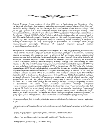 Andrzej Waldemar Cebula, urodzony 23 lipca 1954 roku w Sandomierzu, syn Stanisława i Anny z d. Kwiecień, mieszkaniec Andruszkowic, regionalista, promotor kultury i tradycji tzw. „Małych Ojczyzn”. Pochodzi z rodziny chłopskiej. Ma dwóch starszych braci - Aleksandra i Adama. Rodzice Andrzeja Cebuli już nie żyją, ojciec w 1939 r. służył w Wojsku Polskim, brał czynny udział w wojnie obronnej. Został odznaczony Medalem za udział w Wojnie Obronnej w 1939 roku, Krzyżem Partyzanckim oraz Medalem za Zwycięstwo i Wolność 9.V.1945r. Andrzej Cebula po ukończeniu siódmego roku życia rozpoczął naukę w VIII klasowej Szkole Podstawowej w Złotej gm. Samborzec. Należał do drużyny harcerskiej, pełnił funkcję przybocznego. Od 1969 roku kontynuował naukę w Zasadniczej Szkole Zawodowej a następnie w Technikum Budowlanym im. prof. Strzeleckiego w Sandomierzu. W Technikum pełnił funkcję przewodniczącego Samorządu Klasowego. Po zajęciach szkolnych pomagał rodzicom w niewielkim gospodarstwie rolnym. Po ukończeniu sandomierskiego Technikum Budowlanego w 1974 roku podjął pierwszą pracę zawodowa i przez wiele lat pracował w Zakładzie Górniczo- Budowlanym „Siarkopol” w Piasecznie na stanowisku sztygara zmianowego. Za nienaganną pracę w górnictwie był wyróżniany wieloma odznaczeniami resortowymi m.in. Srebrną Odznaką Zasłużony dla Budownictwa i Przemysłu Materiałów Budowlanych, Brązowym i Srebrnym Krzyżem Zasługi. Studiował na Akademii Górniczo - Hutniczej im. Stanisława Staszica w Krakowie. Andrzej Cebula interesuje się historią i tradycją Ziemi Sandomierskiej. Od czasu przejścia w 1992 roku na rentę realizuje swoje pasje poznawania i krzewienia historii regionu. Od 1997 roku jest przewodnikiem świętokrzyskiego oddziału PTTK w Sandomierzu. Od 2009 roku jako instruktor przewodnictwa PTTK kształci młode pokolenie przewodników. Ponadto jest członkiem Komisji Rewizyjnej Wojewódzkiego Porozumienia Oddziałów PTTK Regionu Świętokrzyskiego w Kielcach. Od 2013 roku jest członkiem Zarządu Oddziału PTTK w Sandomierzu oraz członkiem Zarządu Koła Przewodników Świętokrzyskich w Sandomierzu. Został odznaczony Srebrną Odznaką PTTK. Andrzej Cebula publikuje, na łamach „Zeszytów Przewodnickich” opracowania szkoleniowe w zakresie obsługi, sposobu i metod oprowadzania wycieczek. Jest pilotem wycieczek turystycznych i prowadzi szkolenia przewodnickie. W latach 2011 - 2013 pełnił funkcję Prezesa Fundacji Kultury i Tradycji Europejskiej "Paradosi" w Sandomierzu. W czasie swojej dwuletniej działalności Fundacja zainicjowała i objęła patronatem wydanie serii Biblioteki Tradycji Sandomierskiej, przez Wydawnictwo Armoryka. Było to ponad 20 książek na temat historii, kultury oraz życia mieszkańców Sandomierza i historycznej Sandomierszczyzny. Od 2013 roku Andrzej Cebula jest prezesem Stowarzyszenia „Sandomierska Strefa”. Ponadto jest współzałożycielem i redaktorem naczelnym lokalnego czasopisma „Sandomierska Strefa”, do której napisał ponad 40 artykułów na temat historii ziemi sandomierskiej i tradycji jej mieszkańców. Na uwagę zasługuje fakt, że Andrzej Cebula jest autorem wielu książek poświęconych tematyce regionalnej, w tym: - pierwszej monografii swojej rodzinnej wsi, położonej w gminie Samborzec „Andruszkowice”/ Sandomierz 2011/ - książki „Figury, krzyże i kapliczki w gminie Samborzec” / Sandomierz 2012/ - albumu / we współautorstwie/ „Samborzeckie urokliwości” / Samborzec 2011/ - monografii wsi „Gorzyczany” / Sandomierz 2014/ - książki poświęconej wszystkim 28 miejscowościom w gminie Samborzec „Zarys historyczny miejscowości gminy Samborzec” / 2015/ - opracowania „Historia zmagań wojennych w 1809 roku. Bitwa Wrzawska”, w którym opisuje historię ciężkich walk o Sandomierz i skutki tej bitwy, oraz 25 artykułów o regionie i historii miejscowości w gminie Samborzec, opublikowanych na łamach „Tygodnika Nadwiślańskiego”. Monografia wsi „Gorzyczany” znalazła bardzo wielu czytelników zarówno wśród mieszkańców Gorzyczan, jak i osób zamieszkałych w rejonie, oraz zdobyła wysokie uznanie miejscowej społeczności. Równie dużą popularnością cieszyła się książka pt.: „Figury, krzyże i kapliczki w gminie Samborzec”. Wydanie książki przyczyniło się do odnowienia w wielu wioskach w gminie nadwątlonych figur i krzyży. Wydawnictwo Armoryka ceniąc pasję Pana Andrzeja Cebuli, jego wiedzę na temat regionu i umiejętności przekazywania jej szerokiemu gronu czytelników, podjęło się wydania książki pt.: „Zarys historyczny miejscowości gminy Samborzec”, która opisuje historię, dokumentuje tradycje i obrzędy miejscowej ludności. Pan Andrzej Cebula aktualnie pracuje nad pierwszą w dziejach regionu monografią wszystkich cmentarzy w gminie Samborzec tj. w Skotnikach Sandomierskich, w Chobrzanach i Samborcu. Prace nad monografią są już zaawansowane. Andrzej Cebula jest także kolekcjonerem różnych starych regionalnych przedmiotów użytkowych. W swoich zbiorach posiada między innymi ponad 200 żelazek na węgiel, duszę i spirytus. Swoje zbiory pokazuje i udostępnia nieodpłatnie mieszkańcom na organizowanych przez siebie wystawach. Pokazuje również na spotkaniach z dziećmi w szkołach i przedszkolach oraz nieodpłatnie oprowadza wycieczki szkolne. W 2013 i 2014 roku został nominowany na Człowieka Roku Województwa Świętokrzyskiego. Większość działań Pana Andrzeja Cebuli, które mają na celu promowanie kultury i tradycji Ziemi Sandomierskiej, są to działania społeczne, za które nie pobiera On wynagrodzenia. W dzisiejszych czasach, w których ogromna część społeczeństwa nastawiona jest na zysk, jego społecznikowskie nastawienie należy do absolutnej rzadkości i zasługuje na uznanie i wyróżnienie. Pan Andrzej Cebula jako pasjonat, aktywnie działający, ceniony, lubiany i szanowan
