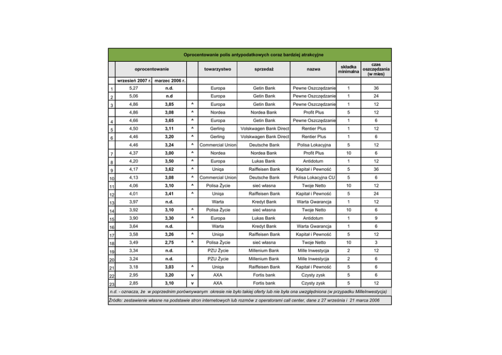 Oprocentowanie polis antypodatkowych coraz bardziej atrakcyjne oprocentowanie towarzystwo sprzedaż nazwa czas składka oszczędzania minimalna (w mies) wrzesień 2007 r. marzec 2006 r. 1 5,27 n.d. Europa Getin Bank Pewne Oszczędzanie 1 36 2 5,06 n.d Europa Getin Bank Pewne Oszczędzanie 1 24 3 4,86 3,85 ^ Europa Getin Bank Pewne Oszczędzanie 1 12 4,86 3,08 ^ Nordea Nordea Bank Profit Plus 5 12 4 4,66 3,65 ^ Europa Getin Bank Pewne Oszczędzanie 1 6 5 4,50 3,11 ^ Gerling Volskwagen Bank Direct Rentier Plus 1 12 6 4,46 3,20 ^ Gerling Volskwagen Bank Direct Rentier Plus 1 6 4,46 3,24 ^ Commercial Union Deutsche Bank Polisa Lokacyjna 5 12 7 4,37 3,00 ^ Nordea Nordea Bank Profit Plus 10 6 8 4,20 3,50 ^ Europa Lukas Bank Antidotum 1 12 9 4,17 3,62 ^ Uniqa Raiffeisen Bank Kapitał i Pewność 5 36 10 4,13 3,08 ^ Commercial Union Deutsche Bank Polisa Lokacyjna CU 5 6 11 4,06 3,10 ^ Polisa Życie sieć własna Twoje Netto 10 12 12 4,01 3,41 ^ Uniqa Raiffeisen Bank Kapitał i Pewność 5 24 13 3,97 n.d. Warta Kredyt Bank Warta Gwarancja 1 12 14 3,92 3,10 ^ Polisa Życie sieć własna Twoje Netto 10 6 15 3,90 3,30 ^ Europa Lukas Bank Antidotum 1 9 16 3,64 n.d. Warta Kredyt Bank Warta Gwarancja 1 6 17 3,58 3,26 ^ Uniqa Raiffeisen Bank Kapitał i Pewność 5 12 18 3,49 2,75 ^ Polisa Życie sieć własna Twoje Netto 10 3 19 3,34 n.d. PZU Życie Millenium Bank Mille Inwestycja 2 12 20 3,24 n.d. PZU Życie Millenium Bank Mille Inwestycja 2 6 21 3,18 3,03 ^ Uniqa Raiffeisen Bank Kapitał i Pewność 5 6 22 2,95 3,20 v AXA Fortis bank Czysty zysk 5 6 23 2,85 3,10 v AXA Fortis bank Czysty zysk 5 12 n.d. - oznacza, że w poprzednim porównywanym okresie nie było takiej oferty lub nie była ona uwzględniona (w przypadku MilleInwestycja) Źródło: zestawienie własne na podstawie stron internetowych lub rozmów z operatorami call center, dane z 27 września i 21 marca 2006