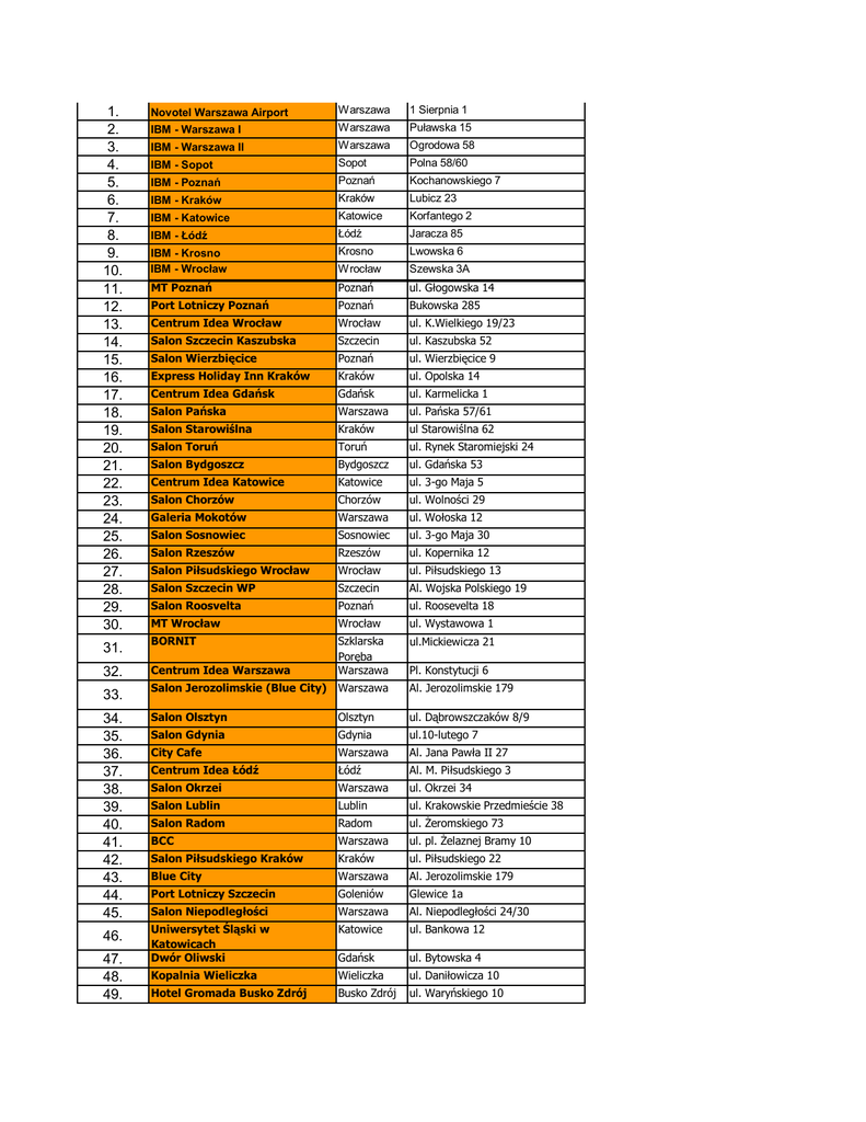 1. 2. 3. 4. 5. 6. 7. 8. 9. 10. 11. 12. 13. 14. 15. 16. 17. 18. 19. 20. 21. 22. 23. 24. 25. 26. 27. 28. 29. 30. 31. 32. 33. 34. 35. 36. 37. 38. 39. 40. 41. 42. 43. 44. 45. 46. 47. 48. 49. Novotel Warszawa Airport Warszawa 1 Sierpnia 1 IBM - Warszawa I Warszawa Puławska 15 IBM - Warszawa II Warszawa Ogrodowa 58 IBM - Sopot Sopot Polna 58/60 IBM - Poznań Poznań Kochanowskiego 7 IBM - Kraków Kraków Lubicz 23 IBM - Katowice Katowice Korfantego 2 IBM - Łódź Łódź Jaracza 85 IBM - Krosno IBM - Wrocław Krosno Lwowska 6 Wrocław Szewska 3A MT Poznań Poznań ul. Głogowska 14 Port Lotniczy Poznań Poznań Bukowska 285 Centrum Idea Wrocław Wrocław ul. K.Wielkiego 19/23 Salon Szczecin Kaszubska Szczecin ul. Kaszubska 52 Salon Wierzbięcice Poznań ul. Wierzbięcice 9 Express Holiday Inn Kraków Kraków ul. Opolska 14 Centrum Idea Gdańsk Gdańsk ul. Karmelicka 1 Salon Pańska Warszawa ul. Pańska 57/61 Salon Starowiślna Kraków ul Starowiślna 62 Salon Toruń Toruń ul. Rynek Staromiejski 24 Salon Bydgoszcz Bydgoszcz ul. Gdańska 53 Centrum Idea Katowice Katowice ul. 3-go Maja 5 Salon Chorzów Chorzów ul. Wolności 29 Galeria Mokotów Warszawa ul. Wołoska 12 Salon Sosnowiec Sosnowiec ul. 3-go Maja 30 Salon Rzeszów Rzeszów ul. Kopernika 12 Salon Piłsudskiego Wrocław Wrocław ul. Piłsudskiego 13 Salon Szczecin WP Szczecin Al. Wojska Polskiego 19 Salon Roosvelta Poznań ul. Roosevelta 18 MT Wrocław Wrocław ul. Wystawowa 1 BORNIT ul.Mickiewicza 21 Centrum Idea Warszawa Szklarska Poręba Warszawa Pl. Konstytucji 6 Salon Jerozolimskie (Blue City) Warszawa Al. Jerozolimskie 179 Salon Olsztyn Olsztyn ul. Dąbrowszczaków 8/9 Salon Gdynia Gdynia ul.10-lutego 7 City Cafe Warszawa Al. Jana Pawła II 27 Centrum Idea Łódź Łódź Al. M. Piłsudskiego 3 Salon Okrzei Warszawa ul. Okrzei 34 Salon Lublin Lublin ul. Krakowskie Przedmieście 38 ul. Żeromskiego 73 Salon Radom Radom BCC Warszawa ul. pl. Żelaznej Bramy 10 Salon Piłsudskiego Kraków Kraków ul. Piłsudskiego 22 Blue City Warszawa Al. Jerozolimskie 179 Port Lotniczy Szczecin Goleniów Glewice 1a Salon Niepodległości Warszawa Al. Niepodległości 24/30 Uniwersytet Śląski w Katowicach Dwór Oliwski Katowice ul. Bankowa 12 Gdańsk ul. Bytowska 4 Kopalnia Wieliczka Wieliczka ul. Daniłowicza 10 Hotel Gromada Busko Zdrój Busko Zdrój ul. Waryńskiego 10 50. Hotel Gromada Kielce Kielce 51. Hotel Gromada Ostrowiec Świętokrzyski Ostrowiec Al. 3-go Maja 13 Świętokrzyski 52. 53. 54. 55. 56. 57. 58. 59. 60. 61. 62. 63. 64. 65. 66. 67. 68. 69. 70. 71. 72. 73. 74. 75. 76. 77. 78. 79. 80. 81. 82. 83. 84. 85. 86. 87. 88. 89. 90. 91. 92. 93. 94. 95. Cedzyna k/Kielc Hotel Gromada Piła Piła Al. Piastów 15 Gołębiewski Wisła Wisła ul. Ks. Bp. Bursche 3 Hotel Gromada Olsztyn Olsztyn Pl. Konstytucji 3-go Maja 4 Hotel Gromada Toruń Toruń ul. Żeglarska 10/14 Krzywy Domek "Galeria Pasaż Krzywy Domek" Hotel Nadmorski Sopot ul. Monte Cassino Gdynia ul. Eismonda 2 Hotel 500 Cieszyn Cieszyn ul.Graniczna 46 Hotel Neptun Jurata ul. Mestwina 38 Hotel Gromada Powstańców Warszawa Pl. Powstańców W-wy 2 Hotel Gromada Łomża Łomża ul.Rządowa 1A Computerland Warszawa Al. Jerozolimskie 180 HOTEL MŁYN Włocławek ul. Okrzei 77 Centrum Olimpijskie Warszawa ul. Wybrzeże Gdyńskie 4 Hotel Gromada 17 stycznia Warszawa ul. 17-go Stycznia 32 Port Lotniczy Wrocław Strachowice Stanisława Skarżyńskiego 36 Klimczok Szczyrk ul. Poziomkowa 20 Hotel Gromada Przemyśl Przemyśl ul. Wyb. Marszałka Gołębiewski Mikołajki Mikołajki ul. Mrągowska 34 Alfa Centrum Gdańsk ul. Kołobrzeska 41C International Business Center (IBC) - SPJ Hotel Gromada Zakopane Warszawa ul. Armii Ludowej 14 Zakopane ul. Zaruskiego 2 Litwor Zakopane ul Krupówki 40 Orbis Arkona Szczecin ul. Panieńska 10 Orbis Reda Szczecin ul. Cukrowa 2 Orbis Wanda Kraków Al. Armii Krajowej 15 HOTEL BELWEDER Ustroń ul. Zdrojowa 15 Gąsiorek Bydgoszcz ul. Bydgoska 34 Novotel Gdańsk Marina Gdańsk ul. Jelitkowska 20 Lotnisko Bydgoszcz Bydgoszcz Grodzka 12 Orbis Kosmos Toruń ul. Ks. J. Popiełuszki 2 Hotel HP Park Plaza Wrocław ul. Drobnera 11/13 Akademia Ekonomiczna Wrocław Akademia Ekonomiczna Katowice II Orbis Gdynia Wrocław ul. Komandorska 118/120 Katowice ul. Gen. K. Pułaskiego 25 Gdynia ul. Armii Krajowej 22 Katowice ul. Bogucicka 3 Akademia Ekonomiczna Katowice I Orbis Giewont Zakopane ul. T. Kościuszki 1 Orbis Halny Cieszyn ul. Motelowa 21 Orbis Beskid Nowy Sącz ul. Limanowskiego 1 Orbis Prosna Kalisz ul. Górnośląska 53/55 Hotel Gromada Poznań Poznań ul. Babimojska 7 Mercure Poznań Poznań ul. Roosevelta 20 Jan III Sobieski Warszawa ul. Artura Zawiszy 1 Orbis Neptun Szczecin ul. Matejki 18 Orbis Polonez Poznań Al. Niepodległości 36 96. 97. 98. 99. 100. 101. 102. 103. 104. 105. 106. 107. 108. 109. 110. 111. 112. 113. 114. 115. 116. 117. 118. 119. 120. 121. 122. 123. 124. 125. 126. 127. 128. 129. 130. 131. 132. 133. 134. 135. 136. 137. 138. 139. 140. 141. 142. 143. 144. 145. 146. Mercure Helios Toruń Toruń ul. Kraszewskiego 1/3 Orbis Wrocław Wrocław ul. Powstańców Śląskich 7 Novotel Wrocław Wrocław ul. Wyścigowa 35 Victoria Hotel Lublin ul. Narutowicza 58/60 Orbis Europejski Warszawa Krakowskie Przedmieście 13 Orbis Cracovia Kraków Al. F. Focha 1 Orbis Aria Sosnowiec ul. Kresowa 5/7 Orbis Tranzyt Częstochowa Al. Wojska Polskiego 281/291 Orbis Kasprowy Zakopane ul. Szymaszkowa Novotel Katowice Rondo Katowice Al. W. Roździeńskiego 16 ul. Kapliczna 30 Orbis Posejdon Gdańsk Novotel Gdańsk Centrum Gdańsk ul. Pszenna 1 Mercure Hevelius Gdańsk Gdańsk ul. Heweliusza 22 Stara Papiernia Konstancin Orbis Monopol Wrocław Orbis Magura Bielsko-Biała ul. Żywiecka 93 ul. H. Modrzejewskiej 2 Novotel Kraków Bronowice Kraków Mercure Panorama Wrocław Wrocław Al. Armii Krajowej 11 pl. Dominikański 1 Hotel Gromada Bulwarowa Radom ul. Bulwarowa 15 Hotel Gromada Narutowicza Radom ul. Narutowicza 9 Orbis Polan Zielona Góra ul. S. Staszica 9a Cinnamon Lounge &