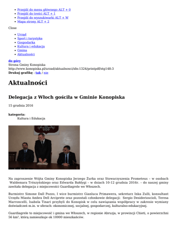 Przejdź do menu głównego ALT + 0 Przejdź do treści ALT + 1 Przejdź do wyszukiwarki ALT + W Mapa strony ALT + 2 Close Urząd Sport i turystyka Gospodarka Kultura i edukacja Gmina Aktualności do góry Strona Gminy Konopiska http://www.konopiska.pl/urzad/aktualnosci/idn:1324/printpdf/stg148:3 Drukuj grafikę : tak / nie Aktualności Delegacja z Włoch gościła w Gminie Konopiska 15 grudnia 2016 kategoria: Kultura i Edukacja Na zaproszenie Wójta Gminy Konopiska Jerzego Żurka oraz Stowarzyszenia Prometeus – w osobach Waldemara Trószyńskiego oraz Edwarda Bałdygi – w dniach 10-12 grudnia 2016r. – do naszej gminy zawitała delegacja z miejscowości Guardiagrele we Włoszech. Burmistrz Simone Dall Pozzo, I wice burmistrz Gianluca Primawera, sekretarz Inka Zulli, konsultant Urzędu Miasta Ambra Dell Arciprete oraz pozostali członkowie delegacji: Sergio Desiderioscioli, Teresa Marroncelli, Isabela Tinari przybyli do Konopisk w celu nawiązania współpracy w zakresie wymiany doświadczeń m.in. w sferach: ekonomicznej, socjalnej, gospodarczej, kulturalno-edukacyjnej. Guardiagrele to miejscowość i gmina we Włoszech, w regionie Abruzja, w prowincji Chieti, o powierzchni 56 km², którą zamieszkuje ok 10000 mieszkańców. Oficjalnego powitania w Urzędzie Gminy w Konopiskach dokonał Wójt Gminy Konopiska Jerzy Żurek. W spotkaniu udział wzięli także: Wicewójt Zofia Kuśmierska, Sekretarz Barbara Ankowska – Lis, Przewodniczący Rady Gminy Edward Bałdyga, Prezes Stowarzyszenia Prometeus Waldemar Trószyński oraz członkini Stowarzyszenia Prometeus, a także tłumacz języka włoskiego Marzena Bladziak. Otwarte rozmowy przybliżyły obu stronom problemy z jakimi muszą na co dzień mierzyć się urzędnicy administracji we Włoszech oraz w Polsce. Z uwagą przysłuchiwano się także zagadnieniom dotyczącym m.in. historii oraz obecnych realiów obu gmin. Burmistrz Simone Dall Pozzo wręczył Wójtowi Jerzemu Żurkowi pamiątkowy, porcelanowy talerz z herbem miasta Guardiagrele. Pozowano również do wspólnych pamiątkowych zdjęć. Jednym z punktów programu wizyty były odwiedziny w placówce szkolnej oraz kulturalnej naszej gminy. Gości powitała Dyrektor Ilona Ujma oraz nauczycielka języka angielskiego Agnieszka Klecha. Włoska delegacja – zwiedzając Gimnazjum im. Henryka Sienkiewicza w Konopiskach wyraziła swój zachwyt nad zasobnością szkoły w pomoce naukowe i edukacyjne, estetyką placówki, kulturą własną i wiedzą uczniów – Victorii Kozik, Kingi Kołodziejczyk, Moniki Kowalczyk i Jakuba Morawca, którzy bardzo chętnie prezentowali swe umiejętności – porozumiewając się z gośćmi płynnie w języku angielskim. Poruszano m.in. tematy międzyszkolnej wymiany uczniów. W siedzibie Gminnego Centrum Kultury i Rekreacji w Konopiskach gości powitała Dyrektor Iwona Lisek. Podczas spotkania poruszano tematykę kultury, sportu oraz zaangażowania społeczności lokalnej w różnorodne inicjatywy. Gościom wręczono podarunki m.in. pamiątkowe kubeczki z herbem Gminy Konopiska, świece oraz bombki z folkowym wzorem a także płyty z nagraniami Koncertów Noworocznych Orkiestry Dętej OSP Konopiska. W trakcie trzydniowej wizyty delegacja - na zaproszenie Stowarzyszenia „Prometeus” odwiedziła także Kraków oraz Muzeum Pamięci Auschwitz-Birkenau. Podczas pożegnalnej kolacji, którą przygotowały Gospodynie z KGW Korzonek, goście z Włoch nie szczędzili słów uznania dla gospodarzy - byli zachwyceni naszą polską gościnnością i otwartością! Wieczór urozmaicili prezentacjami artystycznymi zespoły: Walentynki, Barbórki oraz członkowie Stowarzyszenia Prometeus, którzy przygotowali również niespodziankę w postaci własnoręcznie wykonanych ozdób świątecznych, którymi obdarowali przybyłych gości. Po powrocie do Włoch Sekretarz Inka Zulli - podpisując wspólne zdjęcia wykonane podczas ostatniego spotkania w Korzonku napisała na swoim profilu na FB: „Zostawiam tu kawałek mojego serca, do zobaczenia wkrótce! Dziękuję bardzo!” OM/GCKiR 15 gru 2016 Delegacja z Włoch gościła w Gminie Konopiska Delegacja Delegacja Delegacja Delegacja Delegacja Delegacja Delegacja Delegacja z z z z z z z z Włoch Włoch Włoch Włoch Włoch Włoch Włoch Włoch gościła gościła gościła gościła gościła gościła gościła gościła w w w w w w w w Gminie Gminie Gminie Gminie Gminie Gminie Gminie Gminie Konopiska Konopiska Konopiska Konopiska Konopiska Konopiska Konopiska Konopiska Aktualności - strona 1 Aktualności - strona 2 Aktualności - strona 3 powrót do listy aktualności