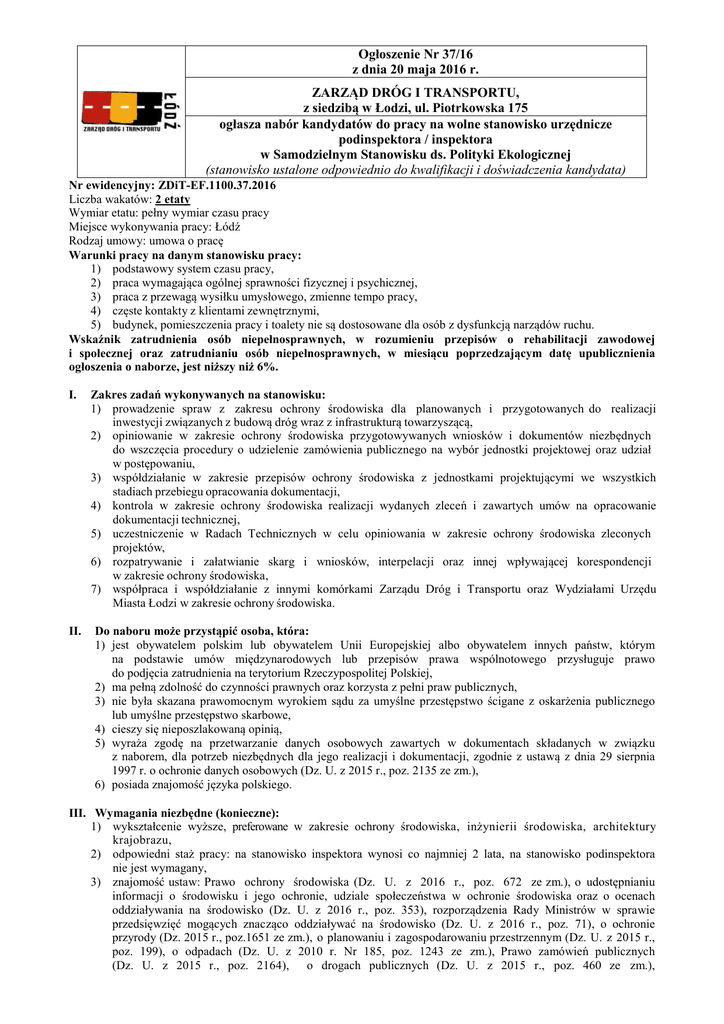 Ogłoszenie Nr 37/16 z dnia 20 maja 2016 r. ZARZĄD DRÓG I TRANSPORTU, z siedzibą w Łodzi, ul. Piotrkowska 175 ogłasza nabór kandydatów do pracy na wolne stanowisko urzędnicze podinspektora / inspektora w Samodzielnym Stanowisku ds. Polityki Ekologicznej (stanowisko ustalone odpowiednio do kwalifikacji i doświadczenia kandydata) Nr ewidencyjny: ZDiT-EF.1100.37.2016 Liczba wakatów: 2 etaty Wymiar etatu: pełny wymiar czasu pracy Miejsce wykonywania pracy: Łódź Rodzaj umowy: umowa o pracę Warunki pracy na danym stanowisku pracy: 1) podstawowy system czasu pracy, 2) praca wymagająca ogólnej sprawności fizycznej i psychicznej, 3) praca z przewagą wysiłku umysłowego, zmienne tempo pracy, 4) częste kontakty z klientami zewnętrznymi, 5) budynek, pomieszczenia pracy i toalety nie są dostosowane dla osób z dysfunkcją narządów ruchu. Wskaźnik zatrudnienia osób niepełnosprawnych, w rozumieniu przepisów o rehabilitacji zawodowej i społecznej oraz zatrudnianiu osób niepełnosprawnych, w miesiącu poprzedzającym datę upublicznienia ogłoszenia o naborze, jest niższy niż 6%. I. Zakres zadań wykonywanych na stanowisku: 1) prowadzenie spraw z zakresu ochrony środowiska dla planowanych i przygotowanych do realizacji inwestycji związanych z budową dróg wraz z infrastrukturą towarzyszącą, 2) opiniowanie w zakresie ochrony środowiska przygotowywanych wniosków i dokumentów niezbędnych do wszczęcia procedury o udzielenie zamówienia publicznego na wybór jednostki projektowej oraz udział w postępowaniu, 3) współdziałanie w zakresie przepisów ochrony środowiska z jednostkami projektującymi we wszystkich stadiach przebiegu opracowania dokumentacji, 4) kontrola w zakresie ochrony środowiska realizacji wydanych zleceń i zawartych umów na opracowanie dokumentacji technicznej, 5) uczestniczenie w Radach Technicznych w celu opiniowania w zakresie ochrony środowiska zleconych projektów, 6) rozpatrywanie i załatwianie skarg i wniosków, interpelacji oraz innej wpływającej korespondencji w zakresie ochrony środowiska, 7) współpraca i współdziałanie z innymi komórkami Zarządu Dróg i Transportu oraz Wydziałami Urzędu Miasta Łodzi w zakresie ochrony środowiska. II. Do naboru może przystąpić osoba, która: 1) jest obywatelem polskim lub obywatelem Unii Europejskiej albo obywatelem innych państw, którym na podstawie umów międzynarodowych lub przepisów prawa wspólnotowego przysługuje prawo do podjęcia zatrudnienia na terytorium Rzeczypospolitej Polskiej, 2) ma pełną zdolność do czynności prawnych oraz korzysta z pełni praw publicznych, 3) nie była skazana prawomocnym wyrokiem sądu za umyślne przestępstwo ścigane z oskarżenia publicznego lub umyślne przestępstwo skarbowe, 4) cieszy się nieposzlakowaną opinią, 5) wyraża zgodę na przetwarzanie danych osobowych zawartych w dokumentach składanych w związku z naborem, dla potrzeb niezbędnych dla jego realizacji i dokumentacji, zgodnie z ustawą z dnia 29 sierpnia 1997 r. o ochronie danych osobowych (Dz. U. z 2015 r., poz. 2135 ze zm.), 6) posiada znajomość języka polskiego. III. Wymagania niezbędne (konieczne): 1) wykształcenie wyższe, preferowane w zakresie ochrony środowiska, inżynierii środowiska, architektury krajobrazu, 2) odpowiedni staż pracy: na stanowisko inspektora wynosi co najmniej 2 lata, na stanowisko podinspektora nie jest wymagany, 3) znajomość ustaw: Prawo ochrony środowiska (Dz. U. z 2016 r., poz. 672 ze zm.), o udostępnianiu informacji o środowisku i jego ochronie, udziale społeczeństwa w ochronie środowiska oraz o ocenach oddziaływania na środowisko (Dz. U. z 2016 r., poz. 353), rozporządzenia Rady Ministrów w sprawie przedsięwzięć mogących znacząco oddziaływać na środowisko (Dz. U. z 2016 r., poz. 71), o ochronie przyrody (Dz. 2015 r., poz.1651 ze zm.), o planowaniu i zagospodarowaniu przestrzennym (Dz. U. z 2015 r., poz. 199), o odpadach (Dz. U. z 2010 r. Nr 185, poz. 1243 ze zm.), Prawo zamówień publicznych (Dz. U. z 2015 r., poz. 2164), o drogach publicznych (Dz. U. z 2015 r., poz. 460 ze zm.), 4) 5) 6) 7) o szczególnych zasadach przygotowania i realizacji inwestycji w zakresie dróg publicznych (Dz. U. z 2015 r., poz. 2031 ze zm.) oraz innych niezbędnych do wykonywania powierzonych obowiązków, umiejętność korzystania z przepisów, ich interpretacji i stosowania, umiejętność płynnego formułowania myśli, redagowania pism urzędowych, umiejętność obsługi komputera (MS Office, Internet), posiadanie następujących cech osobowości i umiejętności psychospołecznych: umiejętność planowania i organizowania pracy, umiejętność pracy w zespole, umiejętność skutecznego komunikowania się, umiejętność analizy i syntezy informacji, poczucie odpowiedzialności za realizowane zadania. IV. Wymagania dodatkowe (pożądane): 1) prawo jazdy kat. B, 2) doświadczenie w pracy w administracji publicznej na stanowisku o podobnym zakresie obowiązków, 3) umiejętność obsługi programów PHOTOSHOP, CorelDRAW. V. Oferta kandydata musi zawierać: 1) życiorys (CV), 2) list motywacyjny, 3) kserokopię dokumentu potwierdzającego posiadanie obywatelstwa polskiego (dowód osobisty) lub obywatelstwa Unii Europejskiej albo obywatelstwa innego państwa, w przypadku osób, którym na podstawie umów międzynarodowych lub przepisów prawa wspólnotowego przysługuje prawo do podjęcia zatrudnienia na terytorium Rzeczypospolitej Polskiej, 4) kserokopię dokumentu potwierdzającego znajomość języka polskiego określonego w przepisach o służbie cywilnej – wymagane w przypadku osób posiadających obywatelstwo Unii Europejskiej albo obywatelstwo innego państwa, którym na podstawie umów międzynarodowych lub przepisów prawa wspólnotowego przysługuje prawo do podjęcia zatrudnienia na terytorium Rzeczypospolitej Polskiej, 5) odpisy lub kserokopie dokumentów potwierdzających uzyskany poziom wykształcenia (dyp