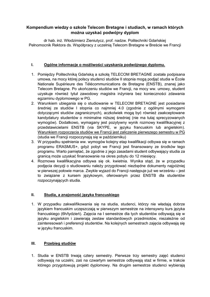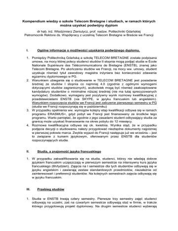 Kompendium wiedzy o szkole Telecom Bretagne i studiach, w ramach których można uzyskać podwójny dyplom dr hab. inż. Włodzimierz Zieniutycz, prof. nadzw. Politechniki Gdańskiej Pełnomocnik Rektora ds. Współpracy z uczelnią Telecom Bretagne w Breście we Francji I. Ogólne informacje o możliwości uzyskania podwójnego dyplomu. 1. Pomiędzy Politechniką Gdańską a szkołą TELECOM BRETAGNE została podpisana umowa, na mocy której polscy studenci studiów II stopnia mogą podjąć studia w École Nationale Supérieure des Télécommunications de Bretagne (ENSTB), znanej jako Telecom Bretagne. Po ukończeniu studiów we Francji, na mocy ww. umowy, student uzyskuje również tytuł zawodowy magistra inżyniera bez konieczności zdawania egzaminu dyplomowego w PG. 2. Warunkiem ubiegania się o studiowanie w TELECOM BRETAGNE jest posiadanie średniej ze studiów I stopnia co najmniej 4.0 (zgodnie z ogólnymi wymogami dotyczącymi studiów zagranicznych), aczkolwiek mogą być również zaakceptowane kandydatury studentów o minimalne niższej średniej (nie ma tutaj sprecyzowanych wymogów). Dodatkowo, wymagany jest pozytywny wynik rozmowy kwalifikacyjnej z przedstawicielami ENSTB (via SKYPE, w języku francuskim lub angielskim). Warunkiem rozpoczęcia studiów we Francji jest zaliczenie pierwszego semestru w PG (studia we Francji rozpoczynają się w październiku) 3. W przypadku spełnienia ww. wymogów kolejny etap kwalifikacji odbywa się w ramach programu ERASMUS+, gdyż pobyt we Francji jest finansowany ze środków tego programu. Warto pamiętać, że zgodnie z jego zasadami student odbywający studia za granicą może uzyskać finansowanie na okres pobytu do 12 miesięcy. 4. Rozmowa kwalifikacyjna odbywa się ok. kwietnia. Wynika stąd, że w przypadku podjęcia decyzji o studiowaniu należy przygotować niezbędne dokumenty najpóźniej w pierwszej połowie marca. Zwykle wyjazd do Francji następuje już we wrześniu – jest to związane z kursem językowym, oferowanym przez ENSTB dla studentów rozpoczynających studia. II. Studia, a znajomość języka francuskiego 1. W przypadku zakwalifikowania się na studia, studenci, którzy nie władają dobrze językiem francuskim uczęszczają w pierwszym semestrze na intensywny kurs języka francuskiego (6h/tydzień). Zajęcia na I semestrze dla tych studentów odbywają się w języku angielskim i zawierają zestaw standardowych przedmiotów, niezależnie od zainteresowań i preferencji studentów. Na kolejnych semestrach zajęcia odbywają się w języku francuskim. III. Przebieg studiów 1. Studia w ENSTB trwają cztery semestry. Pierwsze trzy semestry zajęć studenci odbywają na uczelni, zaś na czwartym semestrze odbywają staż w firmie, w trakcie którego przygotowują projekt dyplomowy. Na drugim semestrze studenci wybierają przedmioty z kilku dziedzin, zaś na trzecim semestrze wybierają ścieżkę spośród kilku opcji. Wygląda to trochę skomplikowanie - szczegóły są dostępne na stronie uczelni. 2. Projekt dyplomowy (wyniki realizacji projektu w trakcie stażu) jest prezentowany w języku angielskim przed komisją, składającą się z przedstawiciela ENSTB, firmy, w której wykonywano projekt oraz przedstawiciela PG. Prezentacja wyników stażu odbywa się zwykle we wrześniu. Na początku wykonywania projektu należy skontaktować się z PG (z katedrą macierzystą) celem wyznaczenia opiekuna projektu z strony PG, który sprawdzi, czy wykonana praca spełnia również wymogi stawiane pracom magisterskim w PG. Ogólne informacje o uczelni TELECOM BRETAGNE IV. TELECOM BRETAGNE należy do grupy tzw. „Grandes Ecoles”. Mianem tym określa się szkoły reprezentujące najwyższy poziom kształcenia i badań naukowych, co gwarantuje szybkie uzyskanie zatrudnienia we Francji. Przykładowo, z danych za rok 2014 wynika, że w okresie trzech miesięcy po uzyskaniu dyplomu 76% absolwentów uzyskało pracę. Na uczelni studiuje ok. 1200 studentów, przy czym blisko 50 % to cudzoziemcy. Spośród 1200 studentów 800 studiuje na studiach inżynierskich, zaś pozostali na studiach wyższych stopni (w tym doktoranckich). Personel uczelni stanowi blisko 370 pracowników. Uczelnia mieści się wprawdzie w Breście, ale ma swoje filie w Rennes (sieci mobilne, bezpieczeństwo w sieci) i w Tuluzie (telekomunikacja kosmiczna). Ze względu na swoją wysoką pozycję uczelnia ma dobre kontakty z firmami i innymi instytucjami naukowymi, w których studenci mogą odbywać praktyki. Więcej informacji można znaleźć w sieci, na stronie uczelni: http://www.telecom-bretagne.eu/ Warto także poszukać informacji o uczelni w internecie, pod ww. hasłem. Trzeba pamiętać, że organizacja szkolnictwa wyższego we Francji nie jest tak przejrzysta jak w Polsce – wiele szkół ze sobą współpracuje, bądź jest ze sobą silnie powiązanych. Można się o tym przekonać przeglądając stronę Wikipedii poświęconą uczelni: https://en.wikipedia.org/wiki/%C3%89cole_nationale_sup%C3%A9rieure_des_t%C3 %A9l%C3%A9communications_de_Bretagne Dla pragnących rozpocząć przygodę z językiem francuskim polecam wersję francuską: https://fr.wikipedia.org/wiki/T%C3%A9l%C3%A9com_Bretagne W chwili obecnej w Breście przebywają polscy studenci, z którymi mamy kontakt. Dysponujemy również adresami absolwentów, którzy we wrześniu 2015 r. ukończyli studia w Rennes. Możliwość korespondencji z osobami, które przeszły pełny cykl studiów pozwoli Wam na w pełni świadome podjęcie tak ważnej decyzji. Osoby zainteresowane tymi studiami mogą się ze mną skontaktować: drogą mailowa: [email protected] telefonicznie: +58.347.17.58 osobiście: gmach EA pok. 724.