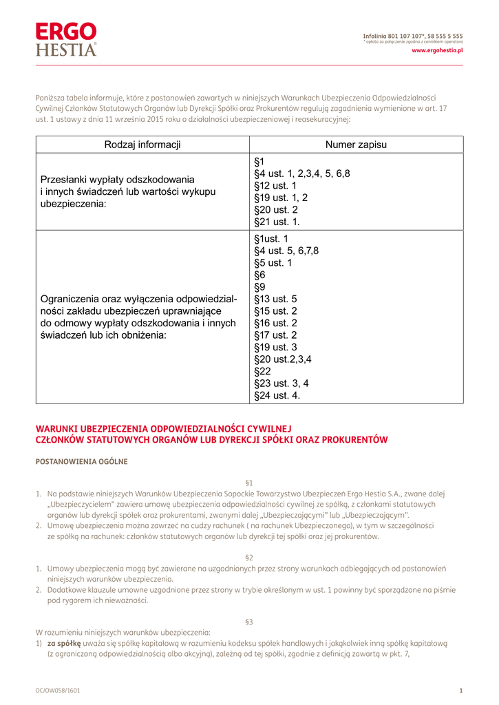 Infolinia 801 107 107*, 58 555 5 555 * opłata za połączenie zgodna z cennikiem operatora www.ergohestia.pl Poniższa tabela informuje, które z postanowień zawartych w niniejszych Warunkach Ubezpieczenia Odpowiedzialności Cywilnej Członków Statutowych Organów lub Dyrekcji Spółki oraz Prokurentów regulują zagadnienia wymienione w art. 17 ust. 1 ustawy z dnia 11 września 2015 roku o działalności ubezpieczeniowej i reasekuracyjnej: Rodzaj informacji Numer zapisu Przesłanki wypłaty odszkodowania i innych świadczeń lub wartości wykupu ubezpieczenia: §1 §4 ust. 1, 2,3,4, 5, 6,8 §12 ust. 1 §19 ust. 1, 2 §20 ust. 2 §21 ust. 1. Ograniczenia oraz wyłączenia odpowiedzialności zakładu ubezpieczeń uprawniające do odmowy wypłaty odszkodowania i innych świadczeń lub ich obniżenia: §1ust. 1 §4 ust. 5, 6,7,8 §5 ust. 1 §6 §9 §13 ust. 5 §15 ust. 2 §16 ust. 2 §17 ust. 2 §19 ust. 3 §20 ust.2,3,4 §22 §23 ust. 3, 4 §24 ust. 4. WARUNKI UBEZPIECZENIA ODPOWIEDZIALNOŚCI CYWILNEJ CZŁONKÓW STATUTOWYCH ORGANÓW LUB DYREKCJI SPÓŁKI ORAZ PROKURENTÓW POSTANOWIENIA OGÓLNE §1 1. Na podstawie niniejszych Warunków Ubezpieczenia Sopockie Towarzystwo Ubezpieczeń Ergo Hestia S.A., zwane dalej „Ubezpieczycielem” zawiera umowę ubezpieczenia odpowiedzialności cywilnej ze spółką, z członkami statutowych organów lub dyrekcji spółek oraz prokurentami, zwanymi dalej „Ubezpieczającymi” lub „Ubezpieczającym”. 2. Umowę ubezpieczenia można zawrzeć na cudzy rachunek ( na rachunek Ubezpieczonego), w tym w szczególności ze spółką na rachunek: członków statutowych organów lub dyrekcji tej spółki oraz jej prokurentów. §2 1. Umowy ubezpieczenia mogą być zawierane na uzgodnionych przez strony warunkach odbiegających od postanowień niniejszych warunków ubezpieczenia. 2. Dodatkowe klauzule umowne uzgodnione przez strony w trybie określonym w ust. 1 powinny być sporządzone na piśmie pod rygorem ich nieważności. §3 W rozumieniu niniejszych warunków ubezpieczenia: 1) za spółkę uważa się spółkę kapitałową w rozumieniu kodeksu spółek handlowych i jakąkolwiek inną spółkę kapitałową (z ograniczoną odpowiedzialnością albo akcyjną), zależną od tej spółki, zgodnie z definicją zawartą w pkt. 7, OC/OW058/1601 1 Infolinia 801 107 107*, 58 555 5 555 * opłata za połączenie zgodna z cennikiem operatora www.ergohestia.pl 2) za Ubezpieczającego lub Ubezpieczających uważa się odpowiednio spółkę lub określonych w umowie imiennie, bezimiennie lub co do członkostwa w określonym organie spółki obecnych, byłych lub przyszłych członków władz (zarządu, rady nadzorczej i komisji rewizyjnej wpisanych do rejestru handlowego, z wyłączeniem likwidatorów) lub dyrekcji spółki oraz prokurentów spółki, o ile z zakresu posiadanych przez nich pełnomocnictw i ciążących na nich obowiązków wynika, iż mają wpływ na całokształt działalności spółki, 3) za uchybienie uważa się zawinione, nieumyślne działanie lub zaniechanie ubezpieczającego lub ubezpieczonego, polegające na niewykonaniu lub nienależytym wykonaniu obowiązków nałożonych na niego przez przepisy prawa, w szczególności kodeksu spółek handlowych, albo postanowienia umowy spółki lub statutu, lub na przekroczeniu pełnomocnictw, 4) za szkodę uważa się określony w pieniądzu uszczerbek majątkowy poniesiony przez spółkę lub jakąkolwiek osobę trzecią, z wyłączeniem bezpośrednich lub pośrednich skutków uszkodzenia ciała, rozstroju zdrowia lub śmierci albo naruszenia dóbr osobistych jakiejkolwiek osoby oraz uszkodzenia, zniszczenia, ubytku, utraty lub pozbawienia możliwości użytkowania rzeczy ruchomej albo nieruchomości, 5) za wypadek uważa się uchybienie Ubezpieczającego (Ubezpieczonego), objęte jego odpowiedzialnością cywilną, w wyniku którego osoba trzecia lub spółka poniosły określony w pieniądzu uszczerbek majątkowy z zastrzeżeniem wyłączeń wskazanych powyżej w pkt 4) i w pozostałych postanowieniach niniejszych Ogólnych Warunków Ubezpieczenia, przy czym wszystkie roszczenia wynikające z tego samego uchybienia uważa się za jedno roszczenie i przyjmuje się, że zostały zgłoszone w chwili zgłoszenia pierwszego roszczenia, 6) za datę początkową uważa się określoną w umowie datę rozpoczęcia odpowiedzialności Ubezpieczyciela w pierwszej umowie ubezpieczenia odpowiedzialności cywilnej członków statutowych organów lub dyrekcji spółki oraz prokurentów, zawartej przez Ubezpieczającego z Ubezpieczycielem, przy zachowaniu takich samych warunków i ciągłości ubezpieczenia; w przypadku zmiany warunków lub przerwania ciągłości ubezpieczenia za datę początkową uważa się datę rozpoczęcia odpowiedzialności Ubezpieczyciela w nowej umowie, 7) za spółkę zależną uważa się spółkę kapitałową, w której spółka, o której mowa w pkt 1), posiada bezpośrednio lub pośrednio (poprzez inne spółki zależne) więcej niż 50% udziałów lub akcji oraz praw głosu na zgromadzeniu wspólników lub walnym zgromadzeniu; za spółkę zależną uważa się również każdą nową spółkę kapitałową, która powstanie jako zależna lub stanie się zależna po zawarciu umowy ubezpieczenia, pod warunkiem że w ciągu 90 dni od tej chwili spółka, o której mowa w pkt 1), dostarczy Ubezpieczycielowi pełną informację na temat nowej spółki zależnej; w takim wypadku ochrona obejmuje nową spółkę zależną pod warunkiem opłacenia dodatkowej składki i włączenia do umowy ewentualnych dodatkowych postanowień wymaganych przez Ubezpieczyciela, 8) za franszyzę redukcyjną uważa się określoną w procentach lub kwotowo wartość redukującą łączne świadczenia ubezpieczeniowe z tytułu jednego wypadku, dotyczące również kosztów, o których mowa w §20, 9) za osoby trzecie uważa się wszystkie osoby pozostające poza stosunkiem ubezpieczeniowym, 10)za prokure