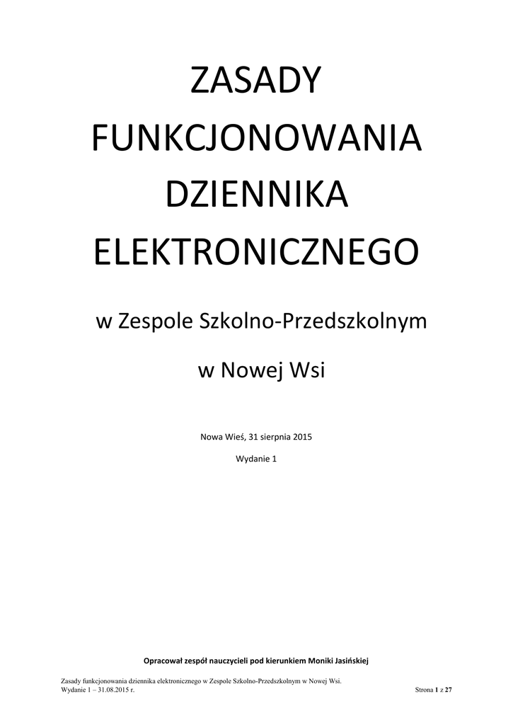 ZASADY FUNKCJONOWANIA DZIENNIKA ELEKTRONICZNEGO w Zespole Szkolno-Przedszkolnym w Nowej Wsi Nowa Wieś, 31 sierpnia 2015 Wydanie 1 Opracował zespół nauczycieli pod kierunkiem Moniki Jasińskiej Zasady funkcjonowania dziennika elektronicznego w Zespole Szkolno-Przedszkolnym w Nowej Wsi. Wydanie 1 – 31.08.2015 r. Strona 1 z 27 Spis treści ROZDZIAŁ I. Postanowienia ogólne ............................................................................................ .......................... 3 ROZDZIAŁ II. Konta w dzienniku elektronicznym ............................................................................................... 5 ROZDZIAŁ III. Przekazywanie informacji w dzienniku elektronicznym ...............................................................9 ROZDZIAŁ IV. Superadministrator ......................................................................................................................11 ROZDZIAŁ V. Szkolny Administrator Dziennika Elektronicznego .....................................................................11 ROZDZIAŁ VI. Administrator szkolnej sieci komputerowej ................................................................................15 ROZDZIAŁ VII. Dyrektor szkoły .............................................................................................. .......................... 15 ROZDZIAŁ VII. Wychowawca klasy .................................................................................................. ................ 17 ROZDZIAŁ VIII. Nauczyciel .............................................................................................................................. 20 ROZDZIAŁ IX. Sekretariat ................................................................................................... ............................... 23 ROZDZIAŁ XI. Uczeń ......................................................................................................................................... 25 ROZDZIAŁ XII. Postępowanie w czasie awarii ....................................................................................................25 ROZDZIAŁ XIII. Postanowienia końcowe ....................................................................................... ................... 26 ZAŁĄCZNIK NR 2 Lista rodziców/prawnych opiekunów, którzy potwierdzili otrzymanie dostępu (loginów i haseł) do swoich kont (rodzica/prawnego opiekuna oraz ucznia/uczennicy) w dzienniku elektronicznym w Zespole SzkolnoPrzedszkolnym w Nowej Wsi ................................................................................................................................ 28 ZAŁĄCZNIK NR ................................................................................................................................................... 2 Lista rodziców/prawnych opiekunów, którzy zapoznali się z zasadami funkcjonowania dziennika ................... 30 elektronicznego w Zespole Szkolno-Przedszkolnym w Nowej Wsi ...................................................................... 30 ZAŁĄCZNIK NR 4 Lista pracowników szkoły, którzy zapoznali się z zasadami funkcjonowania dziennika elektronicznego w Zespole Szkolno-Przedszkolnym w Nowej Wsi..................................................................... 31 Potwierdzam zapoznanie się z zasadami funkcjonowania dziennika elektronicznego i przestrzegania ochrony danych osobowych przez pracowników szkoły ..................................................................................................... 31 ZAŁĄCZNIK NR 5 Lista osób, które odebrały dodatkową kopię dziennika elektronicznego w Zespole SzkolnoPrzedszkolnym w Nowej Wsi ................................................................................................................................ 33 ZAŁĄCZNIK NR 6 Lista osób nie zatrudnionych w szkole, które zadeklarowały przestrzeganie tajemnicy danych z dziennika elektronicznego w Zespole Szkolno-Przedszkolnym w Nowej Wsi ...................................... 34 Zasady Funkcjonowania Dziennika Elektronicznego wydanie 1 z 31.08.2015 r. zostały wprowadzone Zarządzeniem Dyrektora Zespołu Szkolno-Przedszkolnego w Nowej Wsi z dnia 31 sierpnia 2015 roku po uzyskaniu pozytywnej opinii Rady Pedagogicznej. Dokument ten podlega okresowej aktualizacji w przypadkach zmian w funkcjonowaniu systemu dziennika elektronicznego, przepisów prawnych i wniosków użytkowników dziennika. Zatwierdzenia zaktualizowanych Zasad Funkcjonowania Dziennika Elektronicznego dokonuje Dyrektor Szkoły, po zasięgnięciu opinii Rady Pedagogicznej. Zasady funkcjonowania dziennika elektronicznego w Zespole Szkolno-Przedszkolnym w Nowej Wsi. Wydanie 1 – 31.08.2015 r. Strona 2 z 27 Zasady funkcjonowania dziennika elektronicznego w Zespole Szkolno-Przedszkolnym w Nowej Wsi ROZDZIAŁ I. Postanowienia ogólne 1. W szkole, za pośrednictwem strony http://www.synergia.librus.pl/, funkcjonuje elektroniczny dziennik. Oprogramowanie oraz usługi z nim związane dostarczane są przez firmę zewnętrzną, współpracującą ze szkołą. Podstawą działania dziennika elektronicznego jest umowa podpisana przez Dyrektora Szkoły i uprawnionego przedstawiciela firmy dostarczającej oraz obsługującej system dziennika elektronicznego. 2. Za niezawodność działania systemu, ochronę danych osobowych umieszczonych na serwerach oraz tworzenie kopii bezpieczeństwa, odpowiada firma nadzorująca pracę dziennika internetowego, pracownicy szkoły, którzy mają bezpośredni dostęp do edycji i przeglądania danych. Szczegółową odpowiedzialność obu stron reguluje zawarta pomiędzy stronami umowa oraz przepisy obowiązującego w Polsce prawa. 3. Rodzice uczniów odpowiedzialni są bezpieczeństwo informacji w zakresie udostępnionych im danych. 4. Podstawą prawną funkcjonowania dziennika elektronicznego, przechowywania i przetwarzania w nim danych uczniów, rodziców oraz dokumentowania przebiegu