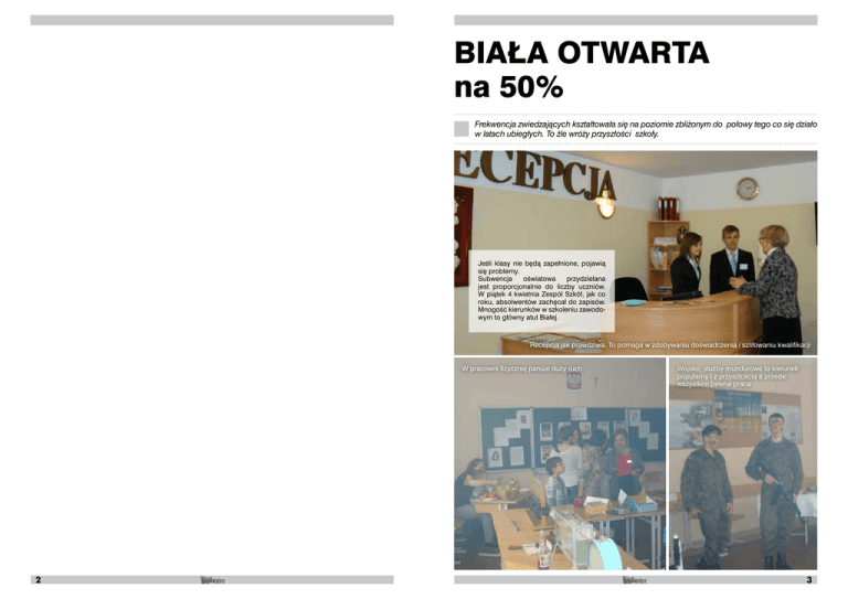 BIAŁA OTWARTA na 50% Frekwencja zwiedzających kształtowała się na poziomie zbliżonym do połowy tego co się działo w latach ubiegłych. To źle wróży przyszłości szkoły. Jeśli klasy nie będą zapełnione, pojawią się problemy. Subwencja oświatowa przydzielana jest proporcjonalnie do liczby uczniów. W piątek 4 kwietnia Zespól Szkół, jak co roku, absolwentów zachęcał do zapisów. Mnogość kierunków w szkoleniu zawodowym to główny atut Białej. Recepcja jak prawdziwa. To pomaga w zdobywaniu doświadczenia i szlifowaniu kwalifikacji W pracowni fizycznej panuje duży ruch 2 Wojsko, służby mundurowe to kierunek popularny i z przyszłością a przede wszystkim pewna praca 3 AKTUALNOŚCI HISTORIA Trans-Net Pasje Jana Matury Kody paskowe na workach do segregacji odpadów Zdjęcia z rodzinnej szuflady W ramach wdrażania znowelizowanej ustawy o utrzymaniu czystości i porządku w gminach – Przedsiębiorstwo Użyteczności Publicznej „Trans-Net” SA w Policach wprowadza nowy element do systemu selektywnej zbiórki odpadów. Są to kody paskowe na worki z posegregowanymi odpadami. Procedura ta dotyczy zabudowy jednorodzinnej, gdzie właściciele zdecydowali się na niższą stawkę opłat za odbiór śmieci. Mieszkańcy otrzymują samoprzylepne naklejki z kodami, z prośbą o ich umieszczeniu na odpowiednich workach. Przy odbiorze śmieci – pracownik „Trans-Netu” skanuje dane, co zostaje odnotowane automatycznie w gminnym systemie monitoringu, a tym samym zostaje potwierdzony odbiór przez operatora określonej frakcji odpadów, zgodnie z podpisaną umową i harmonogramem odbioru. Dzięki temu systemowi w spornych przypadkach dotyczących nieodebrania odpadów, gmina w sposób jednoznaczny może stwierdzić taki fakt lub wykazać bezzasadność roszczenia ze strony właściciela nieruchomości. System monitoringu, którego częścią są kody kreskowe na workach do selektywnej zbiórki odpadów i chipy na pojemnikach, pozwala określić ilość i rodzaj odpadów komunalnych zbieranych na terenie Gminy Police. Informacje o ilości i rodzajach zebranych odpadów Gmina jest zobowiązana zbierać i przekazywać w stosownych sprawozdaniach. Są one podstawą do wykonania obowiązków, nałożonych przez ustawodawcę w zakresie uzyskania określonych poziomów odzysku wskazanych frakcji odpadów komunalnych. Za niedopełnienie tego obowiązku na samorządy są nakładane wysokie kary finansowe. System monitoringu weryfikuje na bieżąco realizację zadeklarowanej przez właścicieli danej nieruchomości metody selektywnego zbierania odpadów komunalnych, dzieląc je na frakcje papieru, szkła i tworzyw sztucznych. Jest to nowe rozwiązanie, mające na celu przestrzeganie Na świadomość najbardziej zwraca uwagę obraz. Ten rzeczywisty jak również utrwalony na płótnie lub fotografii. Fotografia jest jednym z najcenniejszych źródeł wiedzy o minionych czasach, ludziach, którzy żyli, członkach rodziny o którym słyszy się jedynie z opowiadań. Opasłe domowe szuflady w starych domach są istnymi małymi muzeami. Często nie ma się o tym świadomości. Tymczasem rzadko otwierane umykają z pamięci, że ich zasób jest niezwykłym skarbem. Bywa, że po śmierci bliskiej osoby otwieramy je i szukamy jeszcze innych pamiątek, zwykłych rzeczy które używali. Poniżej zamieszczam 3 powojenne fotografie, które odnaleziono w Hajdukach Nyskich. Niektóre z kilkudziesięciu, które mi przesłano znajdą się w monografii tej wsi leżącej o 3 km od biskupiej Nysy. jan przepisów ustawowych. Co ważne; dane z kodów paskowych są chronione i trafiają jedynie do „Trans-Netu” i do Urzędu Miejskiego w Policach. System monitoringu odpadów komunalnych jest wdrażany przez wiele samorządów w Polsce i od dawna funkcjonuje w krajach Europy Zachodniej. police750.blogspot.com historia, fotografie, ryciny, mapy... Obejrzyj koniecznie zapraszam 4 Jan Matura 5 SAMORZĄD LOKALNY SAMORZĄD LOKALNY Sprawozdanie z pracy burmistrza Polic za okres od 04 marca do 01 kwietnia 2014 roku 1. W dniu 23 marca został wybrany nowy burmistrz Partnerskiego Miasta Polic, Pasewalku. Spośród zgłoszonych kandydatów najwięcej głosów uzyskała pani Sandra Nachtweih – kandydatka niezależna. Przypomnę, że wybory były konieczne z powodu nagłej śmierci pana Rainera Dambacha, naszego nieodżałowanego przyjaciela. Współpraca z nim była oparta na wzajemnym szacunku, przyjaźni, tolerancji i wsparciu. Dzięki tym wartościom Police i Pasewalk zrealizowały wiele wspólnych przedsięwzięć, dofinansowanych przez Unię Europejską. W tym roku, 15 lipca, nasze miasta będą obchodzić 15-lecie partnerstwa. 2. W związku z szerzącym się za naszą zachodnią granicą ruchem nacjonalistycznym, w Pasewalku odbył się cykl mitingów, promujących pokój, demokrację i tolerancję. Na zaproszenie władz miasta – wraz z Zespołem „Balbiny” z Polic i delegacją z Urzędu Miejskiego uczestniczyłem w jednym z takich wieców, który odbył się 17 marca. 3. 20 marca uczestniczyłem w uroczystości pożegnania śp. Gerharda Scherera – założyciela i dyrektora Niemiecko-Polskiego Gimnzjum w Loecknitz. Był wielkim pedagogiem, przyjacielem Polaków i troskliwym opiekunem młodzieży. Otworzył polskim licealistom drogę do renowowanych uczelni europejskich. W uroczystości uczestniczyli także między innymi nauczycie i byli dyrektorzy Zespołu Szkół im. Ignacego Łukasiewicza w Policach: Jerzy Kliszewski i Beata Golisowicz. Na terenie Gimnazjum w Loecknitz zostało posadzone drzewko magnolii, dedykowane Gerhardowi Schererowi. 4. W związku z pracami nad wdrożeniem Programu Rodzinne Police, wspierającego rodziny wielodzietne, informuję Wysoką Radę, że 20 marca został przesłany do Urzędu Miejskiego w Policach projekt listu intencyjnego w sprawie przystąpienia gmin obszaru metropolitalnego do programu 8 Burmistrz Polic Władysław Diakun Szczecin Przyjazny Rodzinie. W