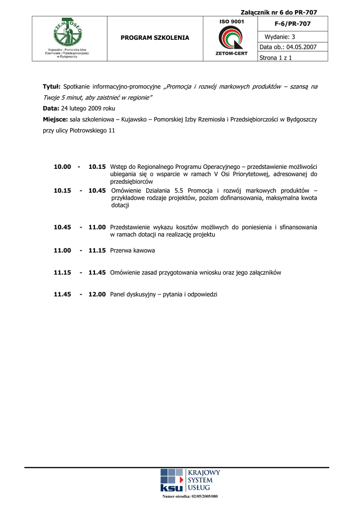 Załącznik nr 6 do PR-707 F-6/PR-707 PROGRAM SZKOLENIA Wydanie: 3 Data ob.: 04.05.2007 Strona 1 z 1 Tytuł: Spotkanie informacyjno-promocyjne „Promocja i rozwój markowych produktów – szansą na Twoje 5 minut, aby zaistnieć w regionie” Data: 24 lutego 2009 roku Miejsce: sala szkoleniowa – Kujawsko – Pomorskiej Izby Rzemiosła i Przedsiębiorczości w Bydgoszczy przy ulicy Piotrowskiego 11 10.00 - 10.15 Wstęp do Regionalnego Programu Operacyjnego – przedstawienie moŜliwości ubiegania się o wsparcie w ramach V Osi Priorytetowej, adresowanej do przedsiębiorców 10.15 - 10.45 Omówienie Działania 5.5 Promocja i rozwój markowych produktów – przykładowe rodzaje projektów, poziom dofinansowania, maksymalna kwota dotacji 10.45 - 11.00 Przedstawienie wykazu kosztów moŜliwych do poniesienia i sfinansowania w ramach dotacji na realizację projektu 11.00 - 11.15 Przerwa kawowa 11.15 - 11.45 Omówienie zasad przygotowania wniosku oraz jego załączników 11.45 - 12.00 Panel dyskusyjny – pytania i odpowiedzi