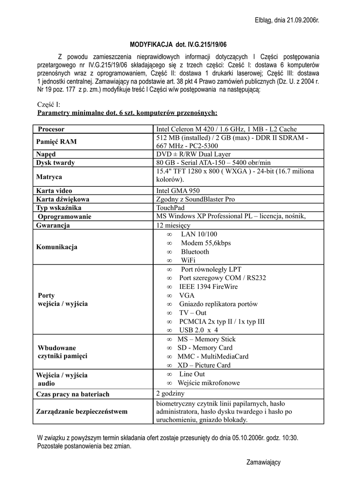 Elbląg, dnia 21.09.2006r. MODYFIKACJA dot. IV.G.215/19/06 Z powodu zamieszczenia nieprawidłowych informacji dotyczących I Części postępowania przetargowego nr IV.G.215/19/06 składającego się z trzech części: Cześć I: dostawa 6 komputerów przenośnych wraz z oprogramowaniem, Część II: dostawa 1 drukarki laserowej; Część III: dostawa 1 jednostki centralnej. Zamawiający na podstawie art. 38 pkt 4 Prawo zamówień publicznych (Dz. U. z 2004 r. Nr 19 poz. 177 z p. zm.) modyfikuje treść I Części w/w postępowania na następującą: Część I: Parametry minimalne dot. 6 szt. komputerów przenośnych: Procesor Pamięć RAM Napęd Dysk twardy Matryca Karta video Karta dźwiękowa Typ wskaźnika Oprogramowanie Gwarancja Komunikacja Porty wejścia / wyjścia Wbudowane czytniki pamięci Wejścia / wyjścia audio Czas pracy na bateriach Zarządzanie bezpieczeństwem Intel Celeron M 420 / 1.6 GHz, 1 MB - L2 Cache 512 MB (installed) / 2 GB (max) - DDR II SDRAM 667 MHz - PC2-5300 DVD ± R/RW Dual Layer 80 GB - Serial ATA-150 – 5400 obr/min 15.4" TFT 1280 x 800 ( WXGA ) - 24-bit (16.7 miliona kolorów). Intel GMA 950 Zgodny z SoundBlaster Pro TouchPad MS Windows XP Professional PL – licencja, nośnik, 12 miesięcy • LAN 10/100 • Modem 55,6kbps • Bluetooth • WiFi • Port równoległy LPT • Port szeregowy COM / RS232 • IEEE 1394 FireWire • VGA • Gniazdo replikatora portów • TV – Out • PCMCIA 2x typ II / 1x typ III • USB 2.0 x 4 • MS – Memory Stick • SD - Memory Card • MMC - MultiMediaCard • XD – Picture Card • Line Out • Wejście mikrofonowe 2 godziny biometryczny czytnik linii papilarnych, hasło administratora, hasło dysku twardego i hasło po uruchomieniu, gniazdo blokady. W związku z powyższym termin składania ofert zostaje przesunięty do dnia 05.10.2006r. godz. 10:30. Pozostałe postanowienia bez zmian. Zamawiający