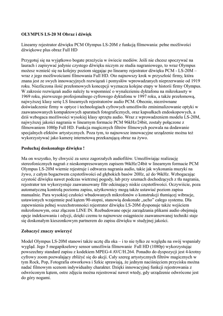 OLYMPUS LS-20 M Obraz i dźwięk Linearny rejestrator dźwięku PCM Olympus LS-20M z funkcją filmowania: pełne możliwości dźwiękowe plus obraz Full HD Przygotuj się na wyjątkowo bogate przeżycia w świecie mediów. Jeśli nie chcesz spoczywać na laurach i zapisywać jedynie czystego dźwięku niczym ze studia nagraniowego, to wraz Olympus możesz wznieść się na kolejny poziom sięgając po linearny rejestrator dźwięku PCM - LS-20M – wraz z jego możliwościami filmowania Full HD. Oto najnowszy krok w przyszłość firmy, która znana jest ze swych innowacyjnych rozwiązań i pomysłów wprowadzanych nieprzerwanie od 1919 roku. Niezliczona ilość przełomowych koncepcji wyznacza kolejne etapy w historii firmy Olympus. W zakresie rozwiązań audio należy tu wspomnieć o wynalezieniu dyktafonu na mikrokasety w 1969 roku, pierwszego profesjonalnego cyfrowego dyktafonu w 1997 roku, a także przełomową, najwyższej klasy serię LS linearnych rejestratorów audio PCM. Obecnie, niezrównane doświadczenie firmy w optyce i technologiach cyfrowych umożliwiło zminimalizowanie optyki w zaawansowanych kompaktowych aparatach fotograficznych, oraz kapsułkach endoskopowych, a dziś wzbogaca możliwości wysokiej klasy sprzętu audio. Wraz z wprowadzeniem modelu LS-20M, najwyższej jakości nagrania w linearnym formacie PCM 96kHz/24bit, zostały połączone z filmowaniem 1080p Full HD. Funkcja magicznych filtrów filmowych pozwala na dodawanie specjalnych efektów artystycznych. Poza tym, to najnowsze innowacyjne urządzenie można też wykorzystywać jako kamerę internetową przekazującą obraz na żywo. Posłuchaj doskonałego dźwięku ! Ma on wszystko, by chwycić za serce zagorzałych audiofilów. Umożliwiając realizację stereofonicznych nagrań z nieskompresowanym zapisem 96kHz/24bit w linearnym formacie PCM Olympus LS-20M wiernie rejestruje i odtwarza nagrania audio, takie jak wykonania muzyki na żywo, z całym bogactwem częstotliwości od głębokich basów 20Hz, aż do 96kHz. Wzbogacając czystość dźwięku nawet podczas wietrznej pogody, lub przy szumach dochodzących z tła nagrania, rejestrator ten wykorzystuje zaawansowany filtr odcinający niskie częstotliwości. Oczywiście, poza automatyczną kontrolą poziomu zapisu, użytkownicy mogą także ustawiać poziom zapisu manualnie. Para wysokiej czułości wbudowanych mikrofonów o konstrukcji tłumiącej wibracje, ustawionych wzajemnie pod kątem 90-stopni, stanowią doskonałe „ucho” całego systemu. Dla zapewnienia pełnej wszechstronności rejestrator dźwięku LS-20M dysponuje także wejściem mikrofonowym, oraz złączem LINE IN. Rozbudowane opcje zarządzania plikami audio obejmują opcje indeksowania i edycji, dzięki czemu to najnowsze osiągniecie zaawansowanej techniki staje się doskonałym kieszonkowym partnerem do zapisu dźwięku w studyjnej jakości. Zobaczyć znaczy uwierzyć Model Olympus LS-20M stanowi także ucztę dla oka – i to nie tylko ze względu na swój wspaniały wygląd. Jego 5 megapikselowy sensor umożliwia filmowanie Full HD (1080p) wykorzystując powszechny standard zapisu z kodekiem MPEG-4 AVC/H.264. Ponadto do dyspozycji jest 4-krotny cyfrowy zoom pozwalający zbliżyć się do akcji. Cały szereg artystycznych filtrów magicznych w tym Rock, Pop, Fotografia otworkowa i Szkic sprawiają, że jednym naciśnięciem przycisku można nadać filmowym scenom indywidualny charakter. Dzięki innowacyjnej funkcji rejestrowania z odwróconym kątem, ostre zdjęcia można rejestrować nawet wtedy, gdy urządzenie odwrócone jest do góry nogami. Przygotowany do pracy, tworzenia i rozrywki Zamknięty w kompaktowym, futurystycznym korpusie rejestrator LS-20M jest mobilny, niezawodny i ma solidną konstrukcję. Frontową jej część zdobią dwa ekrany LCD, w tym kolorowy 2.0 calowy / 5.1cm ekran umożliwiający kadrowanie filmów i prezentowanie rezultatów nagrań. Złącze micro HDMI oznacza, że zarejestrowany cyfrowy materiał filmowy i dźwiękowy można z łatwością pokazać na ekranie telewizora HD i usłyszeć poprzez zewnętrzny system audio. Wygodną dodatkową funkcją, tego obdarzonego wieloma talentami modelu, jest możliwość wykorzystywania go w roli kamery internetowej przekazującej obraz na żywo. Rejestrowane dane zapisywane są na kartach pamięci SD lub SDHC i można stosować nośniki o pojemności do 32GB. Stanowiąc doskonałą symbiozę formy i funkcjonalności model Olympus LS-20M, to rozsądny wybór dla każdego, kto oczekuje zaawansowanych, bogatych możliwości rejestrowania dźwięku, zapisu obrazu wideo Full HD, a jednocześnie sprzętu o kieszonkowym rozmiarze. Nowy model z serii LS będzie dostarczany wraz z akumulatorem litowo jonowym o długiej żywotności oraz 2GB kartą SD. Linearny rejestrator dźwięku PCM - LS-20M – Podstawowe funkcje: -Wysokiej jakości nagrywanie dźwięku - Linearny zapis PCM (do 96kHz/24bit) oraz pliki formatu MP3 - Stereofoniczne mikrofony oraz układy wzmacniające Hi-fi - Ustawione pod kątem 90-stopni mikrofony o konstrukcji eliminującej drgania - Filtr odcinający niskie częstotliwości - Automatyczne lub manualne dostrajanie poziomu nagrywania - Płynne odtwarzanie poszczególnych nagrań - Funkcja indeksu - Edycja plików - Przenoszenie i kopiowanie plików Filmowanie HD - 5 Megapiskelowy sensor CMOS - 4x cyfrowy zoom - Filmowanie Full HD /1080p (MPEG-4 AVC/H.264) - Filtr magicznego filmu: Rock, Pop, Fotografia otworkowa oraz Szkic - Kamera internetowa przekazująca obraz na żywo Inne istotne funkcje - Elegancki i kompaktowy design - Dwa ekrany LCDs (monochromatyczny i kolorowy 2.0 calowy / 5.1cm) - Gniazdo dla kart pamięci SD/SDHC (do 32GB) - Złącze typu Micro HDMI - 5 rodzajów wizualizacji wideo, aby łącznie podziwiać efekty dźwiękowe i wizualne