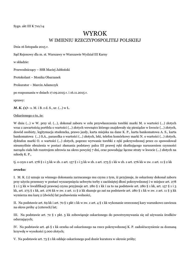Sygn. akt III K 710/14 WYROK W IMIENIU RZECZYPOSPOLITEJ POLSKIEJ Dnia 16 listopada 2015 r. Sąd Rejonowy dla m. st. Warszawy w Warszawie Wydział III Karny w składzie: Przewodniczący – SSR Maciej Jabłoński Protokolant – Monika Obarzanek Prokurator – Marcin Adamczyk po rozpoznaniu w dniach 17.09.2015 r. i 16.11.2015 r. sprawy: M. K. (1)– s. M. i B. z d. S., ur. (...) w Ł. Oskarżonego o to, że: W dniu (...) w W. przy ul. (...), dokonał zaboru w celu przywłaszczenia torebki marki M. o wartości (...) złotych wraz z zawartością portfela o wartości (...) złotych wewnątrz którego znajdowały się pieniądze w kwocie (...) złotych, dowód osobisty, legitymacja studencka, prawo jazdy, karta miejska na dane K. P., karta bankomatowa A. S., karta bankomatowa (...) S.A., parasolka o wartości (...) złotych, leki, telefon komórkowy marki N. o wartości (...) złotych, dyktafon marki O. o wartości (...) złotych, poprzez wyrwanie torebki z ręki pokrzywdzonej przez co spowodował nieumyślnie obrażenia w postaci złamania podstawy palca III prawej ręki skutkującego naruszeniem czynności narządu ciała lub rozstrojem zdrowia na okres powyżej 7 dni, oraz powodując łączne straty w kwocie (...) złotych na szkodę K. P., tj. o czyn z art. 278 § 1 i 5 kk w zb. z art. 157 § 1 i 3 kk w zb. z art. 275 § 1 kk w zb. z art. 276 kk w zw. z art. 11 § 2 kk orzeka: I. M. K. (1) uznaje za winnego dokonania zarzucanego mu czynu z tym, iż przyjmuje, że oskarżony dokonał zaboru przy użyciu przemocy w postaci wyszarpnięcia uchwytu torby z zaciśniętej dłoni pokrzywdzonej i w miejsce art. 278 § 1 i 5 kk w kwalifikacji prawnej czynu przyjmuje art. 280 § 1 kk i za to na podstawie art. 280 § 1 kk, art. 157 § 1 i 3 kk, art. 275 § 1 kk, art. 276 kk w zw. z art. 11 § 2 kk skazuje go zaś na podstawie art. 280 § 1 kk w zw. z art. 11 § 3 kk wymierza mu karę 2 (dwóch) lat pozbawienia wolności, II. Na podstawie art. 69 kk i art. 70 § 1 pkt 1 kk w zw. z art. 4 § 1 kk wykonanie orzeczonej kary warunkowo zawiesza na okres próby 4 (czterech) lat; III. Na podstawie art. 72 § 1 pkt. 5 kk zobowiązuje oskarżonego do powstrzymywania się od używania środków odurzających; IV. Na podstawie art. 46 § 1 kk orzeka od oskarżonego na rzecz pokrzywdzonej K. P. zadośćuczynienie za doznaną krzywdę w wysokości 5.000 złotych; V. Na podstawie art. 73 § 1 kk oddaje oskarżonego pod dozór kuratora w okresie próby; VI. Zasądza od Skarbu Państwa na rzecz adw. K. M. wynagrodzenie za reprezentowanie oskarżycielki posiłkowej z urzędu w kwocie 792 zł plus podatek VAT; VII. Na podstawie art. 627 kpk obciąża oskarżonego opłatą w kwocie 300 zł i kosztami postępowania w kwocie 832 zł. III K 710/14 UZASADNIENIE Na podstawie zebranego materiału dowodowego Sąd ustalił następujący stan faktyczny w sprawie: W dniu (...) M. K. (1) cierpiąc na brak gotówki postanowił uzyskać środki finansowe poprzez dokonanie kradzieży torebki damskiej. W tym celu w okolicach ulicy (...) krążył typując potencjalne ofiary. Po upływie pewnego czasu zauważył K. P., która szła na wysokości ul (...) niosąc w prawym ręku torebkę. Oskarżony uznał, że sposób niesienia tej torebki ułatwi mu zadanie i zbliżył się do pokrzywdzonej od tyłu po czym chwycił torebkę i chciał ją zabrać lecz pokrzywdzona trzymając ją mocno za uchwyt prawą dłonią starała się utrzymać w jej posiadaniu. Wobec wyraźnego oporu oskarżony bardzo mocno szarpnął za torebkę skutkiem czego pokrzywdzona poczuła przeszywający ból w dłoni i rozluźniła uchwyt, a sprawca zaczął uciekać z przedmiotem zaboru. Pokrzywdzona zaczęła go ścigać głośno wzywając pomocy. Oskarżony po chwili odrzucił torebkę i wkrótce został zatrzymany przez osoby znajdujące się w pobliżu i przekazany wezwanemu patrolowi Policji. W wyniku zdarzenia pokrzywdzona utraciła (aczkolwiek przejściowo) torebkę z zawartością i doznała złamania podstawy palca trzeciego prawej ręki. Powyższy stan faktyczny Sąd ustalił na podstawie następujących dowodów: wyjaśnień oskarżonego M. K. (1) (k66,140,385-386), zeznań świadków: K. P. (k- 7-8,38-39,386-387), M. K. (2) (k- 8, 387), W. G. (k- 12, 387-388), D. P. (k- 72,388), P. S. (k- 14-15, 388-389), J. S. (k- 10,389) oraz dokumentów zaliczonych do materiału dowodowego według wykazu z k- 438. Sąd dał wiarę zasadniczej części wyjaśnień oskarżonego jako zgodnych z wersja pokrzywdzonej i pozostałych świadków. Jedynie co do kwestii samej techniki zaboru Sąd uznał je za pomijające istotny aspekt czyli krótki okres kiedy pokrzywdzona trzymała torebkę a oskarżony szarpał próbując wyrwać ją pomimo oporu pokrzywdzonej, który przełamał w końcu dużo mocniejszym szarpnięciem. Oskarżony konstruując swoją linie obrony pomija ten element dla zmniejszenia swojej odpowiedzialności, tak aby uraz jakiego doznała pokrzywdzona przedstawić jako całkowicie niezamierzony i pozostający nawet poza jego możliwością przewidzenia. Sąd dał wiarę zeznaniom świadków uznając ich zeznania za logiczne, spójne i konsekwentne, a co więcej całkowicie ze sobą zbieżne i uzupełniające się nawzajem. Sąd zważył, co następuje: W świetle zebranego materiału dowodowego wina oskarżonego nie budzi wątpliwości, z tym, iż zdaniem Sądu dopuścił się on nie kradzieży a rozboju. Przy pozostającym poza dyskusją zaborze mienia w postaci torebki z zawartością( także dokumentów, co determinowało poszerzenie kwalifikacji prawnej o art. 275 § 1 kk i 276 kk) należy zwrócić uwagę na to w jaki sposób oskarżony tego dokonał. Gdyby jedynie wyrwał ją z ręki pokrzywdzonej, to dopuściłby się jedynie kradzieży jako że przemoc rozumiana jako użycie siły fizycznej kierowana byłaby na przedmiot. Inaczej jest w przypadku, kiedy oskarżony zorientował się że pokrzywdzona torebki nie wypuściła z uchwytu i nadal ją trzyma