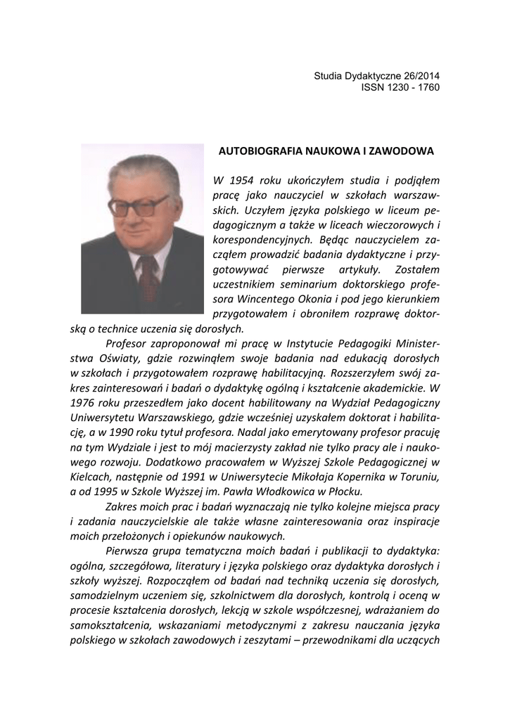 Studia Dydaktyczne 26/2014 ISSN 1230 - 1760 AUTOBIOGRAFIA NAUKOWA I ZAWODOWA W 1954 roku ukończyłem studia i podjąłem pracę jako nauczyciel w szkołach warszawskich. Uczyłem języka polskiego w liceum pedagogicznym a także w liceach wieczorowych i korespondencyjnych. Będąc nauczycielem zacząłem prowadzić badania dydaktyczne i przygotowywać pierwsze artykuły. Zostałem uczestnikiem seminarium doktorskiego profesora Wincentego Okonia i pod jego kierunkiem przygotowałem i obroniłem rozprawę doktorską o technice uczenia się dorosłych. Profesor zaproponował mi pracę w Instytucie Pedagogiki Ministerstwa Oświaty, gdzie rozwinąłem swoje badania nad edukacją dorosłych w szkołach i przygotowałem rozprawę habilitacyjną. Rozszerzyłem swój zakres zainteresowań i badań o dydaktykę ogólną i kształcenie akademickie. W 1976 roku przeszedłem jako docent habilitowany na Wydział Pedagogiczny Uniwersytetu Warszawskiego, gdzie wcześniej uzyskałem doktorat i habilitację, a w 1990 roku tytuł profesora. Nadal jako emerytowany profesor pracuję na tym Wydziale i jest to mój macierzysty zakład nie tylko pracy ale i naukowego rozwoju. Dodatkowo pracowałem w Wyższej Szkole Pedagogicznej w Kielcach, następnie od 1991 w Uniwersytecie Mikołaja Kopernika w Toruniu, a od 1995 w Szkole Wyższej im. Pawła Włodkowica w Płocku. Zakres moich prac i badań wyznaczają nie tylko kolejne miejsca pracy i zadania nauczycielskie ale także własne zainteresowania oraz inspiracje moich przełożonych i opiekunów naukowych. Pierwsza grupa tematyczna moich badań i publikacji to dydaktyka: ogólna, szczegółowa, literatury i języka polskiego oraz dydaktyka dorosłych i szkoły wyższej. Rozpocząłem od badań nad techniką uczenia się dorosłych, samodzielnym uczeniem się, szkolnictwem dla dorosłych, kontrolą i oceną w procesie kształcenia dorosłych, lekcją w szkole współczesnej, wdrażaniem do samokształcenia, wskazaniami metodycznymi z zakresu nauczania języka polskiego w szkołach zawodowych i zeszytami – przewodnikami dla uczących AUTOBIOGRAFIA NAUKOWA I ZAWODOWA się literatury i języka polskiego w systemie Radiowo – Telewizyjnej Szkoły Średniej oraz Telewizyjnego Technikum Rolniczego, gdzie przygotowywałem lekcje telewizyjne i poradniki do samodzielnego uczenia się z przekazu radiowego oraz telewizyjnego. Pracując dodatkowo w dawnym Instytucie Programów Szkolnych zorganizowałem i przeprowadziłem w latach 1985-89 badania wyników nauczania i osiągnięć absolwentów szkół podstawowych, zasadniczych zawodowych, liceów ogólnokształcących. Łącznie przebadano 8011 uczniów z 215 szkół i 2657 nauczycieli. W badaniach zastosowano 36 testów przedmiotowych i 26 kwestionariuszy, a także przygotowano założenia badań, instrukcje, harmonogramy oraz klucze kodowe. Zespół badawczy działający pod moim kierunkiem liczył 49 osób. Raporty z badań ukazały się pod moją redakcją w 5 dwutomowych opracowaniach zbiorowych, łącznie w 10 tomach o objętości 4150 stron zawarto rezultaty z badań wraz z ich interpretacją, podsumowaniem i pełnym przedstawieniem wszystkich testów oraz kwestionariuszy. Ogólne podsumowanie badań z przedstawieniem założeń metodologicznych, wyników oraz analiz dydaktycznych zostało przygotowane przeze mnie w odrębnym studium autorskim pt. „Osiągnięcia absolwentów szkół polskich w latach 1985-1989” i opublikowanym przez Wydawnictwo Uniwersytetu Mikołaja Kopernika w Toruniu w roku 1994. Objętość publikacji 263 strony. Badania i analizy teoretyczne procesu kształcenia prowadziły do syntez, którymi stały się opracowania dydaktyki w dwu obszernych publikacjach: „Dydaktyka dorosłych” wydana przez Wydawnictwa Szkolne i Pedagogiczne w 1992 roku (342 strony) i „Dydaktyka dla nauczycieli” wydanie rozszerzone z 2002 roku nakładem Wydawnictwa Naukowego Novum w Płocku. Objętość 416 stron. „Dydaktyka dla nauczycieli” przedstawia nie tylko własne analizy doświadczeń, ale także wyrosła z tradycji polskiej dydaktyki naukowej konstruowanej w XX wieku przez K. Twardowskiego, K. Sośnickiego, B. Nawroczyńskiego i W. Okonia, z wykorzystaniem współczesnych wskazań i idei edukacyjnych przedstawianych w raportach E. Faurea, J. Delorsa oraz pracach i publikacjach UNESCO. W „Dydaktyce dla nauczycieli” wprowadziłem rozbudowaną część o organizacji i metodach pracy uczniów oraz podstawy aksjologii do konstruowania ideału i celów kształcenia, co zostało pozytywnie odnotowane przez recenzentów. Od 1992 roku organizowałem na Uniwersytecie Mikołaja Kopernika w Toruniu konferencje dydaktyczne o zasięgu ogólnokrajowym z udziałem 14 Studia Dydaktyczne 26/2014 ISSN 1230 - 1760 AUTOBIOGRAFIA NAUKOWA I ZAWODOWA specjalistów zza granicy. Konferencji tych odbyło się już 21 (od 2004 roku w Płocku), a ich rezultaty zostały ogłoszone w ponad dwudziestu tomach „Toruńskich Studiów Dydaktycznych”, przygotowywanych i redagowanych przeze mnie z zespołem dydaktyków z ośrodków akademickich Warszawy, Torunia, Poznania, Łodzi, Szczecina. Po zakończeniu mojej współpracy z UMK pismo to zmieniło tytuł początkowo na „Toruńsko-Płockie Studia Dydaktyczne”, a później na „Studia Dydaktyczne” i jest kontynuowane w środowisku płockim. Niezależnie od tomów „Studiów Dydaktycznych”, w których ogłoszono 482 artykuły, 62 recenzje i 37 informacji naukowych jako rezultat badań i analiz opublikowane zostały z moim udziałem autora i redaktora tomy studiów: „Współczesne kierunki modernizacji dydaktyki”, „Uczestnicy procesu dydaktycznego”, i „Kazimierz Sośnicki – twórca dydaktyki polskiej”. Autorski zakres publikacji dydaktycznych uzupełniają moje opracowania metodyczne dla uczniów i studentów z organizacji i metodyki samokształcenia oraz studiowania („Ucz się sam”, „Jak studiować zaocznie”) a także dwa rozdziały w zbiorowej pracy