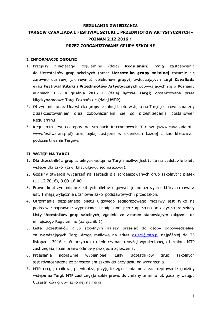 REGULAMIN ZWIEDZANIA TARGÓW CAVALIADA I FESTIWAL SZTUKI I PRZEDMIOTÓW ARTYSTYCZNYCH POZNAŃ 2.12.2016 r. PRZEZ ZORGANIZOWANE GRUPY SZKOLNE I. INFORMACJE OGÓLNE 1. Przepisy niniejszego regulaminu (dalej Regulamin) mają zastosowanie do Uczestników grup szkolnych (przez Uczestnika grupy szkolnej rozumie się zarówno uczniów, jak również opiekunów grupy), zwiedzających targi Cavaliada oraz Festiwal Sztuki i Przedmiotów Artystycznych odbywających się w Poznaniu w dniach 1 - 4 grudnia 2016 r. (dalej łącznie Targi) organizowane przez Międzynarodowe Targi Poznańskie (dalej MTP). 2. Otrzymanie przez Uczestnika grupy szkolnej biletu wstępu na Targi jest równoznaczny z zaakceptowaniem oraz zobowiązaniem się do przestrzegania postanowień Regulaminu. 3. Regulamin jest dostępny na stronach internetowych Targów (www.cavaliada.pl i www.festiwal.mtp.pl) oraz będą dostępne w okienkach każdej z kas biletowych podczas trwania Targów. II. WSTĘP NA TARGI 1. Dla Uczestników grup szkolnych wstęp na Targi możliwy jest tylko na podstawie biletu wstępu dla szkół (tzw. bilet ulgowy jednorazowy). 2. Godziny otwarcia wydarzeń na Targach dla zorganizowanych grup szkolnych: piątek (11.12.2016), 9.00-16.00 3. Prawo do otrzymania bezpłatnych biletów ulgowych jednorazowych o których mowa w ust. 1 mają wyłącznie uczniowie szkół podstawowych i przedszkoli. 4. Otrzymanie bezpłatnego biletu ulgowego jednorazowego możliwy jest tylko na podstawie poprawnie wypełnionej i podpisanej przez opiekuna oraz dyrektora szkoły Listy Uczestników grup szkolnych, zgodnie ze wzorem stanowiącym załącznik do niniejszego Regulaminu (załącznik 1). 5. Listę Uczestników grup szkolnych należy przesłać do osoby odpowiedzialnej za zwiedzających Targi drogą mailową na adres [email protected] najpóźniej do 25 listopada 2016 r. W przypadku niedotrzymania wyżej wymienionego terminu, MTP zastrzegają sobie prawo odmowy przyjęcia zgłoszenia. 6. Przesłanie poprawnie wypełnionej Listy Uczestników grup szkolnych jest równoznaczne ze zgłoszeniem szkoły do przyjazdu na wydarzenia. 7. MTP drogą mailową potwierdzą przyjęcie zgłoszenia oraz zaakceptowanie godziny wstępu na Targi. MTP zastrzegają sobie prawo do zmiany terminu lub godziny wstępu Uczestników grupy szkolnej na Targi. 1 8. MTP zastrzegają sobie prawo odmowy przyjęcia zgłoszenia ze względu na np. wyczerpanie liczby biletów ulgowych jednorazowych lub niespełnienie warunków Regulaminu. 9. Każdej grupie szkolnej musi towarzyszyć co najmniej jeden opiekun z ramienia szkoły na każdych dwudziestu uczniów Opiekun będący przedstawicielem szkoły, ponosi pełną odpowiedzialność za bezpieczeństwo, działania i szkody wyrządzone przez swoich podopiecznych na terenie Targów. Opiekun zobowiązany jest do zapoznania uczniów z niniejszym Regulaminem i egzekwowania jego zasad. 10. Wszyscy Uczestnicy grup szkolnych mają obowiązek zwiedzania Targów z przewodnikiem grupy, którego zapewniają MTP. MTP zastrzegają sobie prawo do łączenia grup w większe bądź dzielenia na mniejsze. Uczestnicy grup szkolnych zobowiązani są do zastosowania się i przestrzegania poleceń Przewodnika grupy. 11. Przewidziany czas zwiedzania wydarzeń wynosi około 1,5 godziny. 12. Wraz z potwierdzeniem przyjęcia zgłoszenia przesyłana będzie drogą mailową zaakceptowana godzina wstępu na Targi dla grupy szkolnej. 13. Po zakończeniu zwiedzania Targów, Uczestnicy grup szkolnych są odprowadzani przez przewodnika grupy do wyjścia i opuszczają teren Targów. III. PRZEPISY PORZĄDKOWE 1. Zabronione jest wnoszenie na teren Targów broni palnej, amunicji, materiałów wybuchowych oraz przedmiotów, których używanie może zagrażać bezpieczeństwu osób przebywających na terenach targowych. 2. Zabronione jest wprowadzanie na teren Targów zwierząt. 3. Na terenie Targów Uczestników grupy szkolnej obowiązuje zakaz: 1) palenia tytoniu z wyjątkiem miejsc specjalnie wyznaczonych dla palaczy na zewnątrz pawilonów wystawowych; 2) spożywania alkoholu oraz zażywania środków odurzających; 3) prowadzenia reklamowych, jakichkolwiek zbiórek promocyjnych oraz pieniężnych, agitacyjnych nie działań akwizycyjnych, uzgodnionych z MTP, jak również żadnych działań niezgodnych z obowiązującymi przepisami prawa; 4) używania otwartego ognia; 5) posiadania substancji chemicznych, pożarowo niebezpiecznych, w tym butli z gazami palnymi, w tym również typu turystycznego. 4. W razie podejrzenia wniesienia przez Uczestników grup szkolnych na teren Targów alkoholu, środków odurzających lub niebezpiecznych przedmiotów, jak również nieprzestrzegania pozostałych zakazów wskazanych w ust. 2 MTP zastrzegają sobie prawo do natychmiastowego wyprowadzenia Uczestnika wraz z całą grupą szkolną z terenu MTP (bez możliwości ponownego wejścia na teren Targów) i wezwania Policji. 5. Do dyspozycji Uczestników grup szkolnych udostępniona zostanie szatnia. 2 6. Targi nie ponoszą odpowiedzialności za szkodę na mieniu Uczestników powstałą z winy Uczestników grup szkolnych lub osoby trzeciej, będącej wynikiem np. braku należytego nadzoru własnego mienia. 7. MTP nie ponoszą odpowiedzialności za mienie wniesione na teren MTP, za wyjątkiem rzeczy pozostawionych w szatni MTP. 8. MTP nie ponoszą odpowiedzialności za szkodę na osobie spowodowaną przez osobę trzecią lub z winy poszkodowanego. 9. Zabrania się wstępu na teren Targów osobom nietrzeźwym, znajdującym się w stanie odurzenia lub zachowującym się w sposób, który zagraża bezpieczeństwu innych osób zwiedzających oraz wystawców, zakłóca porządek publiczny, narusza ogólnie przyjęte normy zachowania w miejscach publicznych. 10. MTP zastrzegają sobie prawo do odmowy wpuszczenia na teren Targów osoby, o której mowa w pkt. 9 powyżej. 11. Uczestnicy grup szkolnych obowiązani będą przestrzegać poleceń porządkowych wydawanych przez MTP w