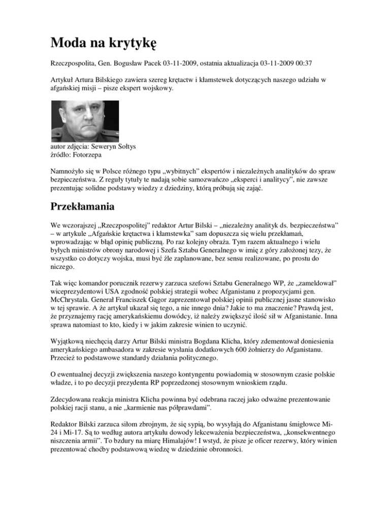 Moda na krytykę Rzeczpospolita, Gen. Bogusław Pacek 03-11-2009, ostatnia aktualizacja 03-11-2009 00:37 Artykuł Artura Bilskiego zawiera szereg krętactw i kłamstewek dotyczących naszego udziału w afgańskiej misji – pisze ekspert wojskowy. autor zdjęcia: Seweryn Sołtys źródło: Fotorzepa NamnoŜyło się w Polsce róŜnego typu „wybitnych” ekspertów i niezaleŜnych analityków do spraw bezpieczeństwa. Z reguły tytuły te nadają sobie samozwańczo „eksperci i analitycy”, nie zawsze prezentując solidne podstawy wiedzy z dziedziny, którą próbują się zająć. Przekłamania We wczorajszej „Rzeczpospolitej” redaktor Artur Bilski – „niezaleŜny analityk ds. bezpieczeństwa” – w artykule „Afgańskie krętactwa i kłamstewka” sam dopuszcza się wielu przekłamań, wprowadzając w błąd opinię publiczną. Po raz kolejny obraŜa. Tym razem aktualnego i wielu byłych ministrów obrony narodowej i Szefa Sztabu Generalnego w imię z góry załoŜonej tezy, Ŝe wszystko co dotyczy wojska, musi być źle zaplanowane, bez sensu realizowane, po prostu do niczego. Tak więc komandor porucznik rezerwy zarzuca szefowi Sztabu Generalnego WP, Ŝe „zameldował” wiceprezydentowi USA zgodność polskiej strategii wobec Afganistanu z propozycjami gen. McChrystala. Generał Franciszek Gągor zaprezentował polskiej opinii publicznej jasne stanowisko w tej sprawie. A Ŝe artykuł ukazał się tego, a nie innego dnia? Jakie to ma znaczenie? Prawdą jest, Ŝe przyznajemy rację amerykańskiemu dowódcy, iŜ naleŜy zwiększyć ilość sił w Afganistanie. Inna sprawa natomiast to kto, kiedy i w jakim zakresie winien to uczynić. Wyjątkową niechęcią darzy Artur Bilski ministra Bogdana Klicha, który zdementował doniesienia amerykańskiego ambasadora w zakresie wysłania dodatkowych 600 Ŝołnierzy do Afganistanu. PrzecieŜ to podstawowe standardy działania politycznego. O ewentualnej decyzji zwiększenia naszego kontyngentu powiadomią w stosownym czasie polskie władze, i to po decyzji prezydenta RP poprzedzonej stosownym wnioskiem rządu. Zdecydowana reakcja ministra Klicha powinna być odebrana raczej jako odwaŜne prezentowanie polskiej racji stanu, a nie „karmienie nas półprawdami”. Redaktor Bilski zarzuca siłom zbrojnym, Ŝe się sypią, bo wysyłają do Afganistanu śmigłowce Mi24 i Mi-17. Są to według autora artykułu dowody lekcewaŜenia bezpieczeństwa, „konsekwentnego niszczenia armii”. To bzdury na miarę Himalajów! I wstyd, Ŝe pisze je oficer rezerwy, który winien prezentować choćby podstawową wiedzę w dziedzinie obronności. Ręce opadają OtóŜ w trosce i o bezpieczeństwo własnych Ŝołnierzy, i po to, by zapewnić im moŜliwość realizacji postawionych zadań, zawsze wysyła się do udziału w operacji niezbędny sprzęt i uzbrojenie. Zawsze teŜ kosztują one niemało. Nawet największym przeciwnikom wojska nie przychodzi do głowy, Ŝeby to krytykować. Programy modernizacyjne ogłoszone przez ministra obrony nazywa autor przykrywaniem sytuacji. To co? Lepiej nie modernizować? Bo Ŝal, Ŝeby poszło do Afganistanu? Przypominam, Ŝe to operacja NATO (którego jesteśmy członkiem, gdyby pan Bilski o tym zapomniał). ONZ w pełni poparła tę misję, dając jej stosowny mandat. Dzisiaj nasi Ŝołnierze w Afganistanie razem z sojusznikami nie tylko niszczą w zarodku światowy terroryzm, ale takŜe walczą o polską wiarygodność i naszą pozycję międzynarodową. I nie ma co się dziwić reakcji byłego ministra obrony Jerzego Szmajdzińskiego, który – choć w opozycji – to nie krytykuje bezmyślnie polskich wysiłków w Afganistanie, a je popiera, gdyŜ dobrze rozumie, co jest dla Polski dobre, a co złe. Dostało się od autora artykułu takŜe Biuru Bezpieczeństwa Narodowego i samemu ministrowi Aleksandrowi Szczygle. Za co? Za to, Ŝe w sprawach afgańskiej misji i zwiększenia kontyngentu BBN nabrało wody w usta. A moŜe i BBN, i jego szef, w odróŜnieniu od Artura Bilskiego, nie kierują się zasadą politycznej walki dla samej walki? MoŜe to mądrość Biura Bezpieczeństwa Narodowego i wielu byłych ministrów obrony, Ŝe nie wybrzydzają i nie przeszkadzają obecnemu ministrowi tam, gdzie nie mają wątpliwości, Ŝe są to dobre działania, w słusznej sprawie i dla dobra Polski. Oczywistą prawdę, Ŝe w Afganistanie nasi Ŝołnierze są ofiarami światowego terroryzmu, giną takŜe w imię naszego bezpieczeństwa i Ŝe jest to test naszej sojuszniczej wiarygodności nazywa Artur Bilski „koszmarnym zalewem banału”. Nie tylko Paweł Graś wie dobrze, Ŝe „decyzja o wycofaniu się z Afganistanu będzie wspólną decyzją NATO”. Ręce opadają, gdy czytam, Ŝe nie rozumie tego były dziennikarz wojskowy, oficer rezerwy. Nie wszystko jest jawne Jest w dobrym zwyczaju dziennikarskim sprawdzanie faktów, zanim podda się je krytyce w mediach. To bzdura, Ŝe „od miesięcy MON nie potrafi przygotować rzetelnej analizy misji afgańskiej”. Takie analizy realizowane są systematycznie, a jedna z nich zawiera dokładne wyliczenie niezbędnych sił i środków potrzebnych kontyngentowi wojskowemu w naszej strefie w aktualnej sytuacji. Nie wszystkie plany i analizy wojska są jawne, co w przypadku wojny z terroryzmem nie powinno budzić wątpliwości. Artykuł Artura Bilskiego ma tytuł adekwatny do przedstawionej treści. Faktycznie zawiera szereg krętactw i kłamstewek dotyczących naszego udziału w afgańskiej misji. Publikacje ministra Klicha i generała Gągora nazywa Bilski operą mydlaną „Moda na sukces”. W moim przekonaniu kolejna publikacja tego autora na temat wojska świadczy o serialu „Moda na bezpodstawną krytykę sił zbrojnych”. Autor jest ekspertem w dziedzinie bezpieczeństwa międzynarodowego