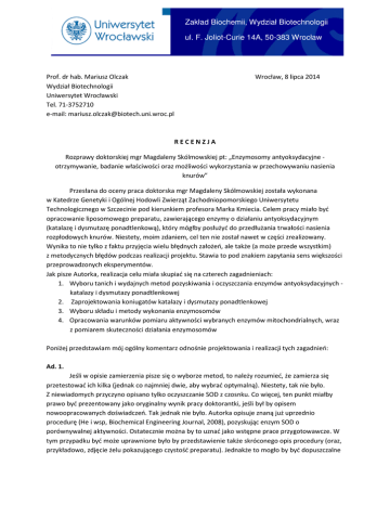 Zakład Biochemii, Wydział Biotechnologii ul. F. Joliot-Curie 14A, 50-383 Wrocław Prof. dr hab. Mariusz Olczak Prof. dr hab. Mariusz Olczak Wydział Biotechnologii Uniwersytet Wrocławski Tel. 71-3752710 e-mail: [email protected] Wrocław, 8 lipca 2014 RECENZJA Rozprawy doktorskiej mgr Magdaleny Skólmowskiej pt: „Enzymosomy antyoksydacyjne otrzymywanie, badanie właściwości oraz możliwości wykorzystania w przechowywaniu nasienia knurów” Przesłana do oceny praca doktorska mgr Magdaleny Skólmowskiej została wykonana w Katedrze Genetyki i Ogólnej Hodowli Zwierząt Zachodniopomorskiego Uniwersytetu Technologicznego w Szczecinie pod kierunkiem profesora Marka Kmiecia. Celem pracy miało być opracowanie liposomowego preparatu, zawierającego enzymy o działaniu antyoksydacyjnym (katalazę i dysmutazę ponadtlenkową), który mógłby posłużyć do przedłużania trwałości nasienia rozpłodowych knurów. Niestety, moim zdaniem, cel ten nie został nawet w części zrealizowany. Wynika to nie tylko z faktu przyjęcia wielu błędnych założeń, ale także (a może przede wszystkim) z metodycznych błędów podczas realizacji projektu. Stawia to pod znakiem zapytania sens większości przeprowadzonych eksperymentów. Jak pisze Autorka, realizacja celu miała skupiać się na czterech zagadnieniach: 1. Wyboru tanich i wydajnych metod pozyskiwania i oczyszczania enzymów antyoksydacyjnych katalazy i dysmutazy ponadtlenkowej 2. Zaprojektowania koniugatów katalazy i dysmutazy ponadtlenkowej 3. Wyboru składu i metody wykonania enzymosomów 4. Opracowania warunków pomiaru aktywności wybranych enzymów mitochondrialnych, wraz z pomiarem skuteczności działania enzymosomów Poniżej przedstawiam mój ogólny komentarz odnośnie projektowania i realizacji tych zagadnień: Ad. 1. Jeśli w opisie zamierzenia pisze się o wyborze metod, to należy rozumieć, że zamierza się przetestować ich kilka (jednak co najmniej dwie, aby wybrać optymalną). Niestety, tak nie było. Z niewiadomych przyczyno opisano tylko oczyszczanie SOD z czosnku. Co więcej, ten punkt miałby prawo być prezentowany jako oryginalny wynik pracy doktorantki, jeśli był by opisem nowoopracowanych doświadczeń. Tak jednak nie było. Autorka opisuje znaną już uprzednio procedurę (He i wsp, Biochemical Engineering Journal, 2008), pozyskując enzym SOD o porównywalnej aktywności. Ostatecznie można by to uznać jako wstępne prace przygotowawcze. W tym przypadku być może uprawnione było by przedstawienie także skróconego opis procedury (oraz, przykładowo, zdjęcie żelu pokazującego czystość preparatu). Jednakże to mogło by być dopuszczalne tylko pod dwoma warunkami: po pierwsze - musiało by być umieszczone w rozdziale „Materiały i Metody”, po drugie: oczyszczany enzym powinien być wykorzystany w dalszych doświadczeniach (czyli w tym przypadku do konstrukcji enzymosomów). Niestety, oba warunki nie zostały spełnione. Powtórzenie procedury znanej z poprzedniej publikacji zamieszczono w rozdziale „Wyniki i ich omówienie”. Jest to NIEDOPUSZCZALNE w pracy doktorskiej i w zasadzie nosi znamiona plagiatu, mimo tego, że Autorka podaje odpowiedni odnośnik literaturowy. Dlaczego wobec tego uważa, że są to Jej wyniki ? Czyżby tak samo uważał także promotor tej dysertacji ? Podobnie zaskakujący jest fakt, że oczyszczony enzym nie był wykorzystany w dalszych etapach ocenianej pracy. Po co więc zmarnowano na to czas i pieniądze ? Trochę lepiej wygląda sprawa z doczyszczaniem komercyjnie dostępnej katalazy, która była później użyta do tworzenia koniugatów enzymatycznych. Jednakże, moim zdaniem, ta nieskomplikowana procedura powinna być jedynie wspomniana w rozdziale "Materiały i Metody" jako mało istotny krok przygotowawczy (bo taką jest w rzeczywistości), a nie jako znacząca część rozdziału „Wyniki”. Nie jestem pewny, czy Autorka zdaje sobie sprawę z faktu, że w pracach doktorskich z ostatnich lat (także polskich), autorzy oczyszczając wiele (często kilkadziesiąt) wariantów białkowych (na przykład wariantów z mutacjami), ograniczają się tylko do zwięzłych opisów tych często wieloetapowych procedur, nie uważając ich za istotny wynik naukowy lecz jedynie za prace pomocnicze (wstępne), służące do realizacji właściwego celu naukowego. A są to procedury nieporównywalnie bardziej skomplikowane niż jedna prosta chromatografia, prezentowana przez Autorkę. Poza tym, jeśli doczyszczanie katalazy miało by służyć do stałej produkcji enzymu, to należało opracować efektywną metodę od początku (lub powtórzyć wybraną z literatury procedurę, oczywiście nie opisując tego w rozdziale „Wyniki”). Kupno w firmie Sigma gotowego preparatu jako wyjściowego materiału do komercyjnego wykorzystania mija się z celem z dwóch względów: po pierwsze - korporacja Sigma nie jest w stanie zapewnić stałej jakości swoich produktów (co prawdopodobnie zdarzyło się także Autorce, gdyż kupiony preparat nosi ewidentne znamiona degradacji proteolitycznej), ponieważ sama ich nie produkuje, a jedyne skupuje produkty innych laboratoriów. Innymi słowy produkt o tym samym numerze katalogowym może nie być zawsze tej samej jakości. Po drugie: w każdej chwili taki produkt może zniknąć z oferty. W obu przypadkach nie było by to korzystne dla ewentualnych dalszych badań nad enzymosomami. Jestem też ciekawy, czy doczyszczenie preparatu katalazy było potrzebne ? W pracy nie ma żadnych informacji na ten temat. Może wystarczyło użyć od razu preparat komercyjny ? Ad 2. Wbrew temu, co Autorka napisała w celach pracy, synteza koniugatów jest dokładnym powieleniem znanej procedury, a opisane odstępstwa nie uprawniają do opisywania jej jako oryginalnej. Podobnie jak w pkt. 1, opis ten powinien być umieszczony jako prace przygotowawcze w rozdziale „Materiały i Metody”. W tym jednak przypadku dochodzi jeszcze ocena poprawno