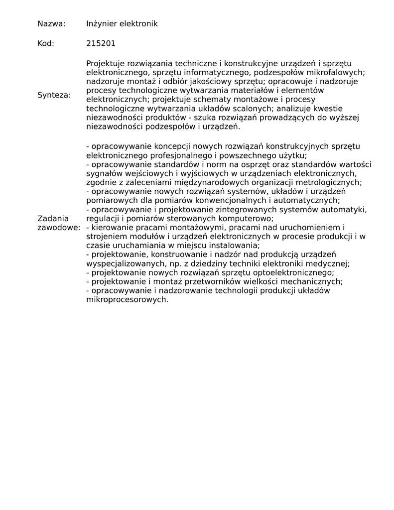 Nazwa: Inżynier elektronik Kod: 215201 Synteza: Projektuje rozwiązania techniczne i konstrukcyjne urządzeń i sprzętu elektronicznego, sprzętu informatycznego, podzespołów mikrofalowych; nadzoruje montaż i odbiór jakościowy sprzętu; opracowuje i nadzoruje procesy technologiczne wytwarzania materiałów i elementów elektronicznych; projektuje schematy montażowe i procesy technologiczne wytwarzania układów scalonych; analizuje kwestie niezawodności produktów - szuka rozwiązań prowadzących do wyższej niezawodności podzespołów i urządzeń. - opracowywanie koncepcji nowych rozwiązań konstrukcyjnych sprzętu elektronicznego profesjonalnego i powszechnego użytku; - opracowywanie standardów i norm na osprzęt oraz standardów wartości sygnałów wejściowych i wyjściowych w urządzeniach elektronicznych, zgodnie z zaleceniami międzynarodowych organizacji metrologicznych; - opracowywanie nowych rozwiązań systemów, układów i urządzeń pomiarowych dla pomiarów konwencjonalnych i automatycznych; - opracowywanie i projektowanie zintegrowanych systemów automatyki, Zadania regulacji i pomiarów sterowanych komputerowo; zawodowe: - kierowanie pracami montażowymi, pracami nad uruchomieniem i strojeniem modułów i urządzeń elektronicznych w procesie produkcji i w czasie uruchamiania w miejscu instalowania; - projektowanie, konstruowanie i nadzór nad produkcją urządzeń wyspecjalizowanych, np. z dziedziny techniki elektroniki medycznej; - projektowanie nowych rozwiązań sprzętu optoelektronicznego; - projektowanie i montaż przetworników wielkości mechanicznych; - opracowywanie i nadzorowanie technologii produkcji układów mikroprocesorowych.