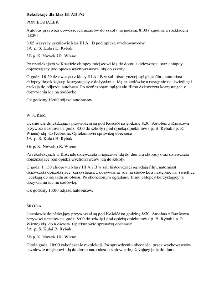 Rekolekcje dla klas III AB PG PONIEDZIALEK Autobus przywozi dowożących uczniów do szkoły na godzinę 8:00 ( zgodnie z rozkładem jazdy) 8:05 wszyscy uczniowie klas III A i B pod opieką wychowawców: 3A p. S. Kula i B. Rybak 3B p. K. Nowak i R. Wienc Po rekolekcjach w Kościele chłopcy miejscowi idą do domu a dziewczęta oraz chłopcy dojeżdżający pod opieką wychowawców idą do szkoły. O godz. 10:50 dziewczęta z klasy III A i B w sali historycznej oglądają film, natomiast chłopcy dojeżdżający korzystający z dożywiania idą na stołówkę a następnie na świetlicę i czekają do odjazdu autobusu. Po skończonym oglądaniu filmu dziewczęta korzystające z dożywiania idą na stołówkę. Ok godziny 13:00 odjazd autobusów. WTOREK Uczniowie dojeżdżający przywożeni są pod Kościół na godzinę 8:30. Autobus z Raniżowa przywozi uczniów na godz. 8:00 do szkoły i pod opieką opiekunów ( p. B. Rybak i p. R. Wienc) idą do Kościoła. Opiekunowie sprawdzą obecność 3A p. S. Kula i B. Rybak 3B p. K. Nowak i R. Wienc Po rekolekcjach w Kościele dziewczęta miejscowe idą do domu a chłopcy oraz dziewczęta dojeżdżające pod opieką wychowawców idą do szkoły. O godz. 11:30 chłopcy z klasy III A i B w sali historycznej oglądają film, natomiast dziewczęta dojeżdżające korzystające z dożywiania idą na stołówkę a następnie na świetlicę i czekają do odjazdu autobusu. Po skończonym oglądaniu filmu chłopcy korzystający z dożywiania idą na stołówkę. Ok godziny 13:00 odjazd autobusów. ŚRODA Uczniowie dojeżdżający przywożeni są pod Kościół na godzinę 8:30. Autobus z Raniżowa przywozi uczniów na godz. 8:00 do szkoły i pod opieką opiekunów ( p. B. Rybak i p. R. Wienc) idą do Kościoła. Opiekunowie sprawdzą obecność 3A p. S. Kulai B. Rybak 3B p. K. Nowak i R. Wienc Około godz. 10:00 zakończenie rekolekcji. Po sprawdzeniu obecności przez wychowawców uczniowie miejscowi idą do domu natomiast uczniowie dojeżdżający jadą do domu. Rekolekcje dla klas IV-VI SP oraz I-II PG PONIEDZIAŁEK Przyjazd uczniów do szkoły zgodnie z harmonogramem autobusów na godzinę 8:00. Wychowawcy klas opiekują się uczniami w swoich salach ( zajęcia opiekuńczowychowawcze) do godziny 8:45. O godzinie 8:30 wychowawcy wraz z uczniami przechodzą do MGOKSiR gdzie zostanie wyświetlony film „Ziemia Maryi” (80 minut). Obsługa projektora oraz filmu p. A. Pasierb oraz p. Z. Bury. Każdy z wychowawców jest odpowiedzialny za swoją klasę (utrzymanie ciszy podczas projekcji filmu). O godzinie 10:30 wszystkie klasy wraz z wychowawcami udadzą się bezpieczną drogą do Kościoła (kl. IA PG odpowiedzialna p. B. Koziarz) i nauczyciele sprawują opiekę do zakończenia rekolekcji. Następnie uczniowie miejscowi oraz wychowawcy idą do domu natomiast uczniowie dojeżdżający i uczniowie korzystający z dożywiania pod opieką niżej wymienionych nauczycieli wracają do szkoły. p. Ł. Marecki p. M. Staniec p. K. Bełz p. A. Wit Uczniowie udają się na stołówkę a następnie czekają do odjazdu autobusów na świetlicy szkolnej. WTOREK Przyjazd uczniów pod Kościół na godzinę 10:30. Autobus z Raniżowa przywozi uczniów na godz. 8:00 do szkoły i uczniowie przebywają w świetlicy. O godz. 10:10 pod opieką p. M. Staniec oraz p. B. Bies idą do Kościoła i pozostają pod ich opieką do końca rekolekcji. Wychowawcy sprawdzą obecność i biorą pełną odpowiedzialność za bezpieczeństwo uczniów. Po rekolekcjach ok godz.12:45 wychowawcy uczniów dojeżdżających oraz korzystających z dożywiania przyprowadzają do szkoły. Uczniowie udają się na stołówkę a następnie czekają do odjazdu autobusów na świetlicy szkolnej. ŚRODA Przyjazd uczniów pod Kościół na godzinę 11:00. Autobus z Raniżowa przywozi uczniów na godz. 8:00 do szkoły i uczniowie przebywają w świetlicy. O godz. 10:30 pod opieką p. M. Staniec oraz p. B. Bies idą do Kościoła i pozostają pod ich opieką do końca rekolekcji. Wychowawcy sprawdzą obecność i biorą pełną odpowiedzialność za bezpieczeństwo uczniów (kl. IIA PG odpowiedzialna p. B. Koziarz) Po rekolekcjach ok godz.13:00 wychowawcy uczniów dojeżdżających oraz korzystających z dożywiania przyprowadzają do szkoły. Uczniowie udają się na stołówkę, a następnie czekają do odjazdu autobusów na świetlicy szkolnej. Klasy I –III SP PONIEDZIAŁEK i WTOREK Dzieci dożywiane przychodzą do szkoły na godz. 12:30 i udają się na stołówkę na obiad pod opieką swoich wychowawców. O godz. 13:00 pod opieką wychowawców idą do Kościoła gdzie uczestniczą w rekolekcjach. Po zakończeniu w zależności od pisemnej informacji od rodziców, wychowawcy udają się z dziećmi do szkoły i zaprowadzają dzieci do świetlicy. ŚRODA Dzieci dożywiane przychodzą do szkoły na godz. 11:00 i udają się na stołówkę na obiad pod opieką swoich wychowawców. O godz. 11:30 pod opieką wychowawców idą do Kościoła gdzie uczestniczą w rekolekcjach. Po zakończeniu w zależności od pisemnej informacji od rodziców, wychowawcy udają się z dziećmi do szkoły i zaprowadzają dzieci do świetlicy. Dodatkową opiekę nad uczniami kl. I-III SP pełnić będą p. S. Woś, p. E. Ustrobińska. HARMONOGRAM PRACY SWIETLICY SZKOLNEJ W OKRESIE REKOLEKCJI Ze względu na opiekę wychowawców nad klasami w czasie rekolekcji harmonogram świetlicy zostaje zmieniony PONIEDZIAŁEK 7:00 – 9:00 p. Tomasz Majka 9:00 – 11:00 p. Paweł Smotryś 11:00 – 12:00 p. Maciej Dec 12:00 – 14:00 p. Beata Bies 14:00 – 16:00 p. Aleksandra Piękoś, p. Małgorzata Pasierb WTOREK 7:00 – 9:00 p. Anna Tęcza - Blicharz 9:00 – 11:00 p. Bernadeta Słonina 11:00 – 12:00 p. Maciej Dec 12:00 – 14:00 p. Tomasz Majka 14:00 – 16:00 p. Aleksandra Piękoś, p. Małgorzata Pasierb ŚRODA 7:00 – 9:00 p. Maciej Dec 9:00 – 11:00 p. Anna Wit 11:00 – 12:00 p. Katarzyna Bełz 12:00 – 14:00 p. Bernadeta Słon
