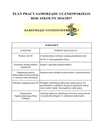 PLAN PRACY SAMORZĄDU UCZNIOWSKIEGO ROK SZKOLNY 2016/2017 WRZESIEŃ ZADANIE Wybory do SU FORMY REALIZACJI Z każdej klasy wybrani zostaną przedstawiciele do SU w tym gospodarz klasy Kiermasz podręczników szkolnych. Kupno i sprzedaż podręczników. Organizacja pracy Inspirowanie działań uczniowskich i pomysłowości Samorządu Uczniowskiego w nowym roku szkolnym. Zebranie organizacyjne SU Wstępne informacje dotyczące planu pracy SU, przydzielenie członków do poszczególnych sekcji oraz wybór władz. Szczegółowy plan pracy Organizacja Ogólnoszkolnego Dnia Chłopca Audycja radiowa, dedykacje utworów muzycznych i życzeń dla kolegów w szkolnym radiowęźle. PAŹDZIERNIK Zagospodarowanie tablicy plan SU, członkowie Pomoc w akcji ”Góra Grosza” Zaangażowanie członków SU w zbiórkę pieniędzy Pomoc w organizacji Dnia Przemówienie przewodniczącego SU oraz Edukacji Narodowej wręczenie kwiatów pracownikom szkoły. „Niespodzianka dla wychowawcy” Promocja wyrobów kulinarnych Halloween Z produktów zakupionych przez SU ,uczniowie technikum gastronomicznego przygotowują wypieki kulinarne Forma realizacji do uzgodnienia LISTOPAD Andrzejki Zorganizowanie Andrzejkowej Nocy Filmowej Międzynarodowy Dzień Tolerancji „Klasowe Zasady Tolerancji” przewodniczący klas przeprowadzają wraz z wychowawcą dyskusję na godzinie wychowawczej, dotyczącą tolerancji rówieśniczej, wykonują plakat (szary papier) z napisanymi zasadami j klasowej tolerancji i zawieszają go na drzwiach swoich klas, od strony korytarza. Debata Debata o wartościach ( dyskusja: władze SU, troje uczniów z każdej klasy, ksiądz oraz pedagog szkolny) GRUDZIEN Mikołajki Zakup słodyczy dla każdej klasy. Wizyta Św. Mikołaja w każdej klasie. „Najpiękniejszy stroik” - Zorganizowanie konkursu na najpiękniejszy stroik. konkurs Przekazanie stroików instytucjom zaprzyjaźnionym ze szkołą. „Podziel się z innymi” Zbiórka darów dla potrzebujących z naszej szkoły STYCZEŃ Studniówka Przemówienie przewodniczącego SU w trakcie balu studniówkowego. WOŚP Udział wolontariuszy w zbiórce pieniędzy na Wielką Orkiestrę Świątecznej Pomocy. Joseph Zbiórka pieniędzy na zakupy trymestralne Josepha Wyjazd do kina Wyjazd członków SU podsumowanie Sporządzenie sprawozdania z pracy Samorządu Uczniowskiego za I semestr w roku szkolnym 2016/2017 LUTY Walentynki Promocja wyrobów kulinarnych Przygotowanie poczty walentynkowej. Dedykacje oraz ubieramy się na czerwono (osoby ubrane na czerwono zwolnione z pytania ) Z produktów zakupionych przez SU ,uczniowie technikum gastronomicznego przygotowują wypieki kulinarne. MARZEC Dzień Kobiet Audycja radiowa Dzień Języków Obcych Podróżbez biletu przez Stany Zjednoczone - „Across The United States” KWIECIEŃ Wielkanoc Wspólne wykonanie i pracowników szkoły kartki dla Pożegnanie klas maturalnych Przemówienie przewodniczącego SU Paczka dla Josepha Zbiórka wśród uczniów i nauczycieli Obchody Dnia Ziemi V Powiatowy konkurs Piosenki Anglojęzycznej pod patronatem Starosty Sztumskiego nauczycieli Ubieramy się na zielono; wykonanie gazetki okolicznościowej; (osoby ubrane na zielono zwolnione z pytania ) Pomoc SU w zorganizowaniu konkursu. MAJ Dzień Otwarty Szkoły Pomoc w organizacji Dnia Otwartego szkoły. Zainicjowanie akcji pt. "Wakacyjna oś czasu" Informowanie uczniów o ilości dni w szkole, które zostały do końca roku szkolnego oraz do wystawienia ocen końcoworocznych CZERWIEC Dzień Dziecka Koniec roku tuż,tuż... Pomoc w organizacji Dnia Dziecka Organizacja pomocy koleżeńskiej Festyn Sportowy Sprawozdanie Uroczyste zakończenie roku szkolnego Pomoc w organizacji Festynu SportowoRekreacyjnego Podsumowanie działalności SU Przygotowanie apelu z okazji zakończenia roku szkolnego2016/2017 Inne imprezy i wydarzenia wynikające z bieżących potrzeb pomysłów dopisane zostaną w formie aneksu.
