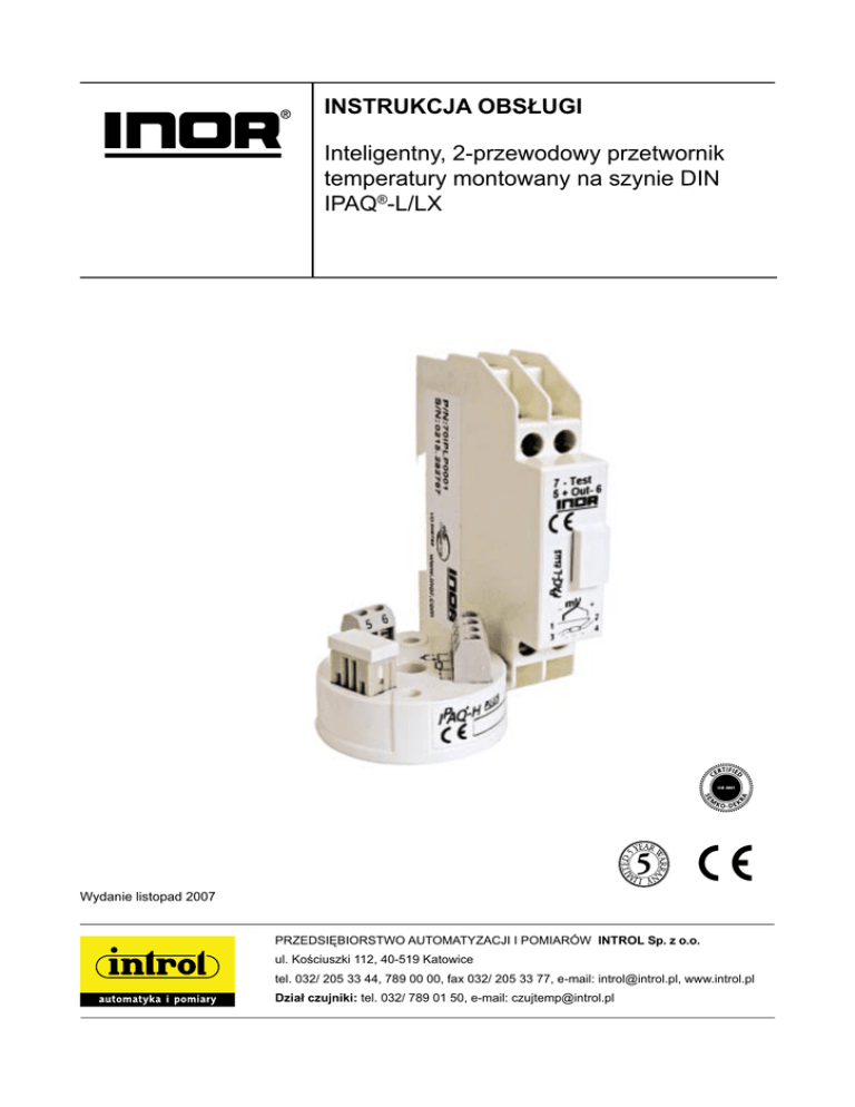 INSTRUKCJA OBSŁUGI Inteligentny, 2-przewodowy przetwornik temperatury montowany na szynie DIN IPAQ®-L/LX Wydanie listopad 2007 PRZEDSIĘBIORSTWO AUTOMATYZACJI I POMIARÓW INTROL Sp. z o.o. ul. Kościuszki 112, 40-519 Katowice tel. 032/ 205 33 44, 789 00 00, fax 032/ 205 33 77, e-mail: [email protected], www.introl.pl Dział czujniki: tel. 032/ 789 01 50, e-mail: [email protected] INTROL Sp. z o.o., ul. Kościuszki 112, 40-519 Katowice, tel.: 32/78 90 150, faks: 32/2053377, e-mail: [email protected], www.introl.pl Tę instrukcję należy przeczytać przed regulacją i/ lub montażem. Zawarte w niej informacje mogą być zmienione bez powiadamiania. Wstęp IPAQ-L jest uniwersalnym i inteligentnym, 2-przewodowym, montowanym na szynie przetwornikiem temperatury i innych wielkości pomiarowych. IPAQ-LX jest wersją iskrobezpieczną, do zastosowań w obszarach zagrożenia wybuchem (Ex). Informacje ogólne Przetwornik ten można konfigurować ze standardowego PC, kompatybilnego z IBM, przy użyciu oprogramowania IPRO, wersja 3.07 lub nowsza. Najbardziej aktualną wersję IPRO można pobrać ze strony http://www.inor.com. Gdy przetwornik jest nastawiany z PC, nie ma potrzeby jego kalibrowania. Przy kalibracji/ konfigurowaniu „online”, z wejściem podłączonym do obszaru zagrożenia, należy stosować wersję kabla IPRO-X z certyfikatem ATEX. Przetwornik jest zabezpieczony przed niewłaściwą biegunowością i nie zostanie uszkodzony przy podłączeniu zasilania o odwróconej biegunowości, ale wyjście będzie wtedy wynosiło 0 mA. Maksymalne obciążenie w pętli wyjścia zależy od napięcia zasilania – patrz „Skrócone dane techniczne”. „Izolacja wejście/ wyjście/ PC” wymieniona w karcie katalogowej, oznacza tylko izolację sygnału. Nie należy tego rozumieć jako izolacji galwanicznej IS, takiej jak bariera izolująca. Z tego względu, należy zwrócić szczególną uwagę na wybór bariery i uziemienie dla IPAQ-LX. Sprawdzanie przewodów czujnika: omawiany przetwornik wykorzystuje technikę impulsową do kontroli przerwania czujnika lub jego zwarcia, co pozwala uniknąć błędów pomiarowych. Ten sygnał impulsowy może interferować z niektórymi kalibratorami elektronicznymi. Wybranie „Sensor Break = None” w oprogramowaniu IPRO i przeładowanie takiej konfiguracji do przetwornika, powoduje wyłączenie sygnału impulsowego. 2 INTROL Sp. z o.o., ul. Kościuszki 112, 40-519 Katowice, tel.: 32/78 90 150, faks: 32/2053377, e-mail: [email protected], www.introl.pl Wymiary Konfiguracja Przetwornik IPAQ-L/LX w czasie jego konfigurowania musi być zasilany (patrz: Rys. 1 „Połączenia”). Jeżeli IPRO (oprogramowanie IPAQ) nie zostało jeszcze zainstalowane na PC, należy je zainstalować. Dla zachowania bezpieczeństwa wewnętrznych układów IPAQ-LX, przy konfigurowaniu układu, zawsze należy używać zasilania elektrycznego Ex lub bariery Zenera, z ograniczeniami technicznymi podanymi dla obszarów Ex i kablem połączeniowym IPRO-X. Przy wyborze różnicowych pomiarów temperatur za pomocą Pt100, należy dokonać nastawienia „sensor break” = none. Konfigurowanie z PC odbywa się „on-line”, to znaczy, że przetwornik można konfigurować w czasie jego pracy, o ile miejsce jego pracy nie leży w obszarze zagrożenia. W tym przypadku, gdy trwa przesyłanie danych z PC do IPAQ, wyjście przetwornika jest „zamrożone”. Po zakończeniu transferu, przetwornik używa już nowych parametrów. Dane techniczne (skrócone) Zasilanie: IPAQ-L IPAQ-LX Izolacja wejście/ wyjście: Wyjście: Temperatura pracy 7,5 do 36V DC 8 do 30V DC 1500V AC 4 ~ 20mA -20 do +70°C Napięcie zasilania U (V DC) 3 INTROL Sp. z o.o., ul. Kościuszki 112, 40-519 Katowice, tel.: 32/78 90 150, faks: 32/2053377, e-mail: [email protected], www.introl.pl Dane techniczne dla obszaru Ex – IPAQ-LX Dopuszczenie Demko 03 ATEX 134461X CE 0539 II (1)G [EEx ia] IIC Wyjście (zaciski 5-6) (pętla prądowa) Wejście (zaciski 1-2-3-4) (zaciski czujnika iskrobezpiecznego) UI: II: PI: LI: CI: 30V DC 100mA 0,9W 0mH 1nF U0: I0: L0: C0: 30V 27mA 50mH 52nF Ten sprzęt musi być łączony elektrycznie (zaciski 5 i 6) za pomocą certyfikowanego interfejsu izolującego/ bariery Zenera i powinien być zamontowany poza obszarem zagrożenia. Montaż IPAQ –L/LX są konstrukcyjne przeznaczone do zamocowania na standardowej szynie DIN. IPAQ-LX musi być zamontowany poza obszarem zagrożenia. Wejście, wyjście i zasilanie elektryczne należy przyłączyć zgodnie z Rysunkami 1 – 9. Potencjometr Rys. 3 Rys. 6 połączenie 4-przewodowe Rys. 4 Rys. 7 połączenie 3-przewodowe połączenie 3-przewodowe Potencjometr połączenie 4-przewodowe Rys. 8 Rys. 5 Napięcie różnica temperatur T1 > T2 Termoelement Rys. 9 4 INTROL Sp. z o.o., ul. Kościuszki 112, 40-519 Katowice, tel.: 32/78 90 150, faks: 32/2053377, e-mail: [email protected], www.introl.pl Połączenia IPAQ-L IPAQ-LX Złącze Złącze Obszar bezpieczny Wejście Obszar zagrożenia Wejście Tabela kodów do zamówienia Urządzenie Kod do zamówienia IPAQ-L, izolowany 70IPL00001 IPAQ-LX, izolowany (ATEX) 70IPLX0001 IPAQ-LX, izolowany (FM) 70IPLX1001 IPAQ-L, izolowany, wejście mA 70IPL00003 Oprogramowanie z kablem - IPRO-X (IPRO z kablem) 70CFG00092 5 INTROL Sp. z o.o., ul. Kościuszki 112, 40-519 Katowice, tel.: 32/78 90 150, faks: 32/2053377, e-mail: [email protected], www.introl.pl Notatki własne 6 INTROL Sp. z o.o., ul. Kościuszki 112, 40-519 Katowice, tel.: 32/78 90 150, faks: 32/2053377, e-mail: [email protected], www.introl.pl Notatki własne 7