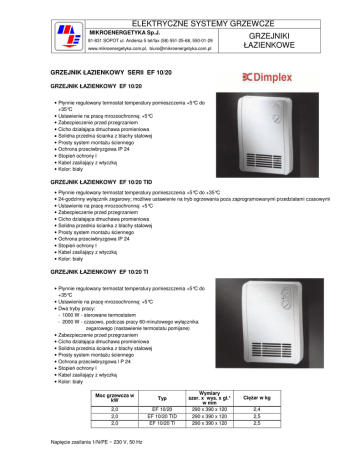 ELEKTRYCZNE SYSTEMY GRZEWCZE MIKROENERGETYKA Sp.J. 81-831 SOPOT ul. Andersa 5 tel/fax (58) 551-25-68, 550-01-29 www.mikroenergetyka.com.pl, [email protected] GRZEJNIKI ŁAZIENKOWE GRZEJNIK ŁAZIENKOWY SERII EF 10/20 GRZEJNIK ŁAZIENKOWY EF 10/20 • Płynnie regulowany termostat temperatury pomieszczenia +5°C do +35°C • Ustawienie na prac mrozoochronn : +5°C • Zabezpieczenie przed przegrzaniem • Cicho działaj ca dmuchawa promieniowa • Solidna przednia cianka z blachy stalowej • Prosty system monta u ciennego • Ochrona przeciwbryzgowa IP 24 • Stopie ochrony l • Kabel zasilaj cy z wtyczk • Kolor: biały GRZEJNIK ŁAZIENKOWY EF 10/20 TID • • • • • • • • • • • Płynnie regulowany termostat temperatury pomieszczenia +5°C do +35°C 24-godzinny wył cznik zegarowy; mo liwe ustawienie na tryb ogrzewania poza zaprogramowanymi przedziałami czasowymi Ustawienie na prac mrozoochronn : +5°C Zabezpieczenie przed przegrzaniem Cicho działaj ca dmuchawa promieniowa Solidna przednia cianka z blachy stalowej Prosty system monta u ciennego Ochrona przeciwbryzgowa IP 24 Stopie ochrony l Kabel zasilaj cy z wtyczk Kolor: biały GRZEJNIK ŁAZIENKOWY EF 10/20 TI • Płynnie regulowany termostat temperatury pomieszczenia +5°C do +35°C • Ustawienie na prac mrozoochronn : +5°C • Dwa tryby pracy: - 1000 W - sterowane termostatem - 2000 W - czasowo, podczas pracy 60-minutowego wył cznika zegarowego (nastawienie termostatu pomijane) • Zabezpieczenie przed przegrzaniem • Cicho działaj ca dmuchawa promieniowa • Solidna przednia cianka z blachy stalowej • Prosty system monta u ciennego • Ochrona przeciwbryzgowa l P 24 • Stopie ochrony l • Kabel zasilaj cy z wtyczk • Kolor: biały Moc grzewcza w kW Typ 2,0 2,0 2,0 EF 10/20 EF 10/20 TID EF 10/20 Tl Napi cie zasilania 1/N/PE ~ 230 V, 50 Hz Wymiary szer. x wys. x gł.* w mm 290 x 390 x 120 290 x 390 x 120 290 x 390 x 120 Ci ar w kg 2,4 2,5 2,5 ELEKTRYCZNE SYSTEMY GRZEWCZE MIKROENERGETYKA Sp.J. 81-831 SOPOT ul. Andersa 5 tel/fax (58) 551-25-68, 550-01-29 www.mikroenergetyka.com.pl, [email protected] * Gł boko urz dzenia ł cznie z odst pem od cian GRZEJNIKI ŁAZIENKOWE