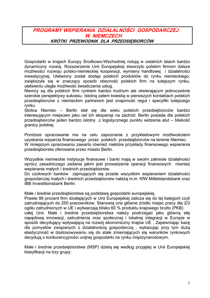 PROGRAMY WSPIERANIA DZIAŁALNOŚCI GOSPODARCZEJ W NIEMCZECH KRÓTKI PRZEWODNIK DLA PRZEDSIĘBIORCÓW Gospodarki w krajach Europy Środkowo-Wschodniej notują w ostatnich latach bardzo dynamiczny rozwój. Rozszerzenie Unii Europejskiej stworzyło polskim firmom dalsze możliwości rozwoju polsko-niemieckiej kooperacji, wymiany handlowej i działalności inwestycyjnej. Ułatwiony został dostęp polskich produktów do rynku niemieckiego, zwiększyła się w znaczący sposób obecność polskich firm na tutejszym rynku, ułatwieniu uległa możliwość świadczenia usług. Niemcy są dla polskich firm rynkiem bardzo trudnym ale otwierającym jednocześnie szerokie perspektywy sukcesu. Istotną zatem kwestią w pierwszych kontaktach polskich przedsiębiorców z niemieckim partnerem jest znajomość reguł i specyfiki tutejszego rynku. Stolica Niemiec – Berlin stał się dla wielu polskich przedsiębiorców bardzo interesującym miejscem jako cel ich ekspansji na zachód. Berlin posiada dla polskich przedsiębiorców jeden bardzo istotny z logistycznego punktu widzenia atut – bliskość granicy polskiej. Poniższe opracowanie ma na celu zapoznanie z przykładowymi możliwościami uzyskania wsparcia finansowego przez polskich przedsiębiorców na terenie Niemiec. W niniejszym opracowaniu zawarto również niektóre przykłady finansowego wspierania przedsiębiorstw oferowane przez miasto Berlin. Wszystkie niemieckie instytucje finansowe i banki mają w swoim zakresie działalności oprócz zasadniczego zadania jakim jest prowadzenie operacji finansowych również wspieranie małych i średnich przedsiębiorstw. Do czołowych banków zajmujących się przede wszystkim wspieraniem działalności gospodarczej małych i średnich przedsiębiorstw należą m.in. KfW Mittelstandsbank oraz IBB Investitionsbank Berlin. Małe i średnie przedsiębiorstwa są podstawą gospodarki europejskiej. Prawie 99 procent firm działających w Unii Europejskiej zalicza się do tej kategorii czyli zatrudniających do 250 pracowników. Stanowią one główne źródło miejsc pracy dla 2/3 ogółu zatrudnionych w UE i wytwarzają blisko 60 % produktu krajowego brutto (PKB) całej Unii. Małe i średnie przedsiębiorstwa należy postrzegać jako główną siłę napędową innowacji, zatrudnienia oraz społecznej i lokalnej integracji w Europie w sposób decydujący wpływającą na rozwój ekonomiczny krajów UE . Zapewniając bazę dla pomysłów związanych z działalnością gospodarczą , wykazując przy tym dużą elastyczność w dostosowywaniu się do stale zmieniających się warunków rynkowych decydują o konkurencyjności unijnej gospodarki na rynku międzynarodowym. Małe i średnie przedsiębiorstwa (MSP) dzielą się według przyjętej w Unii Europejskiej klasyfikacji na trzy grupy: 1 - przedsiębiorstwa średnie, zatrudniające mniej niż 250 pracowników i osiągające roczny obrót mniejszy od 40 milionów euro ; przedsiębiorstwa małe, zatrudniające mniej niż 50 pracowników i nie przekraczające 7 milionów euro rocznego obrotu; mikro przedsiębiorstwa, czyli firmy zatrudniające do 10 pracowników z rocznym obrotem nie większym niż 2 miliony euro. Dla rozwoju i urzeczywistnienia swoich aspiracji przedsiębiorcy potrzebują środków finansowych. Zestaw oferowanych instrumentów wspierających małe i średnie przedsiębiorstwa jest bardzo szeroki, niniejsze opracowanie prezentuje wybrane przykłady powszechniejszych programów wsparcia . Ogólne zasady wspierania finansowego gospodarki niemieckiej Wszyscy inwestorzy w RFN, w tym zagraniczni, mogą korzystać z bardzo szerokiego zestawu programów wspierania gospodarczego na takich samych zasadach, jak przedsiębiorcy niemieccy. Zestaw ten zawiera kilkaset programów oferowanych przez UE, federację, kraje związkowe i jest on skierowany głównie do małych i średnich przedsiębiorstw. Większość środków oferowanych z budżetu federalnego dotyczy całego obszaru Republiki Federalnej Niemiec. Część programów ma korzystniejsze warunki we wschodniej części Niemiec aniżeli w zachodniej celem wsparcia gospodarki rynkowej w nowych krajach związkowych. Szczególny charakter nadano nowym inwestycjom, dla których stosuje się zróżnicowane dodatki do inwestycji, szczególne formy odpisów amortyzacyjnych, wsparcie regionalne czy też specjalne linie kredytowe. Federalne środki pomocowe przeznaczane są generalnie na zakładanie nowych firm oraz wspieranie małych i średnich przedsiębiorstw. W ostatnim czasie na znaczeniu zyskuje wspieranie innowacyjnych produktów i procesów produkcyjnych oraz w ramach polityki energetycznej oszczędność energii oraz ograniczenie emisji dwutlenku węgla. Pomoc publiczna dla MSP realizowana jest głównie w poniższych formach: - wspieranie zakładania nowych przedsiębiorstw, wspieranie inwestycji, wspieranie ochrony i poprawy środowiska naturalnego, udzielanie poręczeń kredytowych, wspieranie działań wystawienniczych i eksportowych, wspieranie szkoleń i dokształcania zawodowego, wspieranie rozwoju zatrudnienia, wspieranie badań i rozwoju. 2 Wysokość wsparcia inwestycyjnego na terenie Niemiec leży zasadniczo w gestii poszczególnych landów. W każdym z krajów związkowych powołano regionalną agencję wsparcia inwestycji, obsługującą zarówno inwestorów zagranicznych jak i przedsiębiorców krajowych. Agencje te posiadają także swoje oddziały poza granicami Niemiec. Zadaniem ich jest ściąganie inwestorów do poszczególnych krajów związkowych oraz wspieranie współpracy pomiędzy przedsiębiorcami niemieckimi i zagranicznymi. Przedsiębiorca zagraniczny planujący założenie swojego przedsiębiorstwa na terenie któregoś z 16 krajów związkowych otrzymuje za pośrednictwem takiej agencji ofertę inwestycyjna zawierającą m.in. propozycje zakupu gruntu pod określoną inwestycję w wybranym przez siebie regionie. Programy wspierania inwestycji zagranicznych finanso