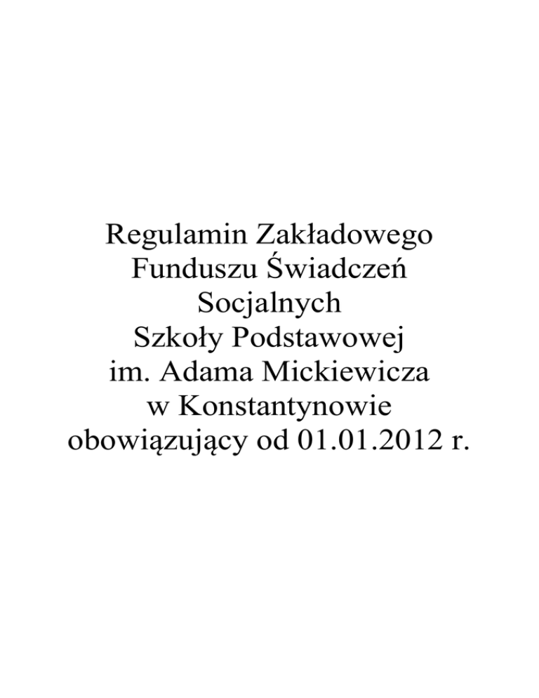Regulamin Zakładowego Funduszu Świadczeń Socjalnych Szkoły Podstawowej im. Adama Mickiewicza w Konstantynowie obowiązujący od 01.01.2012 r. Rozdział I Postanowienia ogólne 1. Regulamin określa szczegółowe zasady gospodarowania środkami zakładowego funduszu świadczeń socjalnych i przeznaczenie tych środków na cele socjalne i pomoc mieszkaniową dla osób uprawnionych i jest tworzony na podstawie: 1) ustawy z dnia 4 marca 1994 r. o zakładowym funduszu świadczeń socjalnych (t. j. Dz. U. z 1996 r. Nr 70 poz. 335 z późniejszymi zmianami); 2) ustawy z dnia 26 stycznia 1982 r. Karta Nauczyciela (t. j. Dz. U. z 2006 r. Nr 97, poz. 674 z późniejszymi zmianami); 3) ustawy z dnia 23 maja 1991 r. o związkach zawodowych (t. j. Dz. U. z 2001 r. Nr 79, poz. 854 z późniejszymi zmianami). 2. Zakładowy Fundusz Świadczeń Socjalnych tworzy się z odpisów: 1) dla nauczycieli – w wysokości ustalanej jako iloczyn planowanej, przeciętnej w danym roku kalendarzowym, liczby nauczycieli zatrudnionych w pełnym i niepełnym wymiarze zajęć (po przeliczeniu na pełny wymiar zajęć) skorygowanej w końcu roku do faktycznej przeciętnej liczby zatrudnionych nauczycieli (po przeliczeniu na pełny wymiar zajęć) i 110 % kwoty bazowej, o której mowa w art. 30 ust. 3 ustawy Karta Nauczyciela, obowiązującej w dniu 1 stycznia danego roku; 2) dla nauczycieli będących emerytami i rencistami – w wysokości 5 % pobieranych przez nich emerytur, rent oraz nauczycielskich świadczeń kompensacyjnych; 3) dla pracowników administracyjnych – w wysokości 37,5 % przeciętnego wynagrodzenia miesięcznego w gospodarce narodowej w roku poprzednim lub w drugim półroczu roku poprzedniego, jeżeli przeciętne wynagrodzenie z tego okresu stanowiło kwotę wyższą; 4) dla pracowników administracji i obsługi będących emerytami lub rencistami – w wysokości 6,75% przeciętnego wynagrodzenia miesięcznego w gospodarce narodowej w roku poprzednim lub w drugim półroczu roku poprzedniego, jeżeli przeciętne wynagrodzenie z tego okresu stanowiło kwotę wyższą. 3. Z wymienionych odpisów tworzy się jeden zakładowy fundusz świadczeń socjalnych, którego administratorem jest dyrektor szkoły. 4. Środki Funduszu zwiększa się o: 1) darowizny oraz zapisy osób fizycznych i prawnych; 2) wpływy z oprocentowania pożyczek udzielonych na cele mieszkaniowe. 5. Środki Funduszu gromadzone są na odrębnym rachunku bankowym. 6. Środki Funduszu przekazywane są na wymieniony rachunek bankowy w następujących terminach: 1) 75% odpisu – do dnia 31 maja danego roku kalendarzowego; 2) 25% odpisu – do dnia 30 września danego roku kalendarzowego. 7. Środki Funduszu niewykorzystane w danym roku kalendarzowym przechodzą na rok następny. 8. Gospodarowanie środkami funduszu odbywa się zgodnie z Regulaminem Zakładowego Funduszu Świadczeń Socjalnych w uzgodnieniu ze związkami zawodowymi. § 1. Uprawnieni do korzystania ze świadczeń i usług finansowanych z zakładowego funduszu świadczeń socjalnych są: 1) pracownicy zatrudnieni w pełnym i niepełnym wymiarze czasu pracy; 2) pracownicy przebywający i zdrowotnych; 3) emeryci i renciści – byli pracownicy; 4) członkowie rodzin pracowników, emerytów i rencistów. na urlopach macierzyńskich, wychowawczych § 2. Członkami rodzin są: 1) małżonek (ka); 2) dzieci własne lub przysposobione do ukończenia 18 roku życia jeżeli nie uczą się; 3) dzieci własne lub przysposobione do ukończenia 25 roku życia jeżeli uczą się; 4) dzieci własne lub przysposobione jeżeli uczą się i pracują, ale ich dochód z pracy nie przekracza w ciągu roku płacy minimalnej. § 3. 1. Środki zakładowego funduszu świadczeń socjalnych dzieli się zgodnie z corocznie sporządzanym planem na: 1) fundusz mieszkaniowy – nie mniej niż 30 % środków; 2) fundusz socjalny. 2. Szczegółowy plan finansowy dochodów i wydatków ustalany jest corocznie, do końca I kwartału w porozumieniu ze związkami zawodowymi. Rozdział II Fundusz mieszkaniowy § 4. 1. Środki zakładowego funduszu mieszkaniowego przeznaczone są na pomoc finansową w budowie, remoncie, uzyskaniu i użytkowaniu mieszkań oraz na inne cele z zakresu potrzeb mieszkaniowych pracowników, emerytów i rencistów. 2. Przez pomoc finansową z funduszu mieszkaniowego należy rozumieć pożyczki na: 1) budowę lub zakup własnego mieszkania lub domu; 2) remont i modernizację mieszkania lub domu; 3) inne cele z zakresu potrzeb mieszkaniowych. § 5. 1. Prawo do korzystania z funduszu mieszkaniowego posiadają: 1) pracownicy zatrudnieni na stałe; 2) pracownicy zatrudnieni na czas określony – jeżeli okres umowy pozwala na spłatę zaciągniętej pożyczki; 3) emeryci i renciści. 2. Z pomocy finansowej na cele mieszkaniowe może korzystać pracownik (emeryt, rencista) niezależnie od współmałżonka. § 6. Podstawą uzyskania pożyczki jest umotywowany wniosek stanowiący załącznik Nr 1 do regulaminu. Wysokość pożyczki uzależniona jest od jej przeznaczenia oraz zasobów finansowych funduszu mieszkaniowego w danym roku. § 7. Pożyczki z funduszu mieszkaniowego podlegają oprocentowaniu w wysokości 1% od kwoty pożyczki. § 8. Pożyczka może być udzielona po spłaceniu pożyczki zaciągniętej wcześniej. O kolejności przyznania pożyczki decyduje data spłacenia pożyczki wcześniej zaciągniętej. § 9. Pożyczkę na budowę lub dokończenie budowy domu można otrzymać do 5 lat od daty zasiedlenia domu pod warunkiem, że jego budowa nie została zakończona. § 10. 1. Czas spłaty pożyczek ustala się na okres do 3 lat (2 – 3 lata). 2. Spłata pożyczki powinna rozpocząć się nie później niż 3 miesiące od daty jej otrzymania. 3. W uzasadnionych przypadkach dyrektor na wniosek zainteresowanego poparty przez organizację związkową może zawiesić spłatę pożyczki na okres do 3 lat. 4. W razie rozwiązania stosunku pracy w drodze porozumienia stron pożyczka 