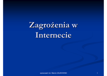ZagroŜenia w Internecie opracował: inŜ. Marcin ZAJDOWSKI 1 ZagroŜenia Rootkit Spyware Malware Trojan Backdoor Exploit Keylogger Dialer opracował: inŜ. Marcin ZAJDOWSKI 2 ZagroŜenia DDOS Phishing Wirus Robak komputerowy opracował: inŜ. Marcin ZAJDOWSKI 3 ZagroŜenia Korzystanie z oprogramowania do skanowania komputera na niebezpiecznych stronach (z serialami do programów itp.) Program taki przejmuje kontrolę nad komputerem i np. wykrada dane (Spy Falcon) Obrona: Process Explorer – do wyświetlenia procesów Start z płyty bootowalnej i kasowanie zagroŜeń w rejestrze opracował: inŜ. Marcin ZAJDOWSKI 4 ZagroŜenia opracował: inŜ. Marcin ZAJDOWSKI 5 ZagroŜenia Pornograficzne pop-upy i hijackery Przypadkowe kliknięcie na hakerskiej stronie powoduje przejęcie kontroli nad przeglądarką przez CoolWebSearch Obrona: KillBox – usuwanie procesów opracował: inŜ. Marcin ZAJDOWSKI 6 ZagroŜenia opracował: inŜ. Marcin ZAJDOWSKI 7 ZagroŜenia Rootkit – przechwytuje funkcje systemowe, modyfikuje SO i dostarcza fałszywych odpowiedzi na wywołania funkcji przez co trudno zidentyfikować zagroŜenie w MenedŜerze Zadań, ukrywa trojany i spyware Obrona : zainstalować program do wyszukiwania rootkitów (BackLight, RootkitRevealer), usunąć zagroŜenie Przeskanować komputer program antywirusowym Jeszcze raz uruchomić program antyrootkitowy opracował: inŜ. Marcin ZAJDOWSKI 8 ZagroŜenia opracował: inŜ. Marcin ZAJDOWSKI 9