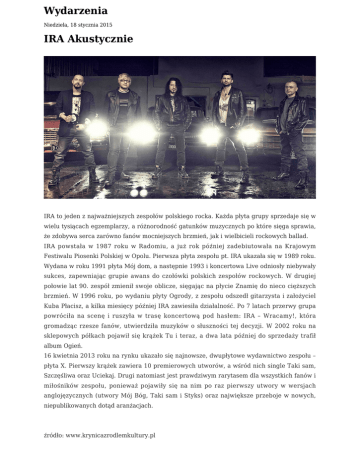 Wydarzenia Niedziela, 18 stycznia 2015 IRA Akustycznie IRA to jeden z najważniejszych zespołów polskiego rocka. Każda płyta grupy sprzedaje się w wielu tysiącach egzemplarzy, a różnorodność gatunków muzycznych po które sięga sprawia, że zdobywa serca zarówno fanów mocniejszych brzmień, jak i wielbicieli rockowych ballad. IRA powstała w 1987 roku w Radomiu, a już rok później zadebiutowała na Krajowym Festiwalu Piosenki Polskiej w Opolu. Pierwsza płyta zespołu pt. IRA ukazała się w 1989 roku. Wydana w roku 1991 płyta Mój dom, a następnie 1993 i koncertowa Live odniosły niebywały sukces, zapewniając grupie awans do czołówki polskich zespołów rockowych. W drugiej połowie lat 90. zespół zmienił swoje oblicze, sięgając na płycie Znamię do nieco cięższych brzmień. W 1996 roku, po wydaniu płyty Ogrody, z zespołu odszedł gitarzysta i założyciel Kuba Płacisz, a kilka miesięcy później IRA zawiesiła działalność. Po 7 latach przerwy grupa powróciła na scenę i ruszyła w trasę koncertową pod hasłem: IRA – Wracamy!, która gromadząc rzesze fanów, utwierdziła muzyków o słuszności tej decyzji. W 2002 roku na sklepowych półkach pojawił się krążek Tu i teraz, a dwa lata później do sprzedaży trafił album Ogień. 16 kwietnia 2013 roku na rynku ukazało się najnowsze, dwupłytowe wydawnictwo zespołu – płyta X. Pierwszy krążek zawiera 10 premierowych utworów, a wśród nich single Taki sam, Szczęśliwa oraz Uciekaj. Drugi natomiast jest prawdziwym rarytasem dla wszystkich fanów i miłośników zespołu, ponieważ pojawiły się na nim po raz pierwszy utwory w wersjach anglojęzycznych (utwory Mój Bóg, Taki sam i Styks) oraz największe przeboje w nowych, niepublikowanych dotąd aranżacjach. źródło: www.krynicazrodlemkultury.pl