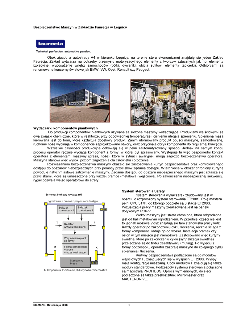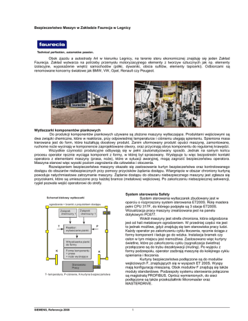 Bezpieczeństwo Maszyn w Zakładzie Faurecja w Legnicy Obok zjazdu a autostrady A4 w kierunku Legnicy, na terenie steru ekonomicznej znajduję się jeden Zakład Faurecja. Zakład wytwarza na potrzeby przemysłu motoryzacyjnego elementy z tworzyw sztucznych jak np. elementy izolacyjne, wyposażenie wnętrz samochodów (półki, dywaniki, obicia sufitów, elementy tapicerki). Odbiorcami są renomowane koncerny światowe jak BMW, VW, Opel, Renault czy Peugeot. Wytłaczarki komponentów piankowych Do produkcji komponentów piankowych używane są złożone maszyny wytłaczające. Produktami wejściowymi są dwa związki chemiczne, które w reaktorze, przy odpowiedniej temperaturze i ciśnieniu ulegają spienieniu. Spieniona masa kierowana jest do form, które kształtują docelowy produkt. Zanim uformowany produkt opuści maszynę, zamontowane, ruchome noże wycinają w komponencie zaprojektowane otwory, oraz przycinają obrys komponentu do regularnej krawędzi. Wszystkie czynności produkcyjne odbywają się w pełni zautomatyzowany sposób. Jednak na samym końcu procesu operator ręcznie wyciąga komponent z formy, w której był sprasowany. Występuje tu więc bezpośredni kontakt operatora z elementami maszyny (prasa, noże), które w sytuacji awaryjnej, mogą zagrozić bezpieczeństwu operatora. Maszyna stanowi więc wysoki poziom zagrożenia dla człowieka i otoczenia. Rozwiązaniem bezpieczeństwa maszyny okazało się zastosowanie kurtyn bezpieczeństwa oraz kontrolowanego dostępu do obszarów niebezpiecznych przy pomocy przycisków żądania dostępu. Wtargnięcie w obszar chroniony kurtyną powoduje natychmiastowe zatrzymanie maszyny. Żądanie dostępu do obszaru niebezpiecznego maszyny jest zgłasza się przyciskami, które są umieszczone przy każdej bramce (metalowa) wejściowej. Po zakończeniu niebezpiecznej sekwencji, rygiel pozwala wejść operatorowi do strefy. Schemat blokowy wytłaczarki ogrodzenie + bramki z przyciskiem dostępu Związek chemiczny 1 T Związek chemiczny 1 Reaktor: wytwarzanie pianki P Wtryskiwarka pianki do formy K Forma komponentu + prasa + noże wycinające K Stanowisko Pracy T- temperatura, P-ciśnienie, K-kurtyna b ezpieczeństwa SIEMENS, Referencja 2008 System sterowania Safety System sterowania wytłaczarek zbudowany jest w oparciu o rozproszony system sterowania ET200S. Rolę mastera pełni CPU 317F, do którego podpięte są 3 stacje ET200S. Wizualizacja pracy maszyny zrealizowana jest na panelu dotykowym PC677. Wokół maszyny jest strefa chroniona, która odgrodzona jest od hali metalowym ogrodzeniem. W przedniej części nie jest to jednak możliwe, gdyż znajdują się tam stanowiska pracy ludzi. Każdy operator po zakończeniu cyklu tłoczenia, ręcznie ściąga z formy komponent i ładuje go do wózka. Instalacja bramek czy osłon w tym miejscu jest niemożliwa. Zastosowano więc kurtyny świetlne, które po zakończeniu cyklu (sygnalizacja świetlna) przełączane są do trybu dezaktywacji (muting). Po wyjęciu z formy podzespołu, operator zazbrają maszynę do kolejnego cyklu spieniania i tłoczenia. Kurtyny bezpieczeństwa podłączone są do modułów wejściowych F, znajdujących się w wyspach ET 200S. Wyspy mają konfigurację mieszaną. Obok modułów F znajdują się także moduły standardowe. Podzespoły systemu sterowania połączone są magistralą PROFIBUS. Oprócz wymienionych, do sieci podłączone są także przekształtniki Micromaster oraz MASTERDRIVE. 1 Serwis maszyn Serwisowaniem maszyn na terenie zakładu zajmuje się lokalna komórka inżynierów automatyków. Oprócz bieżących napraw mają też możliwość wprowadzania racjonalizacji / ulepszeń w maszynach, co się zdarza zwłaszcza po wdrożeniu nowych jednostek. Inżynierowie zajmują się także konstrukcjami nowych urządzeń, także tych, które wymagających użycia urządzeń zabezpieczających Safety. Znajomość technologii oraz doświadczenie gwarantują, więc wysoki poziom stosowanych rozwiązań. Zakład Faurecja Ul. Jaworzyńska 297 59-220 LEGNICA Telefon: +48 76 866 53 00 Faks: +48 76 866 53 01 www.faurecia.com.pl Galeria zdjęć: Rys. 3 Widok nowej, jeszcze nie uruchomionej maszyny Rys. 2 Pracująca maszyna - perspektywa Rys. 4 Sterowania: maszyny nr 2 Rys. 3 Szafa sterująca z SIMATIC F SIEMENS, Referencja 2008 2 Rys. 6 Wyspa ET200S w szafce Rys. 5 Stacyjka sterowania ręcznego Rys. 7 Panel operatorski do sterowania maszyną Rys. 8 Kurtyna bezpieczeństwa Rys. 19 Aparatura sterująca wytłaczarką Rys. 9 Widok boczny wytłaczarki SIEMENS, Referencja 2008 3