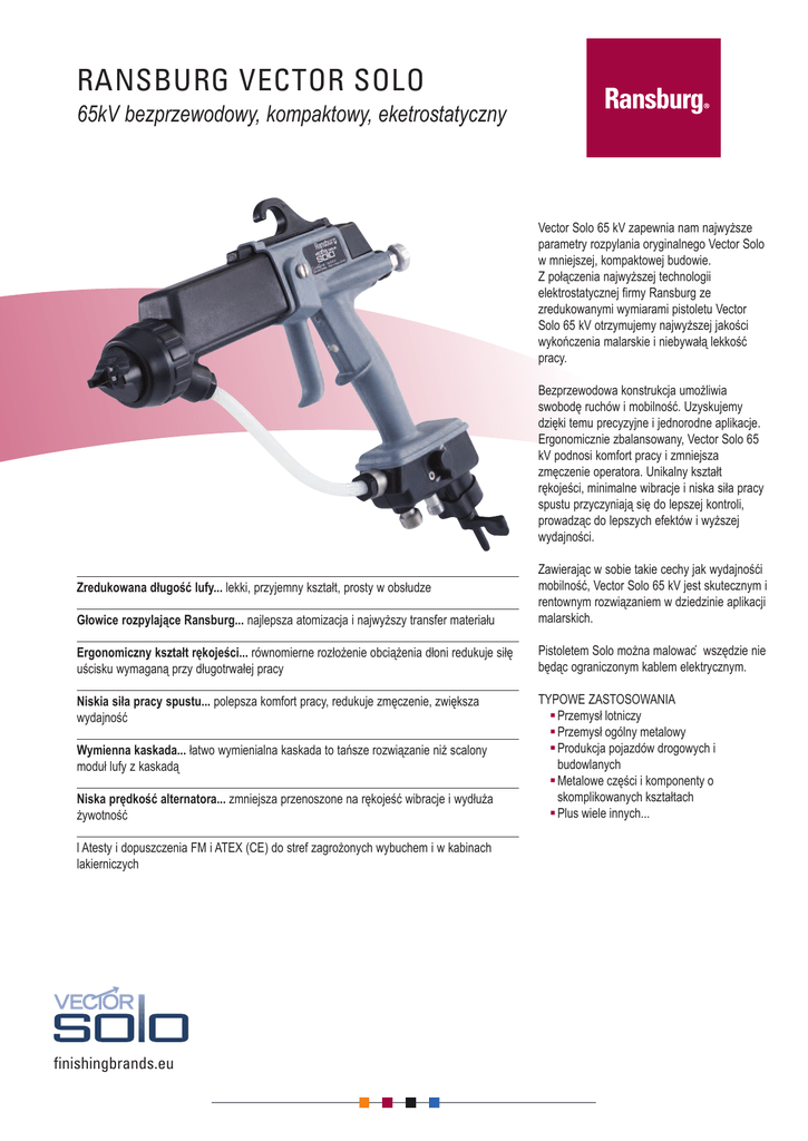 RANSBURG VECTOR SOLO 65kV bezprzewodowy, kompaktowy, eketrostatyczny Vector Solo 65 kV zapewnia nam najwyższe parametry rozpylania oryginalnego Vector Solo w mniejszej, kompaktowej budowie. Z połączenia najwyższej technologii elektrostatycznej firmy Ransburg ze zredukowanymi wymiarami pistoletu Vector Solo 65 kV otrzymujemy najwyższej jakości wykończenia malarskie i niebywałą lekkość pracy. Bezprzewodowa konstrukcja umożliwia swobodę ruchów i mobilność. Uzyskujemy dzięki temu precyzyjne i jednorodne aplikacje. Ergonomicznie zbalansowany, Vector Solo 65 kV podnosi komfort pracy i zmniejsza zmęczenie operatora. Unikalny kształt rękojeści, minimalne wibracje i niska siła pracy spustu przyczyniają się do lepszej kontroli, prowadząc do lepszych efektów i wyższej wydajności. Głowice rozpylające Ransburg... najlepsza atomizacja i najwyższy transfer materiału Zawierając w sobie takie cechy jak wydajnośći mobilność, Vector Solo 65 kV jest skutecznym i rentownym rozwiązaniem w dziedzinie aplikacji malarskich. Ergonomiczny kształt rękojeści... równomierne rozłożenie obciążenia dłoni redukuje siłę uścisku wymaganą przy długotrwałej pracy Pistoletem Solo można malowac´ wszędzie nie będąc ograniczonym kablem elektrycznym. Niskia siła pracy spustu... polepsza komfort pracy, redukuje zmęczenie, zwiększa wydajność TyPowE ZASToSowAniA Przemysł lotniczy Przemysł ogólny metalowy Produkcja pojazdów drogowych i budowlanych Metalowe części i komponenty o skomplikowanych kształtach Plus wiele innych... Zredukowana długość lufy... lekki, przyjemny kształt, prosty w obsłudze Wymienna kaskada... łatwo wymienialna kaskada to tańsze rozwiązanie niż scalony moduł lufy z kaskadą Niska prędkość alternatora... zmniejsza przenoszone na rękojeść wibracje i wydłuża żywotność l Atesty i dopuszczenia FM i ATEX (CE) do stref zagrożonych wybuchem i w kabinach lakierniczych finishingbrands.eu RANSBURG VECTOR SOLO 65kV bezprzewodowy, kompaktowy, eketrostatyczny Scan QR Code for more product information. Akcesoria osłony na pistolet Bardzo giętkie elektrody 2K/ Uszczelnienia regulowane nieregulowane uszczelnienia Technologia Trans-Tech Zestaw strumienia okrągłego Zestaw uszczelek Zawór kompensacyjny rozpylania Urządzenia pomiarowe Led sygnalizacji napięcia... łatwy i prosty odczyt, umieszczony w tylnej części pistoletu. 79965 - អអអអអ Rodzaj rurki materiału 0 = Standardowa rurka .093” iD x 3/8” oD 1 = Spirala (skręcona) .093” iD - Low Flow Technologia rozpylania 0 = Standard, gł. pow. 65kV, dysza 1.4mm, #44 1 = Standard, gł. pow. 65kV, dysza 1.8mm, #45 2 = Trans-Tech, gł. pow. 122kV, dysza 1.8mm, #245 3 = Strumień okrągły Typ przewodu powietrza 0 = bez prz. pow. (tylko pistolet) 1 = przewód standardowy 2 = Przewód standardowy z szybkozłączką Bezprzewodowa mobilność... krótki czas instalacji i demontażu Regulacja poziomu napięcia... 40 lub 65 kV Vector Solo 65kV dostępne modele Dł. przewód powietrza 0 = bez przewodu pow. (tylko pistolet) 1 = 10m (33ft) 2 = 15m (49ft) 3 = 20m (60ft) 4 = 30m (99ft) High-Low przełącznik poziomu napięia... łatwa regulacja pola elektrostatycznego przy pracy z wnękami Typ spustu 2 = spust na dwa palce Specyfikacja Długość Ciężar Dł. przewodu 257mm / 10.1 in 834g / 29.4 oz 10m, 15m, 20m, 30m Dane elekTRyczne napięcie pracy natężenie Rezystancja farby 65kV DC (-) Max 130 Microamps Max .1M ohm to infinity Dane mechaniczne Przepływ Ciśnienie pracy Materiał Powietrze Temp. otoczenia Zużycie pow. Poziom hałasu Poziom wibracji 1000ml/min 0-6.9bar / 0-100psi dysza/zależy od lepkości mat. 0-6.9bar / 0-100psi 0-40°C / 32-104°F 470 SLPM / 16.6 SCFM @ 2.8bar / 40psig @ wejście rękojeść 92dB(A) @ 2.8bar / 40psig @ wejście rękojeść, 1m od pistoletu .0065m/S2 @ 2.8bar / 40psig @ wejście rękojeść Dodatkowe informacje w dokumentacji techniczno ruchowej pistoletu Vector Solo 65kV. Sales and Service through our Global Network of Industrial Distributors Binks International Offices Americas: USA Europe/Asia/Africa: United Kingdom France Germany Pacific Rim: China Mexico Japan Brazil Australia © Finishing Brands Holdings Inc. DeVilbiss, Ransburg, BGK and Binks are registered trademarks of Finishing Brands. Models and specifications subject to change without notice. All rights reserved. www.finishingbrands.eu email: [email protected] finishingbrands.eu ARB - 06.13 - PL 1814
