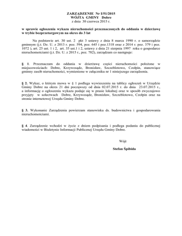 ZARZĄDZENIE Nr I/51/2015 WÓJTA GMINY Dobre z dnia 30 czerwca 2015 r. w sprawie ogłoszenia wykazu nieruchomości przeznaczonych do oddania w dzierżawę w trybie bezprzetargowym na okres do 3 lat Na podstawie art. 30 ust. 2 pkt 3 ustawy z dnia 8 marca 1990 r. o samorządzie gminnym (j.t. Dz. U. z 2013 r. poz. 594, poz. 645 i poz.1318 oraz z 2014 r. poz. 379 i poz. 1072 ), art. 25 ust. 1 i 2, art. 35 ust.1 i 2, ustawy z dnia 21 sierpnia 1997 roku o gospodarce nieruchomościami (j.t. Dz. U. z 2015 r., poz. 782), zarządzam co następuje: § 1. Przeznaczam do oddania w dzierżawę części nieruchomości położone w miejscowościach: Dobre, Krzywosądz, Bronisław, Szczeblotowo, Czołpin, stanowiące gminny zasób nieruchomości, wymienione w załączniku nr 1 niniejszego zarządzenia. § 2. Wykaz, o którym mowa w § 1 podlega wywieszeniu na tablicy ogłoszeń w Urzędzie Gminy Dobre na okres 21 dni począwszy od dnia 02.07.2015 r. do dnia 23.07.2015 r., a informację o ogłoszeniu wykazu podaje się w prasie lokalnej oraz w sposób zwyczajowo przyjęty w sołectwach Dobre, Krzywosądz, Bronisław, Szczeblotowo, Czołpin oraz na stronie internetowej Urzędu Gminy Dobre. § 3. Wykonanie Zarządzenia powierzam stanowisku ds. budownictwa i gospodarowania nieruchomościami. § 4. Zarządzenie wchodzi w życie z dniem podpisania i podlega podaniu do publicznej wiadomości w Biuletynie Informacji Publicznej Urzędu Gminy Dobre. Wójt Stefan Śpibida Załącznik Nr 1 do Zarządzenia nr I/51/2015 Wójta Gminy Dobre z dnia 30 czerwca 2015 r. RGIK.BiGN.6845.4.2015 Wykaz nieruchomości przeznaczonych do oddania w dzierżawę Na podstawie art. 35 ust. 1 i 2 ustawy z dnia 21 sierpnia 1997 r. o gospodarce nieruchomościami (j.t. Dz. U. z 2015 r., poz. 782), Wójt Gminy Dobre podaje do publicznej wiadomości wykaz nieruchomości przeznaczonych oddania w dzierżawę na okres do 3 lat Przedmiotem wykazu jest: 5 części nieruchomości gruntowych o łącznej powierzchni 7,2 m2, z przeznaczeniem na 5 miejsc pod ustawienie pojemników metalowych na odzież używaną (powierzchnia jednego pojemnika 1,20 x 1,20 m2): 1) Wyszczególnienie Lp. Cześć Cześć działki nieruchomości oznaczonej Powierzchgruntowej w 2 położona w ewidencji nia w m obrębie: gruntów Nr: Przeznaczenie i sposób zagospodarowania Nr Księgi Wieczystej 1. Dobre 121/12 1,44 WL1R/00020595/4 2. Krzywosądz 226/7 1,44 WL1R/00014120/9 3. Bronisław 226/8 1,44 WL1R/00014883/5 4. Szczeblotowo 61/1 1,44 WL1R/00015648/3 5. Czołpin 49/4 1,44 WL1R/00009618/9 Nieruchomość stanowi teren targowiska, na którym nie obowiązuje miejscowy plan zagospodarowania przestrzennego. Nieruchomość stanowi teren świetlicy wiejskiej, na którym nie obowiązuje miejscowy plan zagospodarowania przestrzennego. Nieruchomość stanowi teren świetlicy wiejskiej, na którym nie obowiązuje miejscowy plan zagospodarowania przestrzennego. Nieruchomość stanowi teren świetlicy wiejskiej, na którym nie obowiązuje miejscowy plan zagospodarowania przestrzennego. Nieruchomość stanowi teren świetlicy wiejskiej, na którym nie obowiązuje miejscowy plan zagospodarowania przestrzennego. 2) Termin zagospodarowania nieruchomości – od 1 października 2015 r. (po podpisaniu umowy dzierżawy). 3) Czynsz dzierżawny – minimum 2 zł 50 gr za 1 m2 netto rocznie, płatny z góry w terminie do 15 października 2015 r. oraz podatek należny, jeśli dotyczy. 4) Nieruchomość przeznaczona do wydzierżawienia w drodze bezprzetargowej na okres do trzech lat.