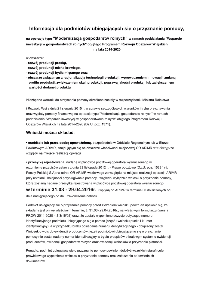 Informacja dla podmiotów ubiegających się o przyznanie pomocy, na operacje typu "Modernizacja gospodarstw rolnych" w ramach poddziałania "Wsparcie inwestycji w gospodarstwach rolnych" objętego Programem Rozwoju Obszarów Wiejskich na lata 2014-2020 w obszarze: - rozwój produkcji prosiąt, - rozwój produkcji mleka krowiego, - rozwój produkcji bydła mięsnego oraz - obszarze związanym z racjonalizacją technologii produkcji, wprowadzeniem innowacji, zmianą profilu produkcji, zwiększeniem skali produkcji, poprawą jakości produkcji lub zwiększeniem wartości dodanej produktu Niezbędne warunki do otrzymania pomocy określone zostały w rozporządzeniu Ministra Rolnictwa i Rozwoju Wsi z dnia 21 sierpnia 2015 r. w sprawie szczegółowych warunków i trybu przyznawania oraz wypłaty pomocy finansowej na operacje typu "Modernizacja gospodarstw rolnych" w ramach poddziałania "Wsparcie inwestycji w gospodarstwach rolnych" objętego Programem Rozwoju Obszarów Wiejskich na lata 2014-2020 (Dz.U. poz. 1371). Wnioski można składać: • osobiście lub przez osobę upoważnioną, bezpośrednio w Oddziale Regionalnym lub w Biurze Powiatowym ARiMR, znajdującym się na obszarze właściwości miejscowej OR ARiMR właściwego ze względu na miejsce realizacji operacji • przesyłką rejestrowaną, nadaną w placówce pocztowej operatora wyznaczonego w rozumieniu przepisów ustawy z dnia 23 listopada 2012 r. - Prawo pocztowe (Dz.U. poz. 1529 ) (tj. Poczty Polskiej S.A) na adres OR ARiMR właściwego ze względu na miejsce realizacji operacji. ARiMR przy ustalaniu kolejności przysługiwania pomocy uwzględni wyłącznie wnioski o przyznanie pomocy, które zostaną nadane przesyłką rejestrowaną w placówce pocztowej operatora wyznaczonego W terminie 31.03 - 29.04.2016r. i wpłyną do ARiMR w terminie 30 dni liczonych od dnia następującego po dniu zakończenia naboru. Podmiot ubiegający się o przyznanie pomocy przed złożeniem wniosku powrruen upewnić się, że składany jest on we właściwym terminie, tj. 31.03-.29.04.2016r., na właściwym formularzu (wersja PROW 2014-2020 4.1.3/16/02) oraz, że zostały wypełnione pozycje dotyczące numeru identyfikacyjnego podmiotu ubiegającego się o pomoc (część /I wniosku punkt 1 Numer identyfikacyjny), a w przypadku braku posiadania numeru identyfikacyjnego - dołączony został Wniosek o wpis do ewidencji producentów, jeżeli podmiotowi ubiegającemu się o przyznanie pomocy nie został nadany numer identyfikacyjny w trybie przepisów o krajowym systemie ewidencji producentów, ewidencji gospodarstw rolnych oraz ewidencji wniosków o przyznanie płatności. Ponadto, podmiot ubiegający się o przyznanie pomocy powinien dołożyć wszelkich starań celem prawidłowego wypełnienia wniosku o przyznanie pomocy oraz załączenia odpowiednich dokumentów.