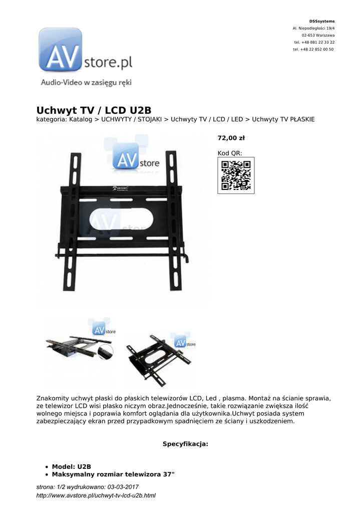 DSSsystems Al. Niepodległości 19/4 02-653 Warszawa tel. +48 881 22 33 22 tel. +48 22 852 00 50 Uchwyt TV / LCD U2B kategoria: Katalog > UCHWYTY / STOJAKI > Uchwyty TV / LCD / LED > Uchwyty TV PŁASKIE 72,00 zł Kod QR: Znakomity uchwyt płaski do płaskich telewizorów LCD, Led , plasma. Montaż na ścianie sprawia, ze telewizor LCD wisi płasko niczym obraz.Jednocześnie, takie rozwiązanie zwiększa ilość wolnego miejsca i poprawia komfort oglądania dla użytkownika.Uchwyt posiada system zabezpieczający ekran przed przypadkowym spadnięciem ze ściany i uszkodzeniem. Specyfikacja: Model: U2B Maksymalny rozmiar telewizora 37" strona: 1/2 wydrukowano: 03-03-2017 http://www.avstore.pl/uchwyt-tv-lcd-u2b.html maksymalny rozstaw otworów montażowych: 28 cm x 24 cm Udźwig 40kg. Dystans od ściany 3cm Uchwyt posiada zabezpieczenie w postaci śrub uniemożliwiających strącenie ekranu Bardzo solidnie i precyzyjnie wykonany W zestawie: Śruby montażowe ekranu oraz śruby zabezpieczające, Kołki rozporowe, Wkręty, Instrukcję obsługi Instrukcja w języku polskim Kolor czarny Jest to oryginalny produkt, pochodzący bezpośrednio od polskiego dystrybutora i posiadający 12 miesięcy gwarancji. Do uchwytu bez problemu przymocujemy ekran w standardzie VESA 200 x 200, 200 x 100, 100 x 100 i 75 x 75 a dzięki dodatkowym otworom pozwala na przymocowanie monitorów o rozstawie śrub w poziomie do 28m i w pionie do 24cm. Dzięki licznym otworom montażowym w płycie nośnej uchwytu możliwy jest montaż produktu na ścianach betonowych i drewnianych (musi być przykręcony do belek). strona: 2/2 wydrukowano: 03-03-2017 http://www.avstore.pl/uchwyt-tv-lcd-u2b.html