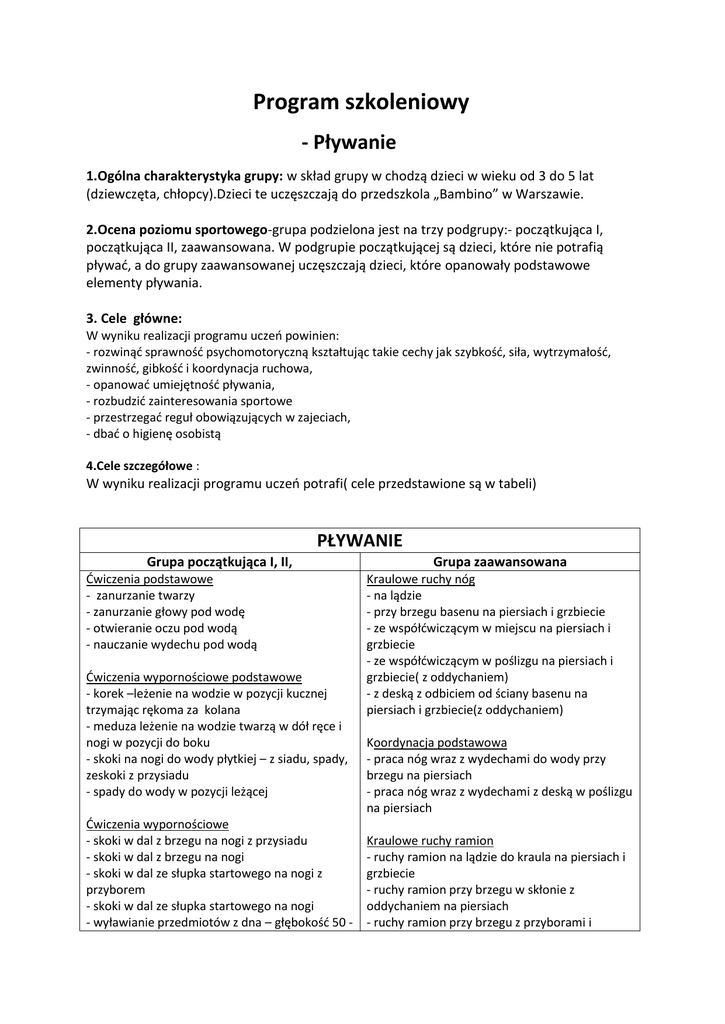 Program szkoleniowy - Pływanie 1.Ogólna charakterystyka grupy: w skład grupy w chodzą dzieci w wieku od 3 do 5 lat (dziewczęta, chłopcy).Dzieci te uczęszczają do przedszkola „Bambino” w Warszawie. 2.Ocena poziomu sportowego-grupa podzielona jest na trzy podgrupy:- początkująca I, początkująca II, zaawansowana. W podgrupie początkującej są dzieci, które nie potrafią pływad, a do grupy zaawansowanej uczęszczają dzieci, które opanowały podstawowe elementy pływania. 3. Cele główne: W wyniku realizacji programu uczeo powinien: - rozwinąd sprawnośd psychomotoryczną kształtując takie cechy jak szybkośd, siła, wytrzymałośd, zwinnośd, gibkośd i koordynacja ruchowa, - opanowad umiejętnośd pływania, - rozbudzid zainteresowania sportowe - przestrzegad reguł obowiązujących w zajeciach, - dbad o higienę osobistą 4.Cele szczegółowe : W wyniku realizacji programu uczeo potrafi( cele przedstawione są w tabeli) PŁYWANIE Grupa początkująca I, II, Ćwiczenia podstawowe - zanurzanie twarzy - zanurzanie głowy pod wodę - otwieranie oczu pod wodą - nauczanie wydechu pod wodą Ćwiczenia wypornościowe podstawowe - korek –leżenie na wodzie w pozycji kucznej trzymając rękoma za kolana - meduza leżenie na wodzie twarzą w dół ręce i nogi w pozycji do boku - skoki na nogi do wody płytkiej – z siadu, spady, zeskoki z przysiadu - spady do wody w pozycji leżącej Ćwiczenia wypornościowe - skoki w dal z brzegu na nogi z przysiadu - skoki w dal z brzegu na nogi - skoki w dal ze słupka startowego na nogi z przyborem - skoki w dal ze słupka startowego na nogi - wyławianie przedmiotów z dna – głębokośd 50 - Grupa zaawansowana Kraulowe ruchy nóg - na lądzie - przy brzegu basenu na piersiach i grzbiecie - ze współdwiczącym w miejscu na piersiach i grzbiecie - ze współdwiczącym w poślizgu na piersiach i grzbiecie( z oddychaniem) - z deską z odbiciem od ściany basenu na piersiach i grzbiecie(z oddychaniem) Koordynacja podstawowa - praca nóg wraz z wydechami do wody przy brzegu na piersiach - praca nóg wraz z wydechami z deską w poślizgu na piersiach Kraulowe ruchy ramion - ruchy ramion na lądzie do kraula na piersiach i grzbiecie - ruchy ramion przy brzegu w skłonie z oddychaniem na piersiach - ruchy ramion przy brzegu z przyborami i 90 cm -nurki w dal w linii prostej do 4-5 m Poślizgi - leżenie na piersiach i grzbiecie – z przyborem ( deski, makaron itp.) - leżenie na piersiach i grzbiecie – bez przyboru - poślizg na piersiach z odbicia od dna basenu z przyborem - poślizg na piersiach z odbicia od dna basenu bez przyboru - nauczanie wydechów wraz z poślizgiem z przyborem - nauczanie wydechów wraz z poślizgiem bez przyboru - poślizg na grzbiecie z odbicia od dna basenu z przyborem - poślizg na grzbiecie z odbicia od dna basenu bez przyboru - poślizg na piersiach i grzbiecie z odbicia od ściany basenu z przyborem - poślizg na piersiach i grzbiecie z odbicia od ściany basenu bez przyboru Kraulowe ruchy nóg - na lądzie - przy brzegu basenu na piersiach i grzbiecie - ze współdwiczącym w miejscu na piersiach i grzbiecie - ze współdwiczącym w poślizgu na piersiach i grzbiecie( z oddychaniem) - z deską z odbiciem od ściany basenu na piersiach i grzbiecie(z oddychaniem) Koordynacja podstawowa - praca nóg wraz z wydechami do wody przy brzegu na piersiach - praca nóg wraz z wydechami z deską w poślizgu na piersiach Kraulowe ruchy ramion - ruchy ramion na lądzie do kraula na piersiach i grzbiecie - ruchy ramion przy brzegu w skłonie z oddychaniem na piersiach - ruchy ramion przy brzegu z przyborami i współdwiczącym na grzbiecie Koordynacja – kraul na piersiach i grzbiecie - ruchy ramion przy brzegu z oddychaniem i pracą nóg na piersiach - ruchy ramion ze współdwiczącym z współdwiczącym na grzbiecie Koordynacja – kraul na piersiach i grzbiecie - ruchy ramion przy brzegu z oddychaniem i pracą nóg na piersiach - ruchy ramion ze współdwiczącym z oddychaniem i pracą nóg w miejscu i w marszu na piersiach - ruchy ramion z deską lub ze współdwiczącym z oddychaniem i pracą nóg na grzbiecie -naprzemienne ruchy ramion z deskąprzytrzymanie dłoni przy biodrach na grzbiecie - naprzemienne ruchy ramion bez deski, przytrzymanie dłoni przy biodrach na grzbiecie - naprzemienne ruchy ramion z deską, przytrzymanie ramion za głową na grzbiecie - naprzemienne ruchy ramion bez deski przytrzymanie ramion za głową na grzbiecie - naprzemienne ruchy ramion do grzbietu -na piersiach ruchy jednego ramienia z deską i z oddechem -na piersiach ruchy drugiego ramienia z deską i z oddechem - kraulowe ruchy ramion naprzemienne(dokładanka) bez oddechu z deską - kraulowe ruchy ramion naprzemienne z oddechem i z deską - kraulowe ruchy ramion naprzemienne z oddechem i bez deski Skok i do wody na głowę -wślizgi do wody z przysiadu na głowę -skoki na głowę do wody z przysiadu -skoki na głowę z półprzysiadu lub z klęku na jednym kolanie - skoki na głowę z pozycji wykrocznej z brzegu -skoki na głowę z siadu ze słupka - skoki na głowę z przysiadu ze słupka - skoki na głowę z pozycji skłonu w przód, ramiona w przodzie, głowa między ramionami, stopniowe wytracanie równowagi w ostatniej fazie wybicie z obu nóg - skoki na głowę z pozycji startowej wraz z szybowaniem pod wodą Przewroty w wodzie- nawrót koziołkowy – podstawy -na lądzie-leżenie na plecach, nogi złączone – uginania nóg do pozycji kucznej powrót - w staniu –skrętoskłon tułowia do nogi lewej, następnie do prawej oddychaniem i pracą nóg w miejscu i w marszu na piersiach - ruchy ramion z deską lub ze współdwiczącym z oddychaniem i pracą nóg na grzbiecie -naprzemienne ruchy ramion z deskąprzytrzymanie dłoni przy biodrach na grzbiecie - naprzemienne ruchy ramion bez deski, przytrzymanie dłoni przy biodrach na grzbiecie - naprzemienne ruchy ramion z deską, przytrzymanie ramion za głową na grzbie
