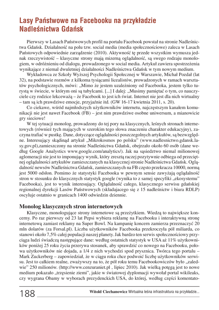 Lasy Pañstwowe na Facebooku na przyk³adzie Nadleœnictwa Gdañsk Pierwszy w Lasach Pañstwowych profil na portalu Facebook powsta³ na stronie Nadleœnictwa Gdañsk. Dzia³alnoœæ na polu tzw. social media (media spo³ecznoœciowe) zaleca w Lasach Pañstowych odpowiednie zarz¹dzenie (2010). Aktywnoœæ tê przede wszystkim wymusza jednak rzeczywistoœæ – klasyczne strony maj¹ mizern¹ ogl¹dalnoœæ, s¹ swego rodzaju monologiem, w odró¿nieniu od dialogu, prowadzonego w social media. Artyku³ zawiera spostrze¿enia wynikaj¹ce z niemal dwuletniej dzia³alnoœci Nadleœnictwa Gdañsk w tym nowym medium. Wyk³adowca ze Szko³y Wy¿szej Psychologii Spo³ecznej w Warszawie, Micha³ Pozda³ (lat 32), na podstawie rozmów z kilkoma tysi¹cami licealistów, prowadzonych w ramach warsztatów psychologicznych, mówi: „Mimo ¿e jestem uzale¿niony od Facebooka, jestem tylko turyst¹ w œwiecie, w którym oni s¹ tubylcami. [...] I dalej: „Musimy pamiêtaæ o tym, co nauczyciele czy rodzice lekcewa¿¹ – ¿e Facebook to jest ich œwiat. Internet nie jest dla nich wirtualny – tam s¹ ich prawdziwe emocje, przyjaŸnie itd. (GW 16-17 kwietnia 2011, s. 20). Co ciekawe, wœród najm³odszych u¿ytkowników internetu, najczêstszym kana³em komunikacji nie jest nawet Facebook (FB) – jest nim prawdziwe osobne uniwersum, a mianowicie gry sieciowe! W tej sytuacji monolog, prowadzony do tej pory na klasycznych, leœnych stronach internetowych (równie¿ tych maj¹cych w szerokim tego s³owa znaczeniu charakter edukacyjny), zaczyna trafiaæ w pustkê. Dane, dotycz¹ce ogl¹dalnoœci poszczegolnych artyku³ów, s¹ bezwzglêdne. Interesuj¹cy sk¹din¹d artyku³ „Mikrokosmos po polsku” (www.nadlesnictwo.gdansk.lasy.gov.pl),zamieszczony na stronie Nadleœnictwa Gdañsk, obejrza³o oko³o 60 osób (dane wed³ug Google Analystics www.google.com/analytics/). Jak na s¹siedztwo niemal milionowej aglomeracji nie jest to imponuj¹cy wynik, który zreszt¹ raczej pozytywnie odbiega od przeciêtnej ogl¹dalnoœci artyku³ów zamieszczanych na klasycznej stronie Nadleœnictwa Gdañsk. Ogl¹dalnoœæ newsów Nadleœnictwa Gdañsk, zamieszczanych na FB czêsto przekracza 10000, norm¹ jest 5000 ods³on. Pomimo ¿e statystyki Facebooka w pewnym sensie zawy¿aj¹ ogl¹dalnoœæ stron w stosunku do klasycznych statystyk google (wynika to z samej specyfiki „ekosystemu” Facebooka), jest to wynik interesuj¹cy. Ogl¹dalnoœæ ca³ego, klasycznego serwisu gdañskiej regionalnej dyrekcji Lasów Pañstwowych (sk³adajacego siê z 15 nadleœnictw i biura RDLP) oscyluje ostatnio w granicach 1400 odwiedzin dziennie. Monolog klasycznych stron internetowych Klasyczne, monologuj¹ce strony internetowe s¹ prze¿ytkiem. Wiedz¹ to najwiêksze koncerny. Po raz pierwszy od 23 lat Pepsi wybiera reklamê na Facebooku i interaktywn¹ stronê internetow¹ zamiast reklamy na Super Bowl. Na kampaniê koncern zamierza przeznaczyæ 20 mln dolarów (za Forsal.pl). Liczba u¿ytkowników Facebooka przekroczy³a pó³ miliarda, co stanowi oko³o 7,5% ca³ej populacji naszej planety. Jak bardzo ten serwis spo³ecznoœciowy przyci¹ga ludzi œwiadcz¹ nastêpuj¹ce dane: wed³ug ostatnich statystyk w USA a¿ 11% u¿ytkowników poni¿ej 25 roku ¿ycia przerywa stosunek, aby sprawdziæ co nowego na Facebooku, po³owa u¿ytkowników nie dojada, a 1/4 z nich wychodzi spod prysznica. Twórca tego portalu – Mark Zuckerberg – zapowiedzia³, ¿e w ci¹gu roku chce podwoiæ liczbê u¿ytkowników serwisu. Jest to ca³kiem realne, zwa¿ywszy na to, ¿e pó³ roku temu Facebookowiczów by³o „zaledwie” 250 milionów. (http://www.cenzuraniet.pl , lipiec 2010). Jak wielk¹ potêg¹ jest to nowe medium pokaza³o „trzêsienie ziemi”, jakie w œwiatowej dyplomacji wywo³a³ portal wikileaks, czy wygrana Obamy w wyborach prezydenckich USA, do której, wed³ug czêœci komentato- 188 Witold Ciechanowicz Wirtualna leœna infrastruktura na przyk³adzie... rów, przyczyni³o siê przeniesienie czêœci kampanii wyborczej do internetu, a dok³adniej do tzw. social media: wed³ug bloga Krzysztofa Urbanowicza Barack Obama (na Facebooku) mia³ „tylko” 4 razy wiêcej znajomych ni¿ jego najwa¿niejszy konkurent John McCain... Social media (media spo³ecznoœciowe) to w pewnym sensie zupe³nie nowa forma internetu na miarê XXI wieku. Ta nowa rzeczywistoœæ to nie tylko Facebook, ale ca³y „ekosystem” nowych mediów takich, jak: You Tube, darmowe albumy zdjêæ Picasa czy Flicr, blogi z systemem œledzenia wpisów i komentarzy. Media spo³ecznoœciowe, a dok³adnie portal „Wykop” to Ÿród³o sukcesu prawdopodobnie pierwszej leœnej internetowej kampanii edukacyjnej, skierowanej wy³¹cznie do osób doros³ych: bloga „Pies w lesie” (start: sierpieñ 2009). Na blogu zamieszczane s¹ opisy przypadków zagryzienia przez psy puszczane luzem zwierz¹t leœnych wraz z dokumentuj¹cymi te przypadki drastycznymi zdjêciami (blog zawiera ostrze¿enie o treœci przeznaczonej tylko dla osób doros³ych). „Wykop” – polski odpowiednik œwiatowego portalu digg.com dzia³a w sposób charakterystycznych dla mediów spo³ecznoœciowych (social media): u¿ytkownicy portalu tworz¹ jego g³ówny zasób – przesiany przez nich, subiektywny zbiór znalezionych w internecie interesuj¹cych treœci (filmów, obrazów, stron internetowych). Treœci poddane s¹ g³osowaniu u¿ytkowników. Te, na które oddano najwiêcej pozytywnych g³osów, wywindowywane s¹ na pierwsz¹ stronê portalu. Zapewnia to im spektakularny sukces – ich ogl¹dalnoœæ roœnie. Doœæ powiedzieæ, ¿e ogl¹dalnoœæ bloga „Pies w lesie” w ci¹gu jednego dnia, po znalezieniu siê na pierwszej stronie „Wykopu” wzros³a do ponad 20 tys., z pocz¹tkowych kilkunastu. Dla porównania: przeciêtna ogl¹dalnoœæ dzienna serwisu gdañskiej RDLP wraz z wchodz¹cymi w jej sk³ad nadleœnictwami to oko³o 1000 ods³on dziennie. Tak ogromna ogl¹dalnoœæ zapewni³a s