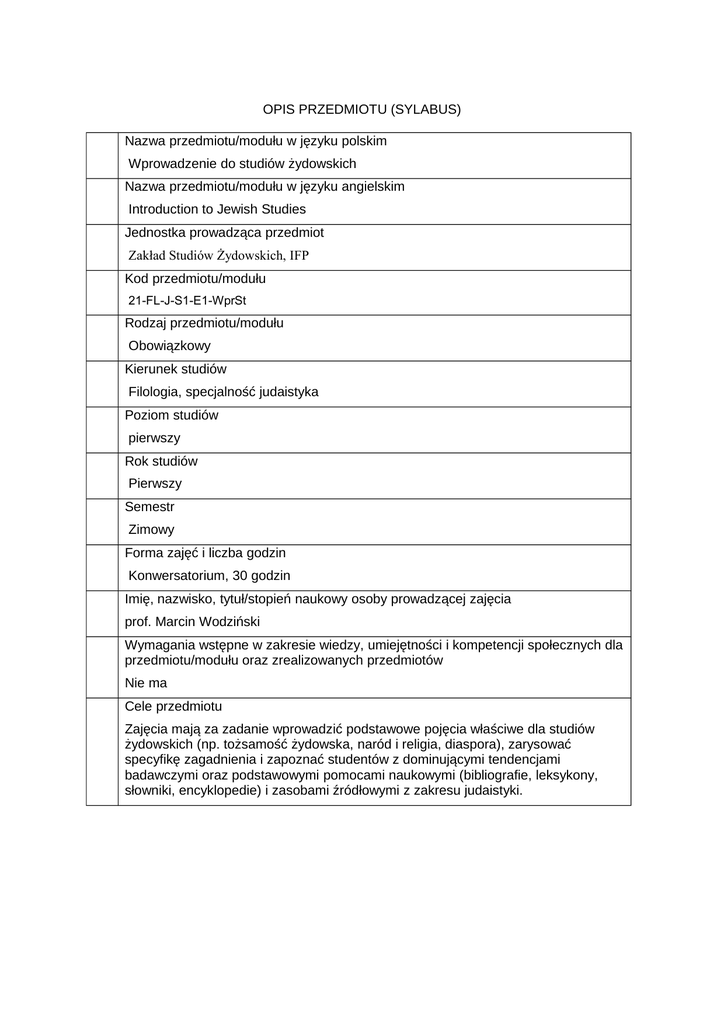 OPIS PRZEDMIOTU (SYLABUS) Nazwa przedmiotu/modułu w języku polskim Wprowadzenie do studiów żydowskich Nazwa przedmiotu/modułu w języku angielskim Introduction to Jewish Studies Jednostka prowadząca przedmiot Zakład Studiów Żydowskich, IFP Kod przedmiotu/modułu 21-FL-J-S1-E1-WprSt Rodzaj przedmiotu/modułu Obowiązkowy Kierunek studiów Filologia, specjalność judaistyka Poziom studiów pierwszy Rok studiów Pierwszy Semestr Zimowy Forma zajęć i liczba godzin Konwersatorium, 30 godzin Imię, nazwisko, tytuł/stopień naukowy osoby prowadzącej zajęcia prof. Marcin Wodziński Wymagania wstępne w zakresie wiedzy, umiejętności i kompetencji społecznych dla przedmiotu/modułu oraz zrealizowanych przedmiotów Nie ma Cele przedmiotu Zajęcia mają za zadanie wprowadzić podstawowe pojęcia właściwe dla studiów żydowskich (np. tożsamość żydowska, naród i religia, diaspora), zarysować specyfikę zagadnienia i zapoznać studentów z dominującymi tendencjami badawczymi oraz podstawowymi pomocami naukowymi (bibliografie, leksykony, słowniki, encyklopedie) i zasobami źródłowymi z zakresu judaistyki. Zakładane efekty kształcenia ma podstawową wiedzę o miejscu i znaczeniu językoznawstwa, literaturoznawstwa i kulturoznawstwa w systemie nauk humanistycznych oraz o związkach judaistyki z tymi dyscyplinami. Ma wiedze o ich specyfice przedmiotowej i metodologicznej judaistyki. Rozumie w podstawowym zakresie powiązania pomiędzy dziedzinami nauki i dyscyplinami naukowym, w szczególności relacje między judaistyką a naukami wykorzystywanymi w badaniach filologicznych oraz w praktyce filologicznej, a także między judaistyką a innymi dyscyplinami, zwłaszcza z dziedziny nauk humanistycznych zna podstawową terminologię z zakresu literaturoznawstwa, językoznawstwa i kulturoznawstwa oraz jej zastosowanie w judaistyce ma wiedzę o źródłach informacji (opracowania encyklopedyczne, syntezy podręcznikowe, studia monograficzne, słowniki) dotyczących języków żydowskich, zwłaszcza hebrajskiego i jidysz, oraz kultury żydowskiej ma podstawową wiedzę o polskich instytucjach kultury związanych z kulturą i dziedzictwem żydowskim oraz szerzej rozumianą wielokulturowością. Ma orientację w życiu kulturalnym w Polsce oraz w społecznościach żydowskich w Polsce i za granicą, zwłaszcza w Izraelu potrafi wyszukiwać, selekcjonować, analizować, oceniać i użytkować wiedzę z zakresu szeroko pojętej judaistyki, w tym zwłaszcza w obszarach literaturoznawstwa, językoznawstwa i kulturoznawstwa z wykorzystaniem różnych źródeł i metod potrafi porozumiewać się ze specjalistami w zakresie pokrewnych dyscyplin humanistycznych, w tym zwłaszcza literaturoznawstwa, językoznawstwa i kulturoznawstwa w studiowanym języku i w języku polskim, wykorzystując różne kanały i techniki komunikacyjne umie odpowiednio określić priorytety służące realizacji zadań; potrafi gospodarować czasem i realizować zadania w wyznaczonych terminach ma świadomość znaczenia zasad etyki zawodowej i uczciwości intelektualnej w działaniach własnych i innych osób; postępuje zgodnie z tymi zasadami ma świadomość różnic kulturowych i związanych z tym wyzwań, potrafi w praktyce stosować wiedzę o mechanizmach komunikacji interkulturowej jest świadomy współodpowiedzialności za zachowanie dziedzictwa kulturowego Polski i dziedzictwa kultury żydowskiej, zwłaszcza w Polsce, ale również poza nią w Europie i świecie Symbole KRK: K-W01 K-W02 K-W03 K-W11 K-U01 K-U08 K-K03 K-K04 K-K06 K-K08 Treści programowe Geneza i rozwój studiów żydowskich na świecie: przyczyny zainteresowania tematyką żydowską; czynniki kształtujące historię studiów żydowskich. Dzieje studiów żydowskich: haskala, Wissenschaft des Judentums, Graetz, Dubnow, Mahler, szkoła jerozolimska, studia żydowskie a tożsamość żydowska. Historia studiów żydowskich w Polsce do holokaustu (nieprofesjonalne początki naukowej judaistyki w XIX wieku, Biblioteka Judaistyczna w Warszawie; Instytut Nauk Judaistycznych w Warszawie; Jidisze Wisnszaftlecher Institut – JIWO; Mojżesz Schorr, Ignacy Schiper, Majer Bałaban, Junger Historiker). Ośrodki studiów nad historią i kulturą żydowską we współczesnej Polsce i ośrodki studiów nad historią i kulturą polskich Żydów we współczesnym świecie. Kto jest Żydem? Odpowiedzi religijne, biologiczne, narodowe i kulturowe: Hebrajczycy, Żydzi, żydzi, Izraelici, Izraelczycy. Kontekst miejsca i czasu. Pojęcia: halacha, konwersja, prozelita Historiografia żydowska: główne pojęcia, główne problemy. Ponowoczesność. Współczesne kierunki studiów żydowskich; postmodernizm: rozwój studiów żydowskich przejawem postmodernizmu? Ponowoczesność a holokaust, dekonstrukcja a badania nad literaturą rabiniczną; feminizm i gender. Kultura żydowska czy kultury żydowskie? Podstawowe grupy kulturowe świata żydowskiego: Samarytanie, karaimi, sefardyjczycy, aszkenazyjczycy, proces dyferencjacji i podstawowe cechy charakterystyczne; główne ośrodki cywilizacji żydowskiej i ich periodyzacja, mit złotego wieku. Żydzi polscy. Historyczne uwarunkowania tożsamości żydowskiej w Polsce (diaspora, syjonizm, alija). Stereotyp Żyda (pojęcia: antyjudaizm, antysemityzm, antysyjonizm, żydokomuna). Antysemityzm: szczególna forma stereotypu czy zbrodnia przeciw ludzkości? Historia zjawiska, jego korzenie, podstawowe implikacje i konteksty społeczne. Kalendarz żydowski i jego znaczenie dla żydowskiej liturgii: nazwy miesięcy i dni tygodnia, rok liturgiczny, rok przestępny, adar II, miesiące male i haser. Zapis i odczytywanie daty w systemie żydowskim. Ćwiczenia praktyczne. Źródła i zasoby archiwalne. Podstawowe pomoce archiwalne i edycje źródeł, najważniejsze zbiory źródeł do dziejów Żydów w Polsce. Bibliografie i inne pomoce bibliograficzne: Od Sabataja Bassa do RAMBI. Współczesne bibliografie internetowe – p