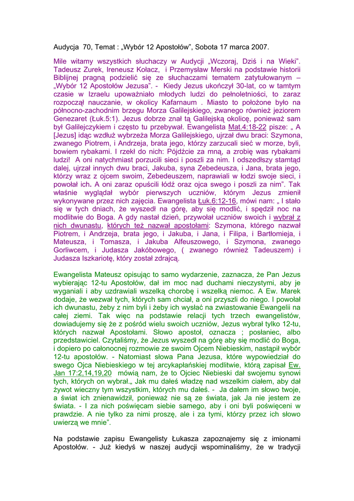 Audycja 70, Temat : „Wybór 12 Apostołów”, Sobota 17 marca 2007