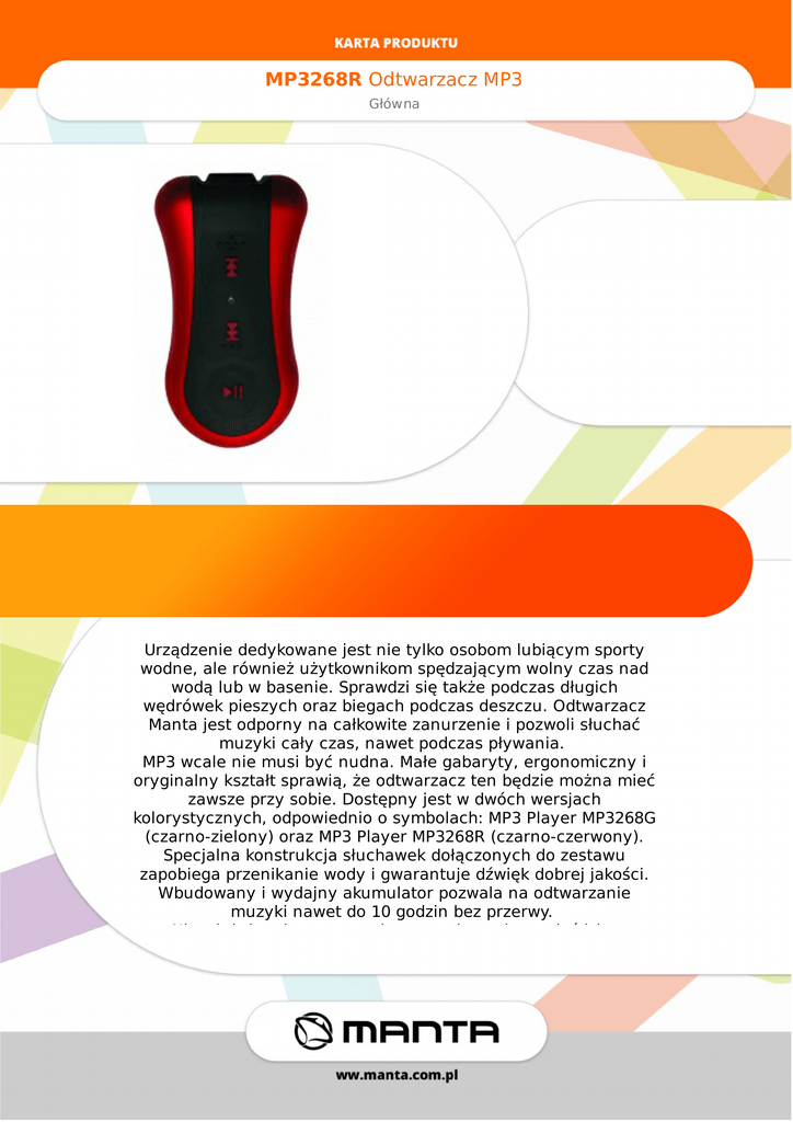 MP3268ROdtwarzaczMP3 Główna Urządzeniededykowanejestnietylkoosobomlubiącymsporty wodne,alerównieżużytkownikomspędzającymwolnyczasnad wodąlubwbasenie.Sprawdzisiętakżepodczasdługich wędrówekpieszychorazbiegachpodczasdeszczu.Odtwarzacz Mantajestodpornynacałkowitezanurzenieipozwolisłuchać muzykicałyczas,nawetpodczaspływania. MP3wcaleniemusibyćnudna.Małegabaryty,ergonomicznyi oryginalnykształtsprawią,żeodtwarzacztenbędziemożnamieć zawszeprzysobie.Dostępnyjestwdwóchwersjach kolorystycznych,odpowiednioosymbolach:MP3PlayerMP3268G (czarno-zielony)orazMP3PlayerMP3268R(czarno-czerwony). Specjalnakonstrukcjasłuchawekdołączonychdozestawu zapobiegaprzenikaniewodyigwarantujedźwiękdobrejjakości. Wbudowanyiwydajnyakumulatorpozwalanaodtwarzanie muzykinawetdo10godzinbezprzerwy. Niezależnieodtego,czypływaszwbasenieczyjeździsz MP3268ROdtwarzaczMP3 Główna Specyfikacja Zasilanie DC5Vwbudowanyakumulator Waga 18g Wyposażenie słuchawki,przewódUSB Bluetooth Nie Gniazdokartpamięci Nie Pojemnośćakumulatora 160mAh RadioFM Nie Wyświetlacz Nie Dodatkowefunkcje podłączeniebezpośredniodoUSB Pamięćwbudowana 8GB Wymiary 60.5x33x22.5 Dyktafon Nie Cechyszczególne WodoodpornośćIPX8 Obsługiwaneformatyplikówmuzycznych MP3,WMA Odtwarzaneformatywideo Nie Odtwarzaniezdjęć Nie http://www.manta.com.pl/pl/mp3268r EAN:5907377866329
